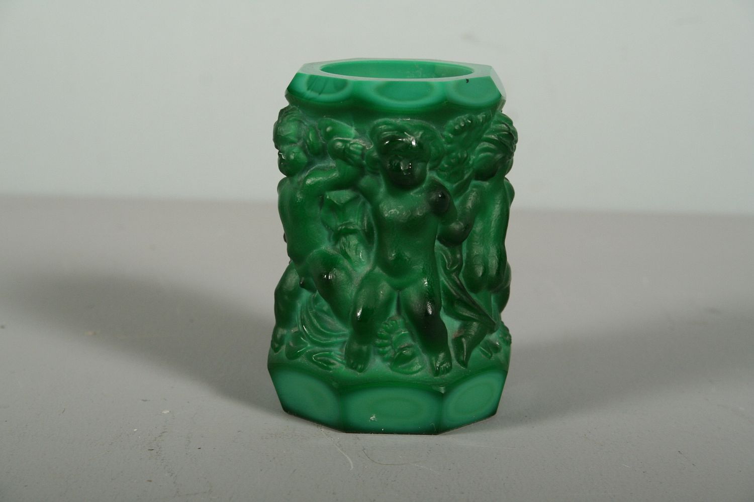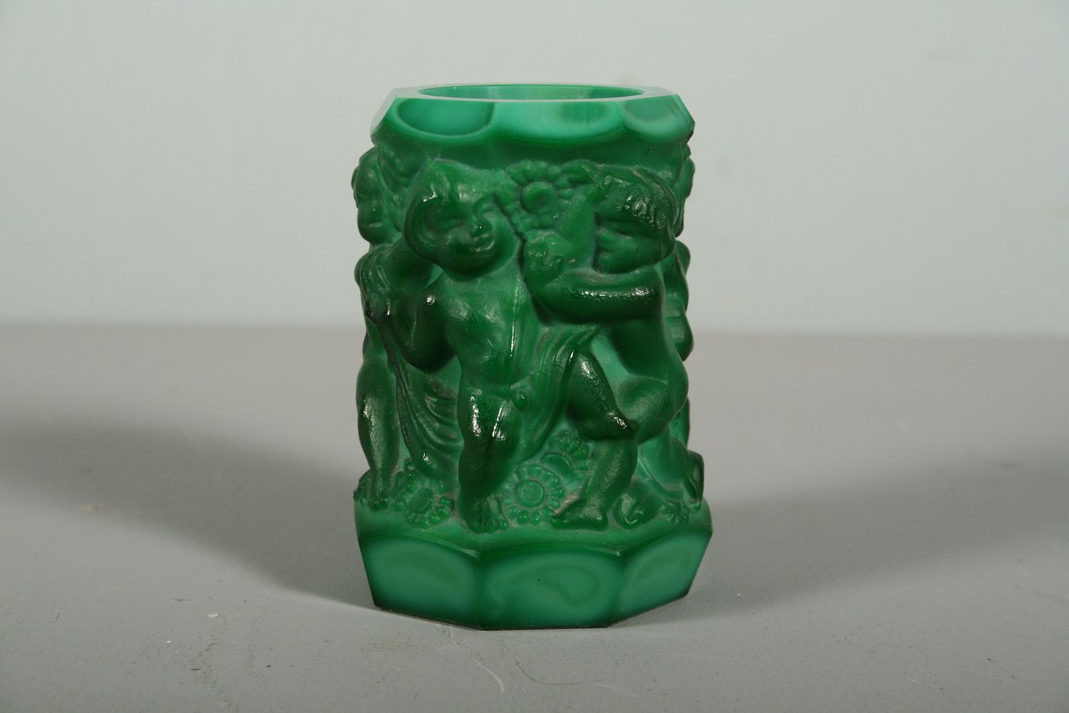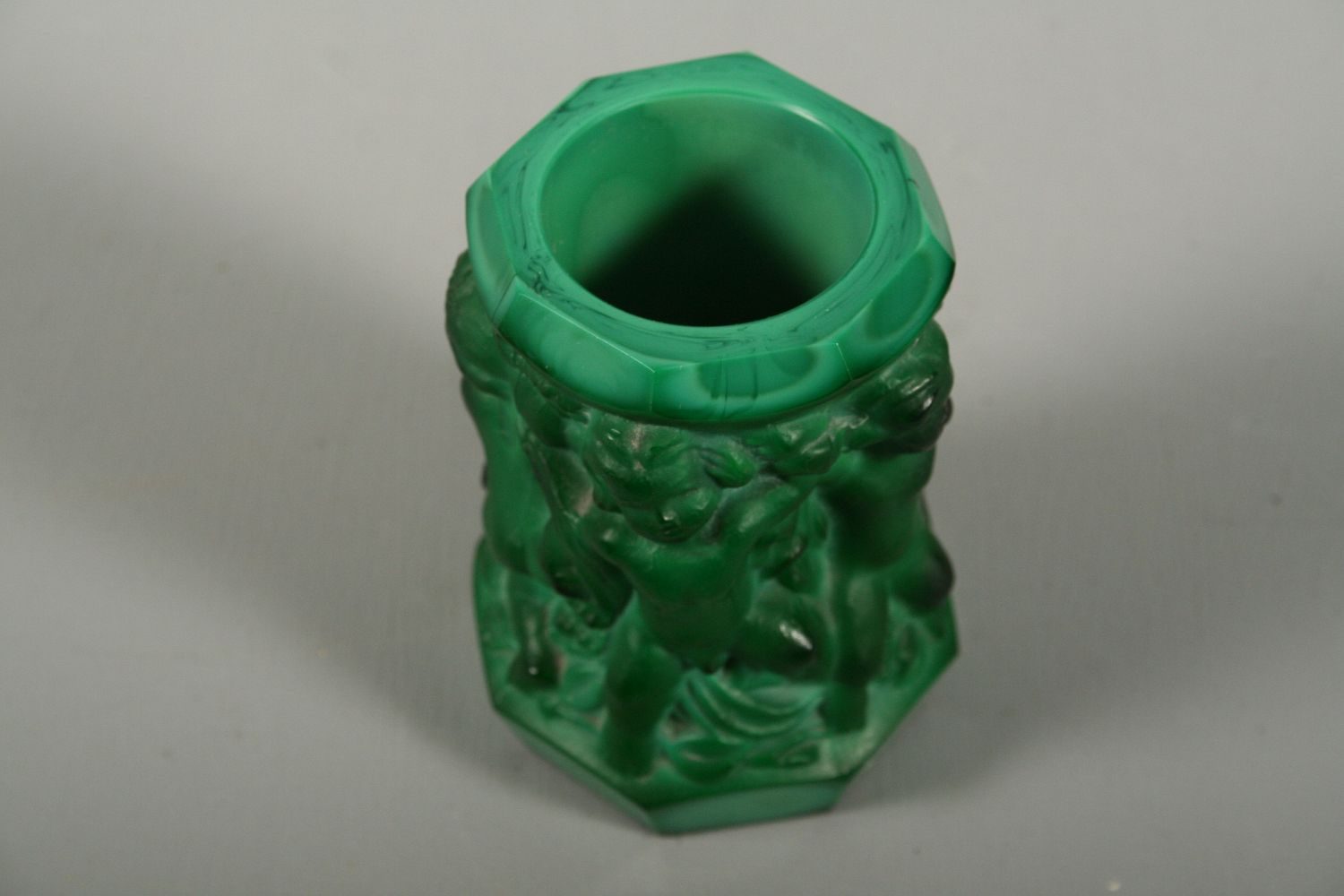 figurální vázička s motivem bakchanálie ve stylu art deco, lisované a broušené malachitové sklo, neznačené, produkce firmy Curt Schlevogt Jablonec nad Nisou, 1. polovina 20. století, 9 cm