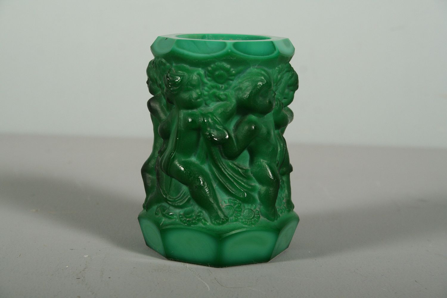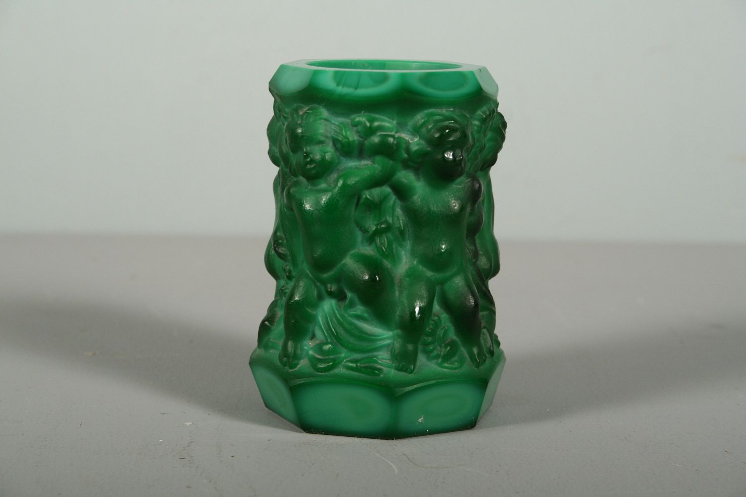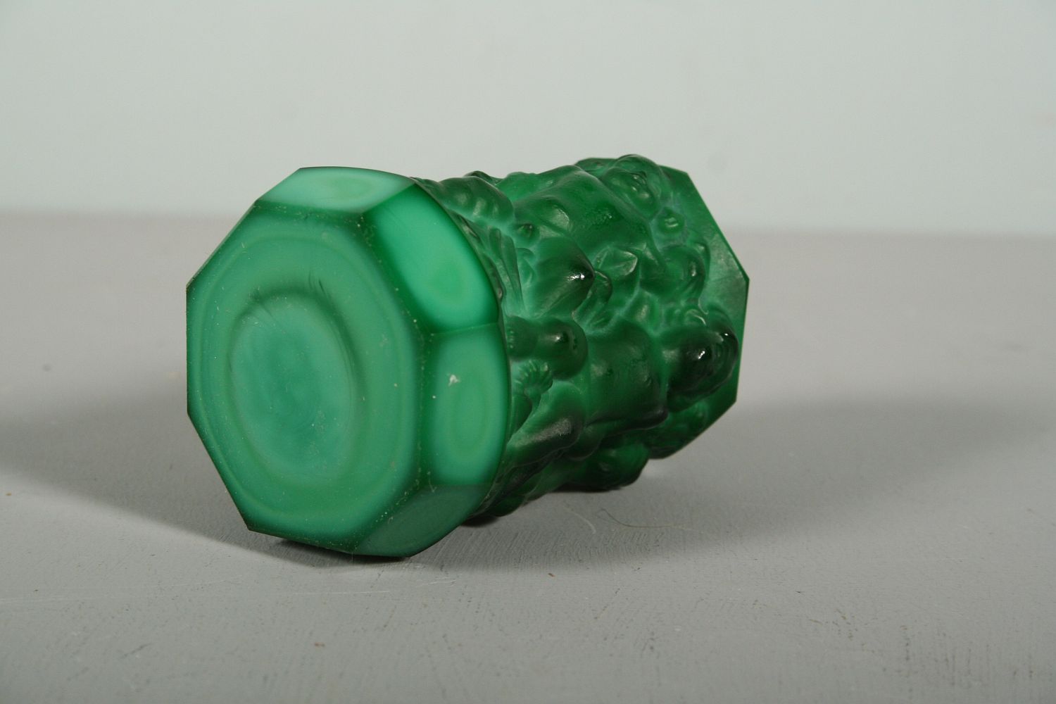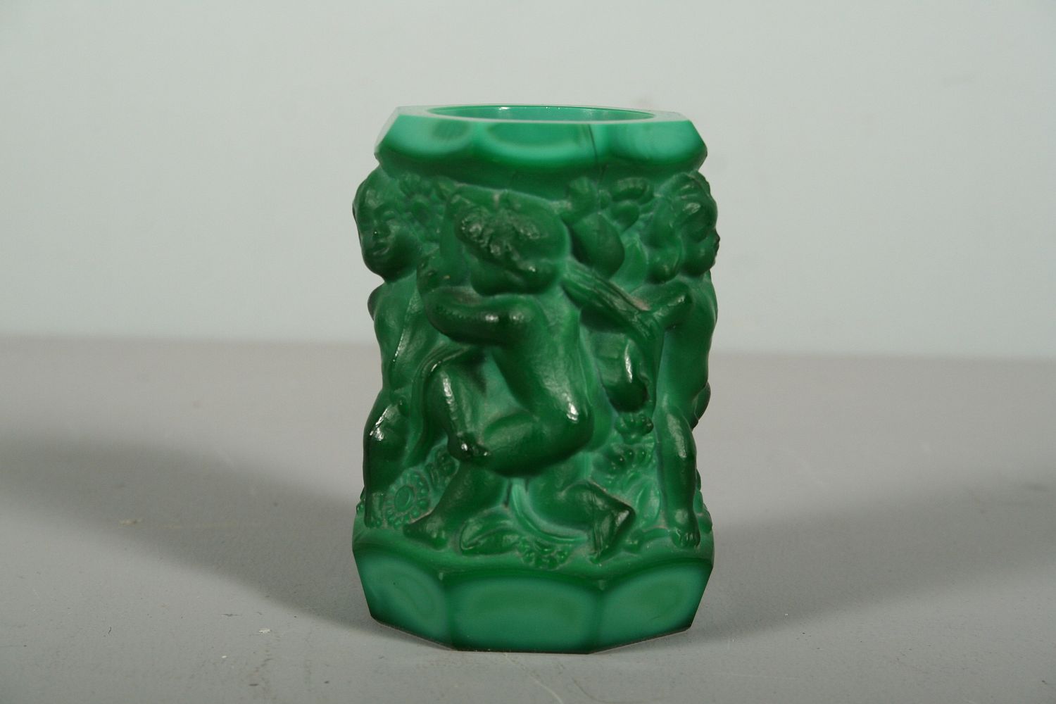 figurální vázička s motivem bakchanálie ve stylu art deco, lisované a broušené malachitové sklo, neznačené, produkce firmy Curt Schlevogt Jablonec nad Nisou, 1. polovina 20. století, 9 cm