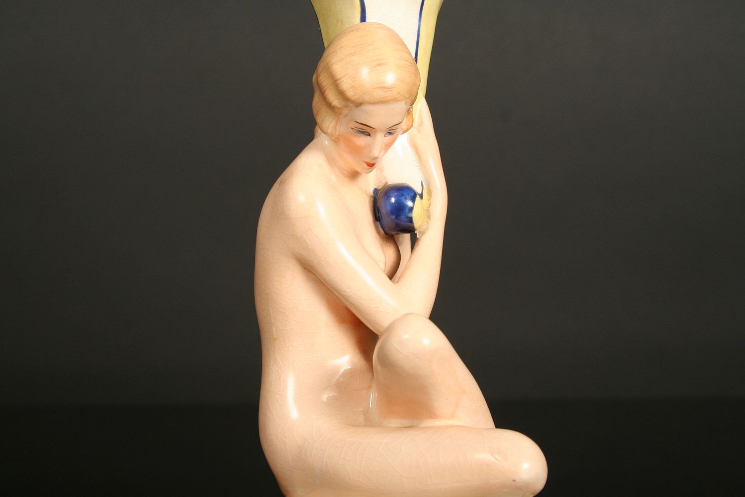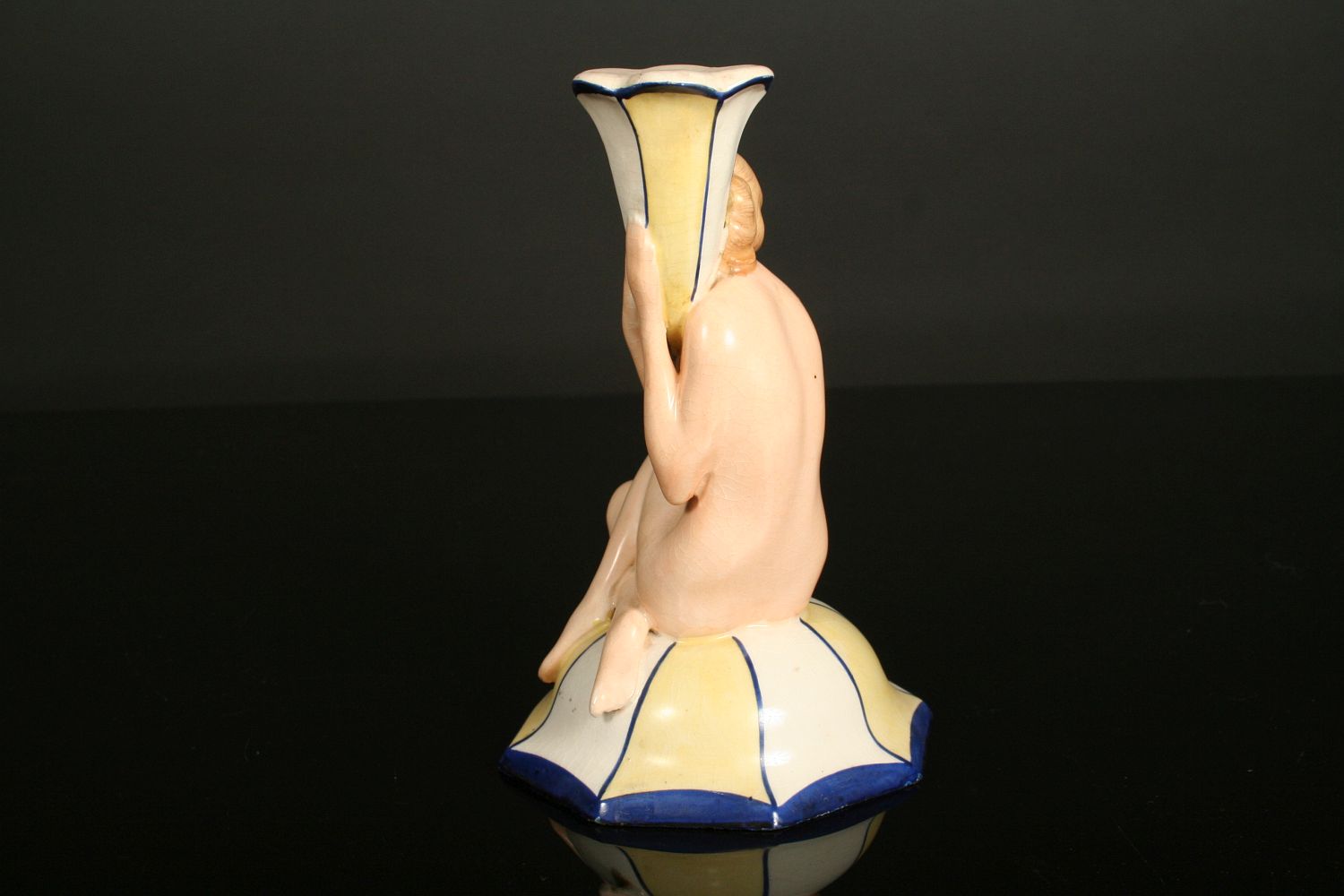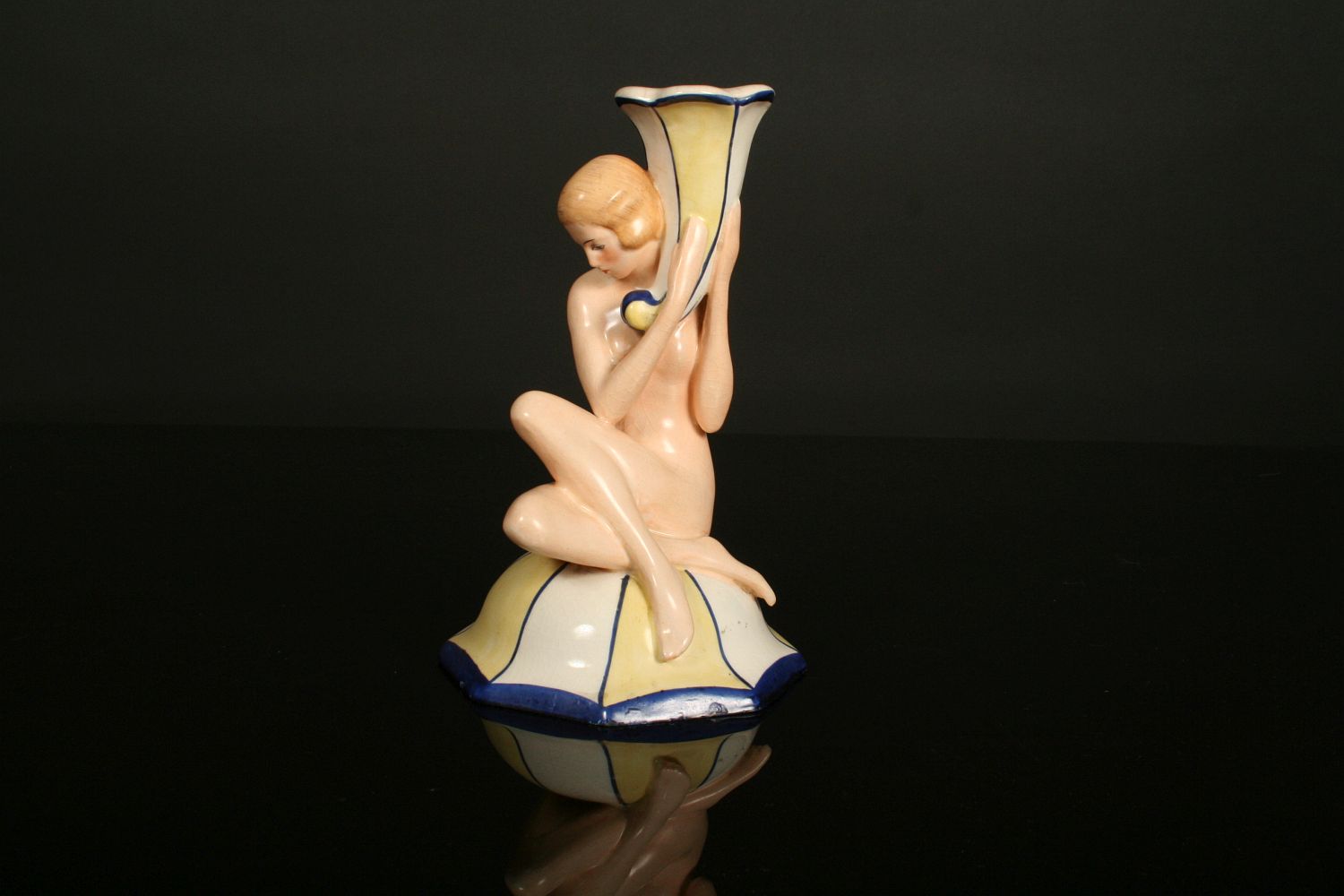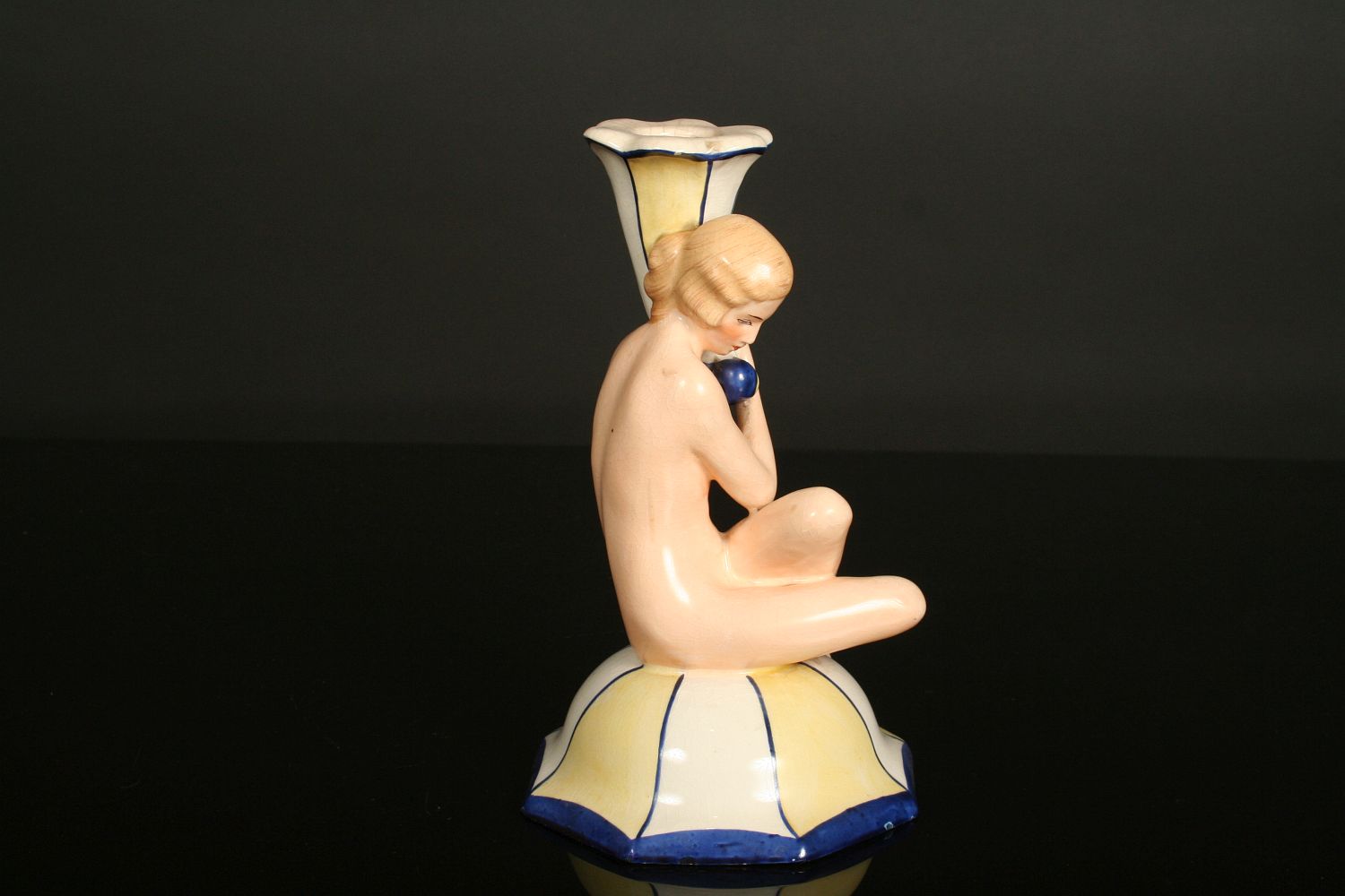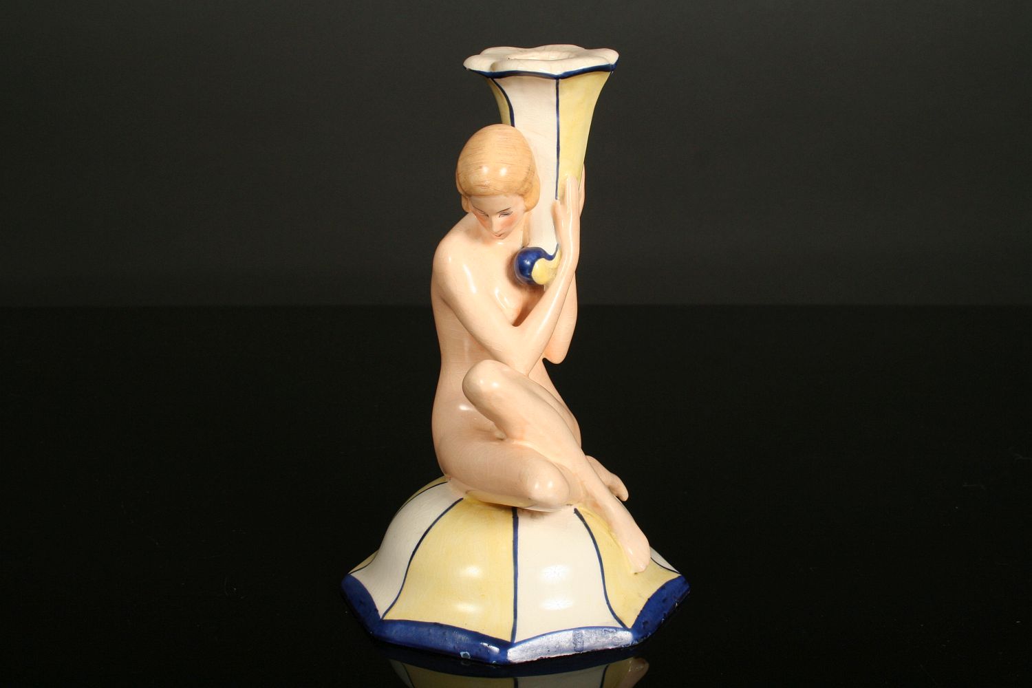 sedící dívčí akt držící svícen ve tvaru rohu hojnosti, malovaná a glasovaná keramika, provedení art deco, značeno na dně zeleným razítkem Royal DUX Deutschland, 19 cm
