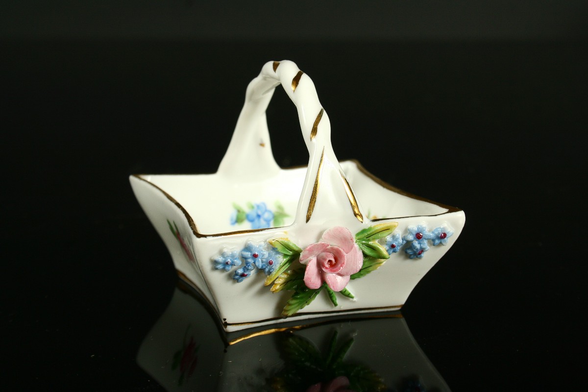porcelánový košíček s květy a uchem, malovaný bílý porcelán s plastickými nálepy tvaru květin a zlacenými detaily, značeno tištěnou značkou Drážďany, 5 x 5,5 cm