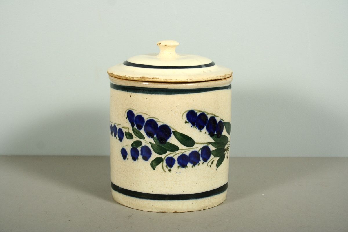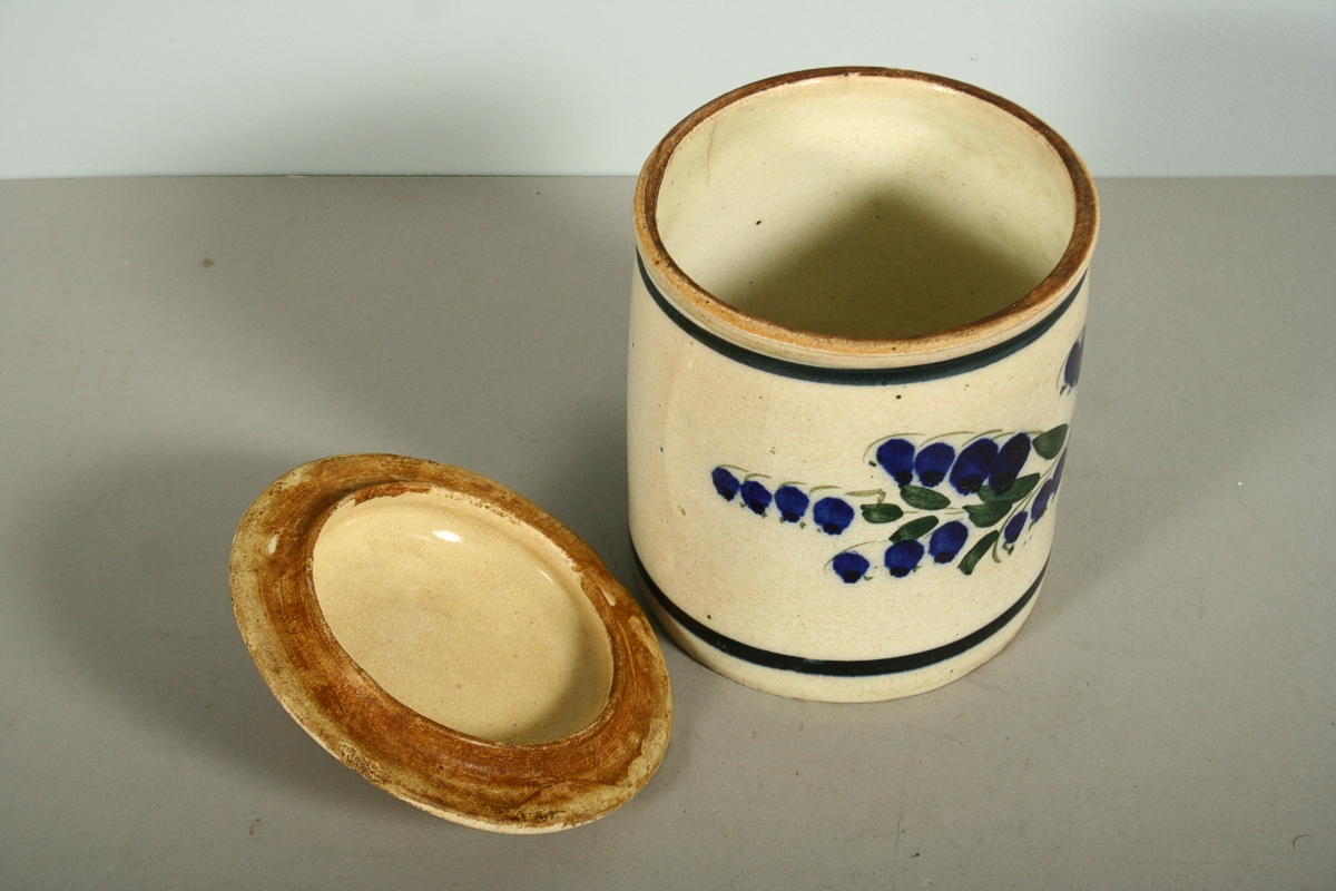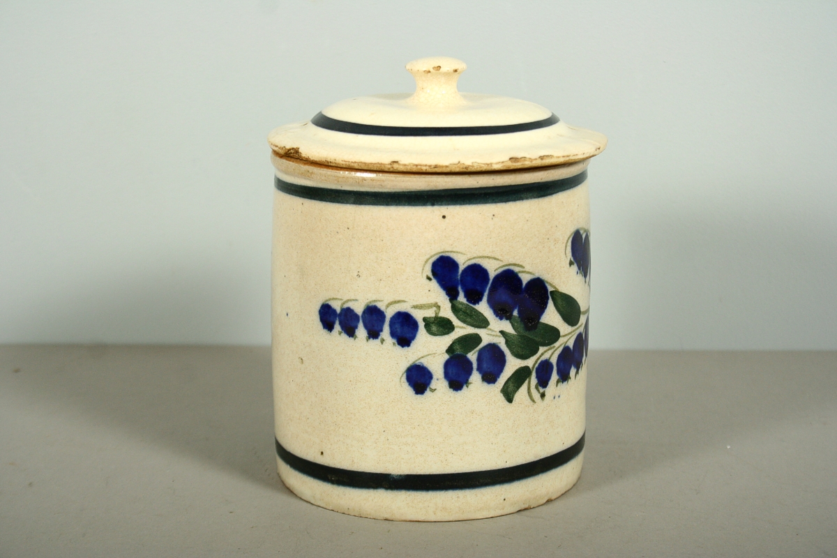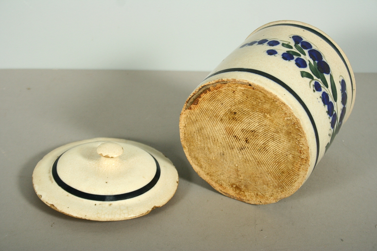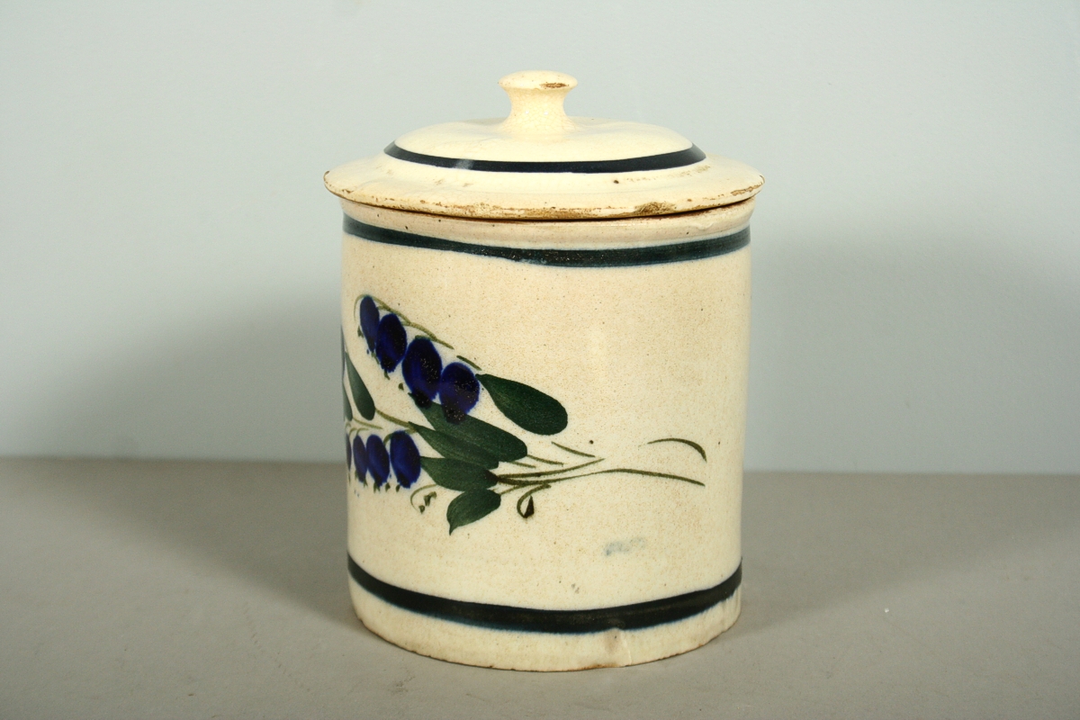 dóza s víkem zdobená zelenou linkou a malovaným dekorem fialek, lidová kamenina z konce 19. století, 15,5 x 12,5 cm