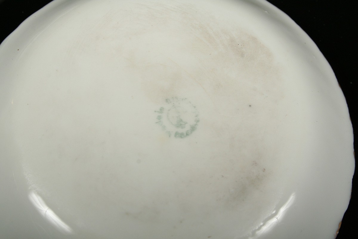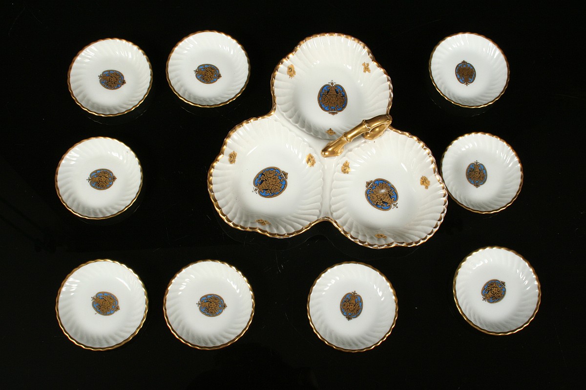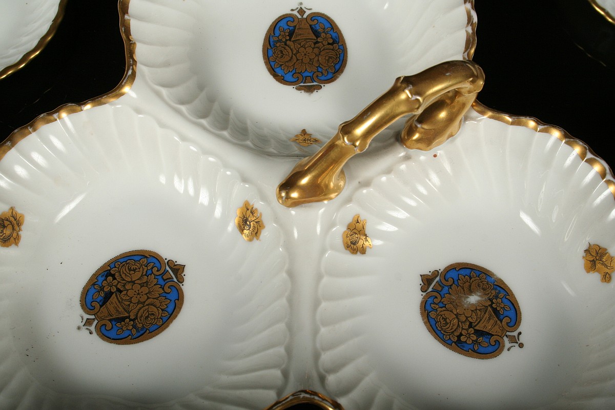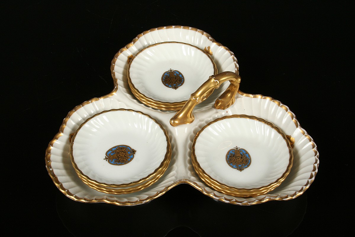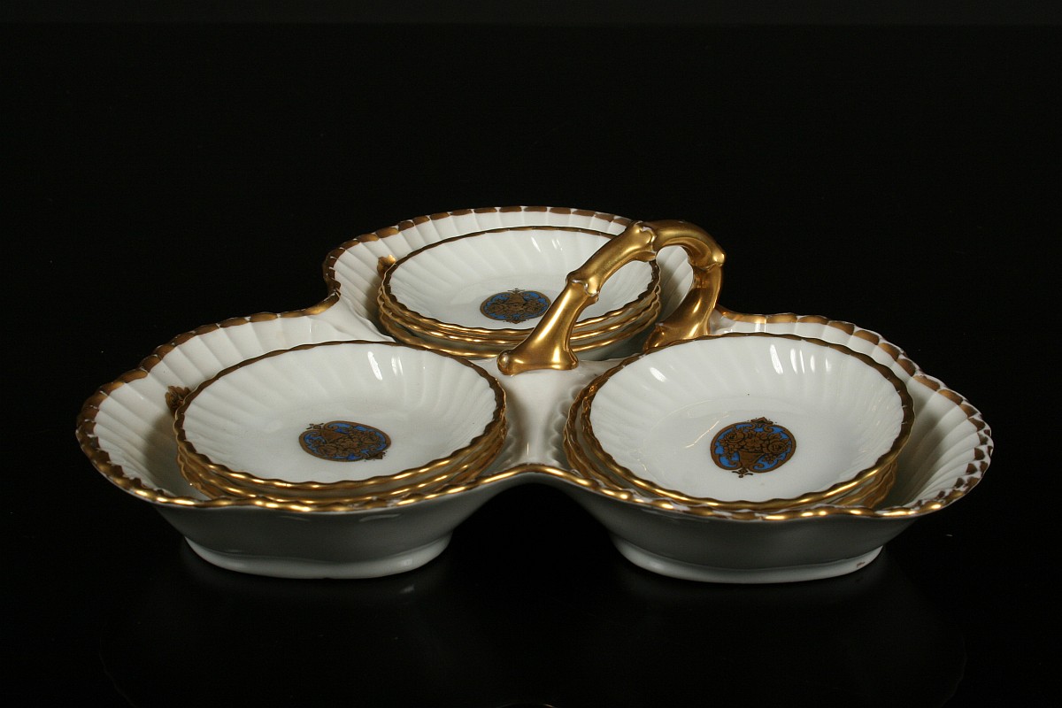 desertní souprava na oříšky, nebo cukrovinky, větší miska s ouškem na přenášení, 20 x 20 cm a devět malých mističek 7,5 cm, po obvodu tvarované a zlacené, značeno na dně nečitelně