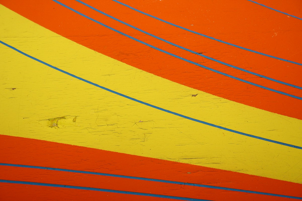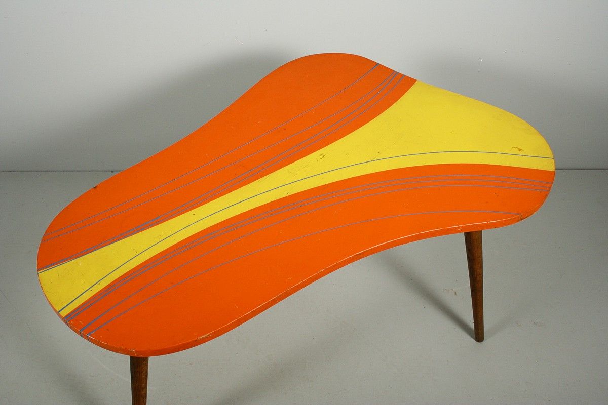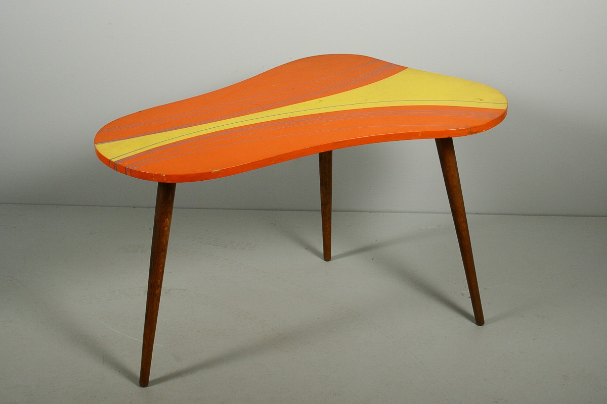 velmi výrazný dřevěný stolek na třech nožkách s deskou nepravidelného organického tvaru v atraktivních původních barvách, 60. léta 20. století, 59 x 94 x 64 cm
