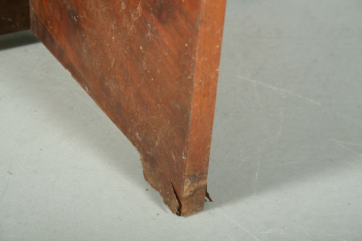 hraněný stůl s poličkami, skládaná ořechová dýha, funkcionalismus, 20 - 30. léta 20. století, původní stav, v dolní části lehce odfouklá dýha, 72 x 75 x 75 cm