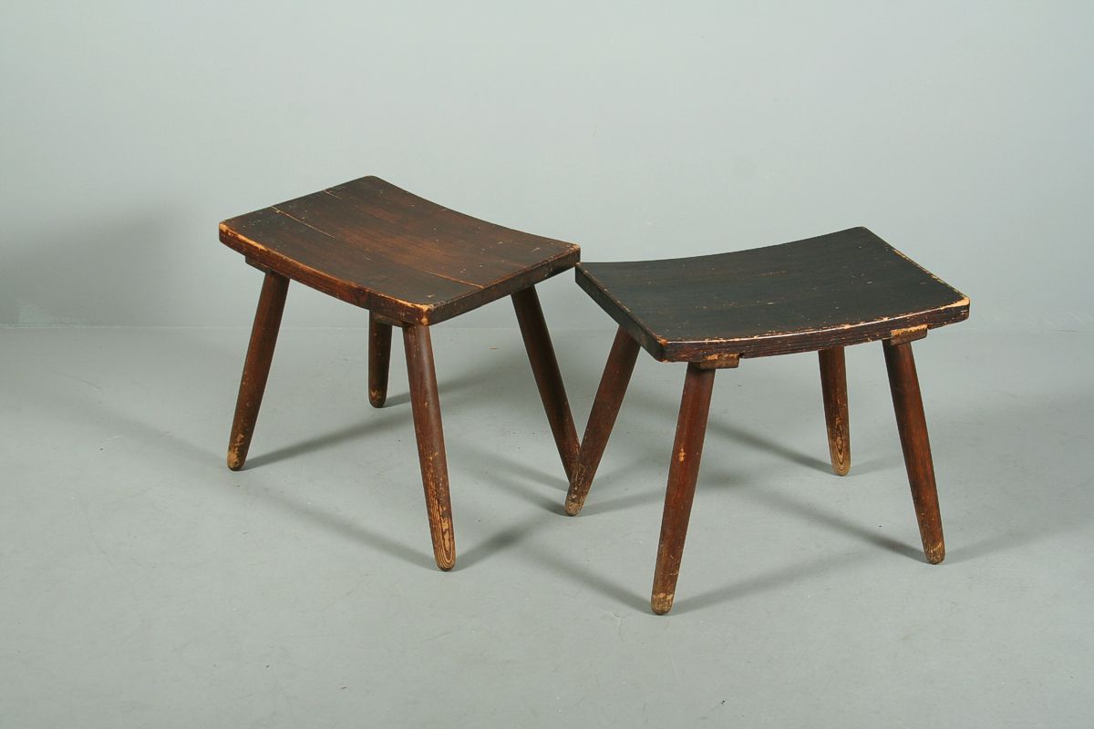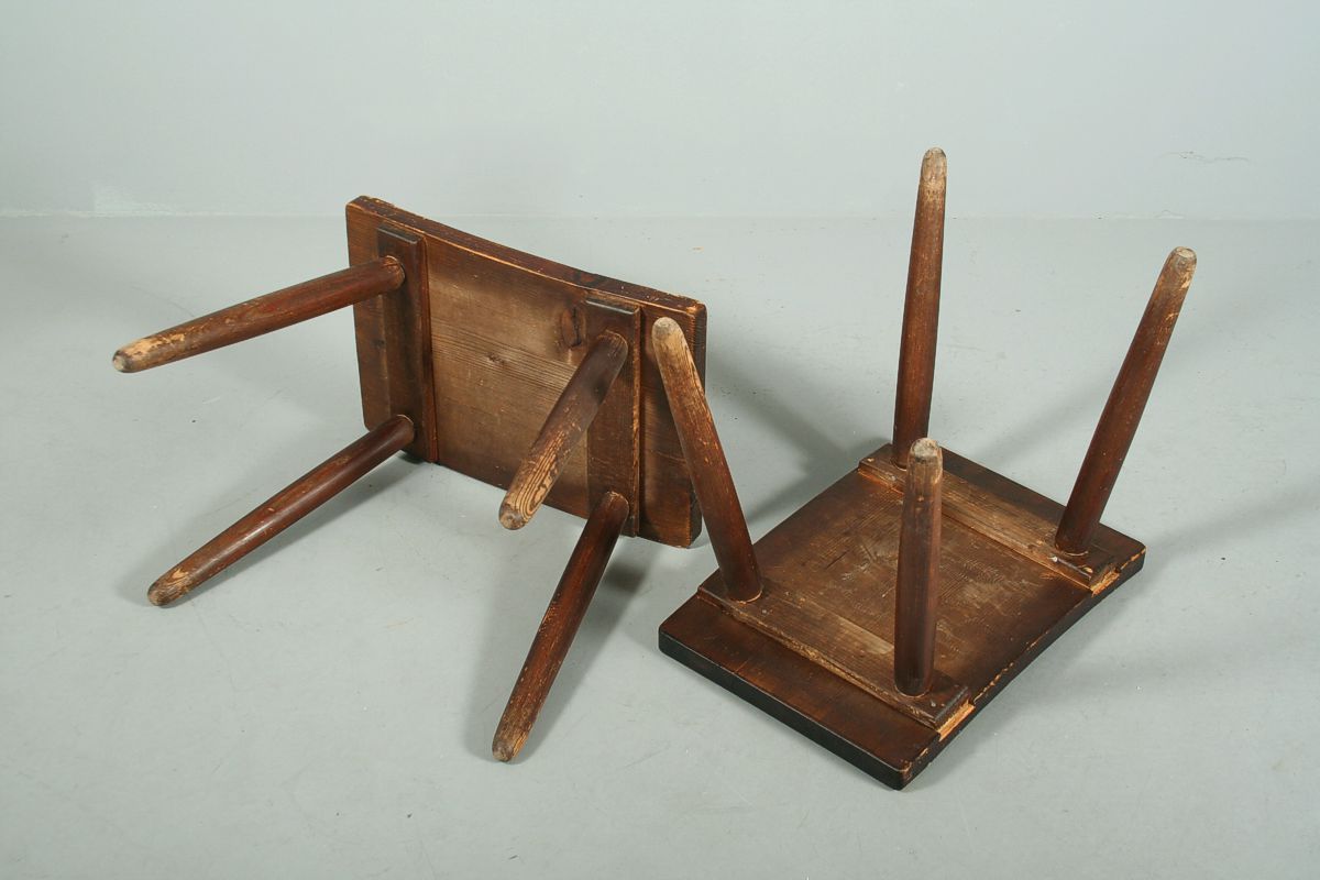 dvě stoličky ze smrkového mořeného dřeva s projmutým sedákem na čtyřech vyhnutých nožkách, původní stav, 41 x 46 x 32 cm
