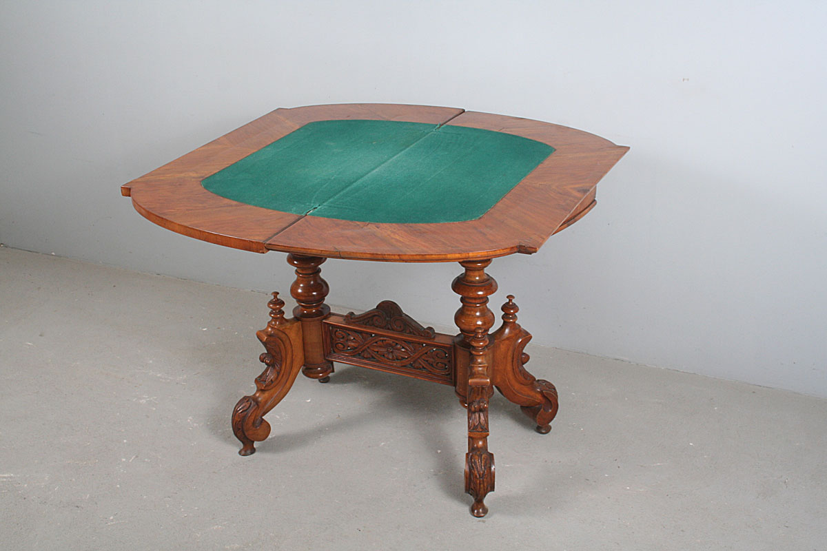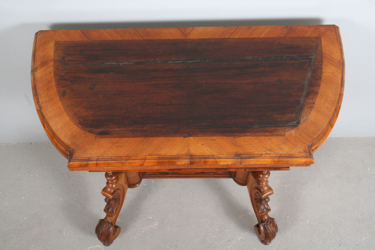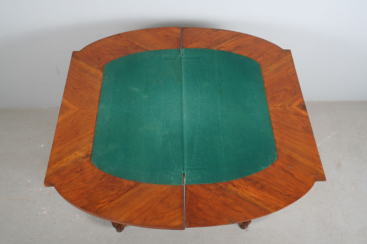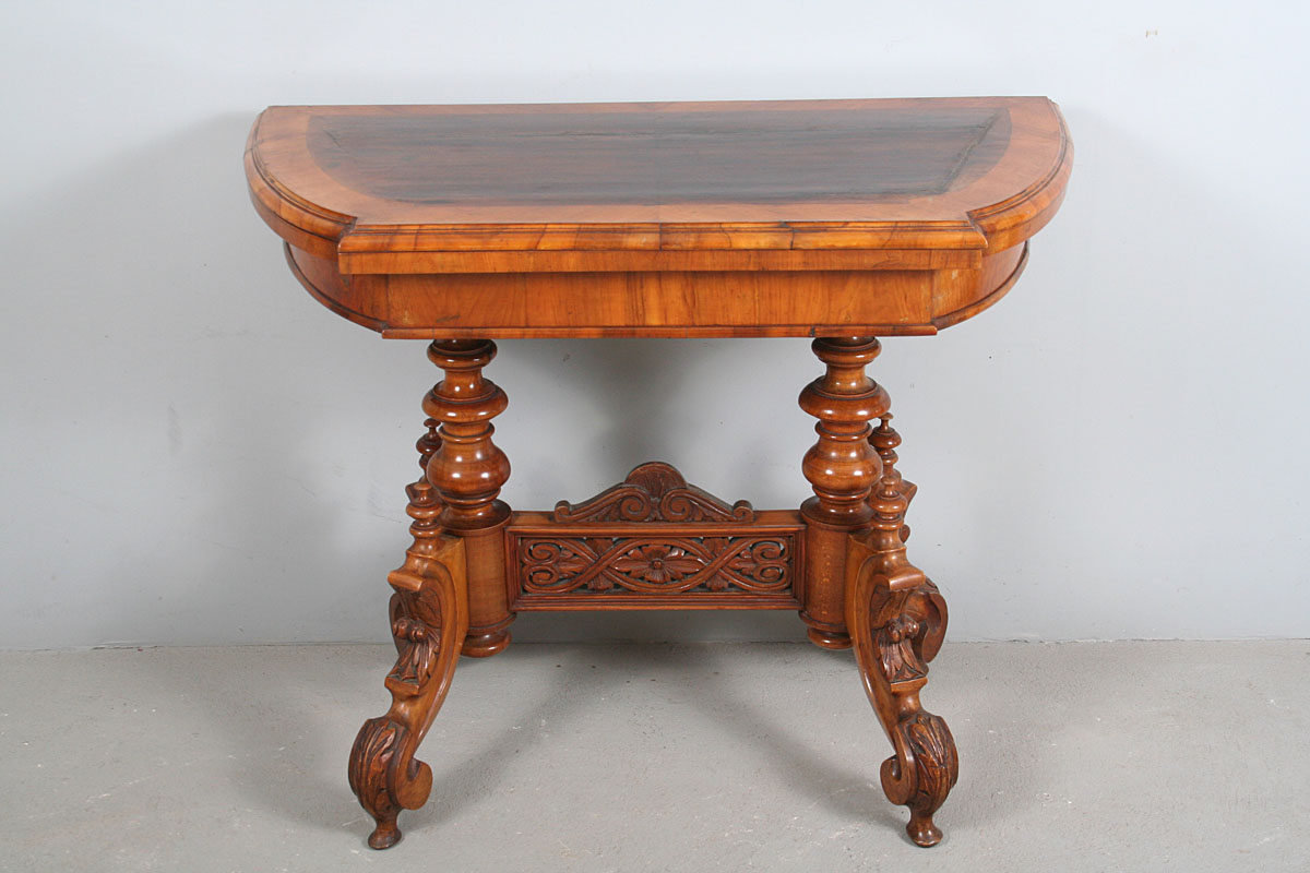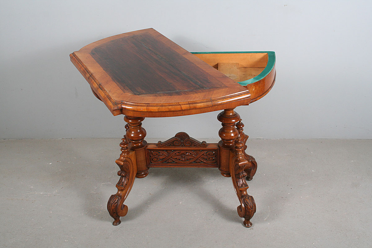 konzolový hrací stolek v pseudobarokním stylu, ořechová dýha a masiv, 80. léta 19. soletí, bohatě vyřezávané nohy, rozkládací deska se zeleným plátnem uvnitř, pod deskou úložný prostor na hry, 79 x 99 x 49 cm, po rozložení plocha 98 x 99 cm