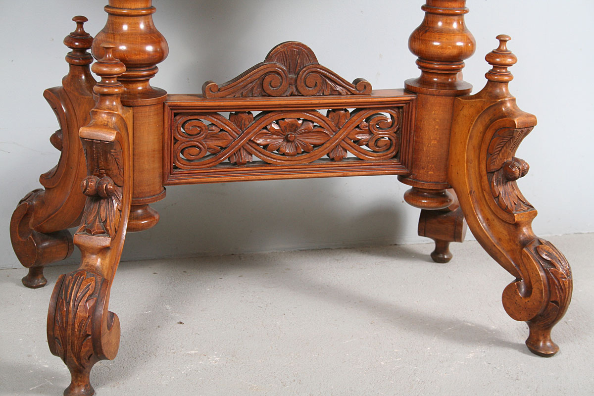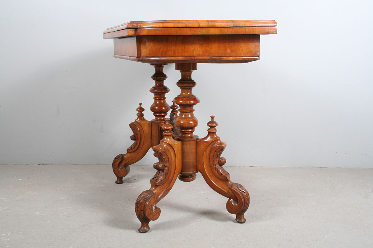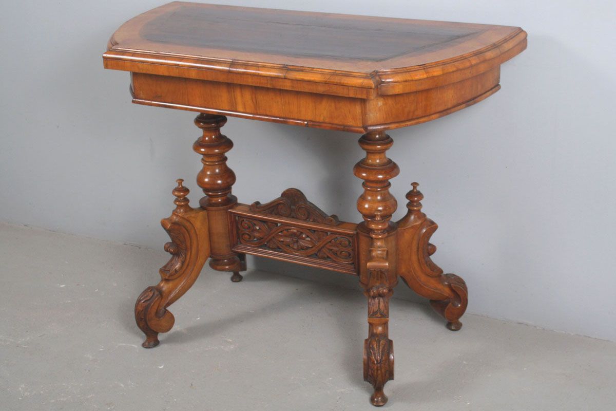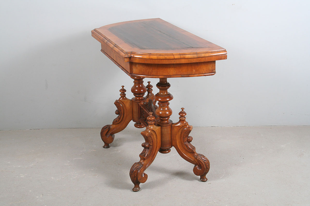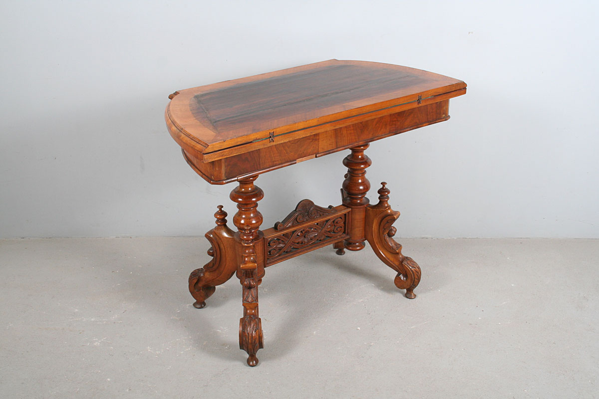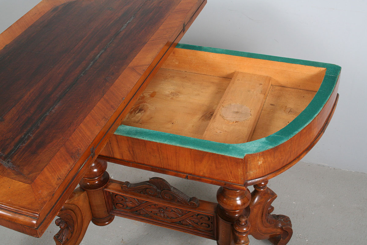 konzolový hrací stolek v pseudobarokním stylu, ořechová dýha a masiv, 80. léta 19. soletí, bohatě vyřezávané nohy, rozkládací deska se zeleným plátnem uvnitř, pod deskou úložný prostor na hry, 79 x 99 x 49 cm, po rozložení plocha 98 x 99 cm