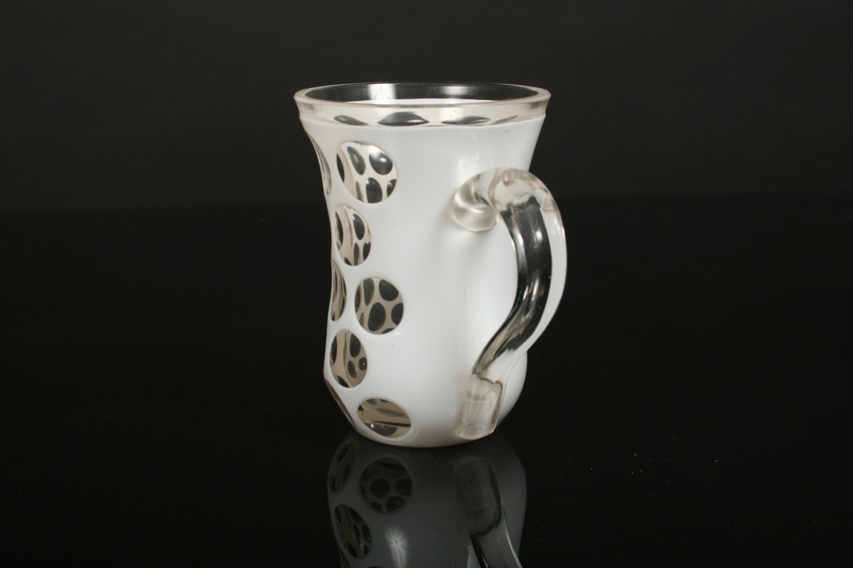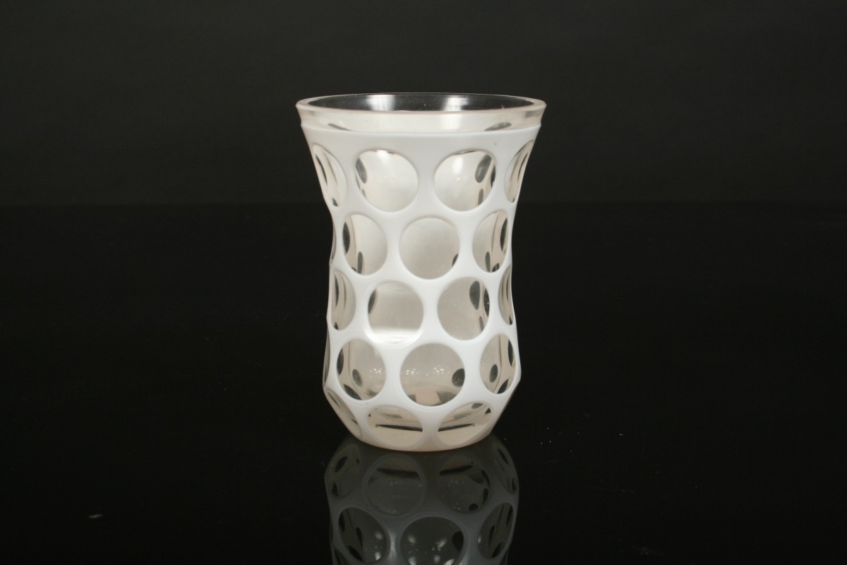 sklenice nebo pohárek s ouškem z čirého skla přejímaného bílým opaktním sklem po obvodu probroušené pravidelné kruhové medailony, ouško jednoduše broušené do faset, 2. polovina 19. století, 11 cm