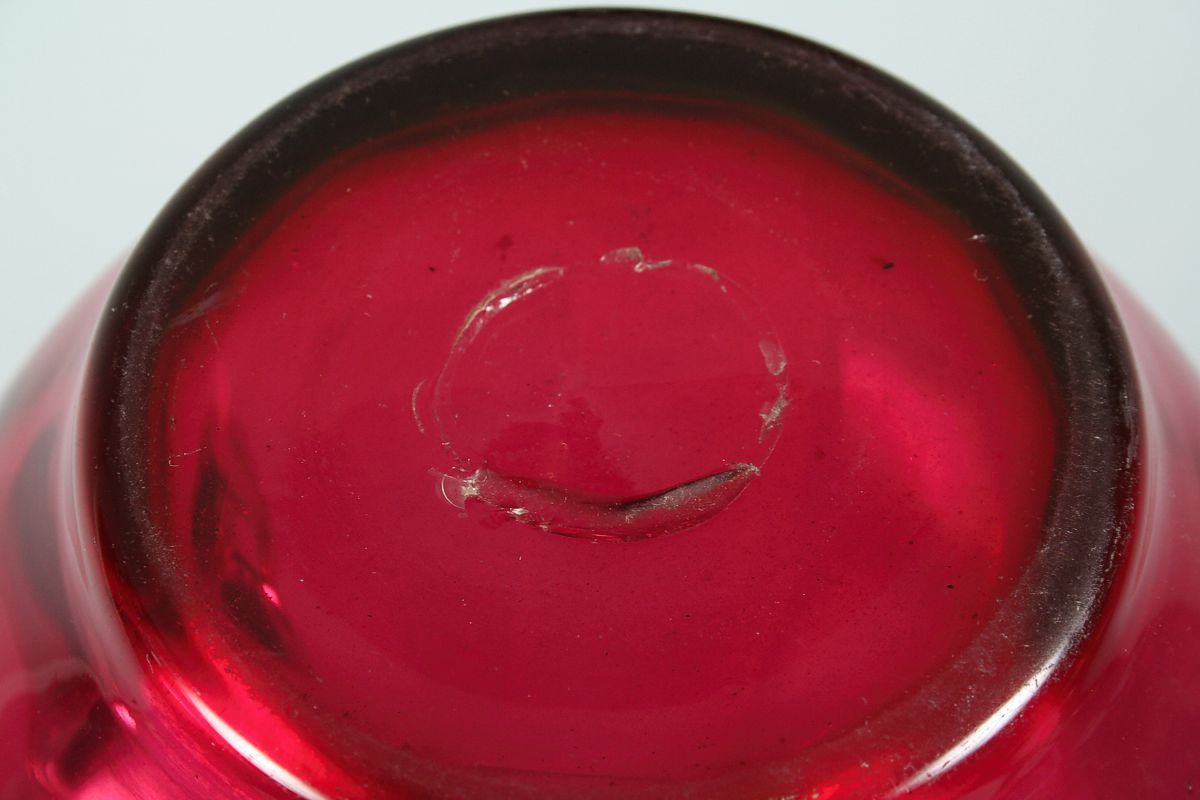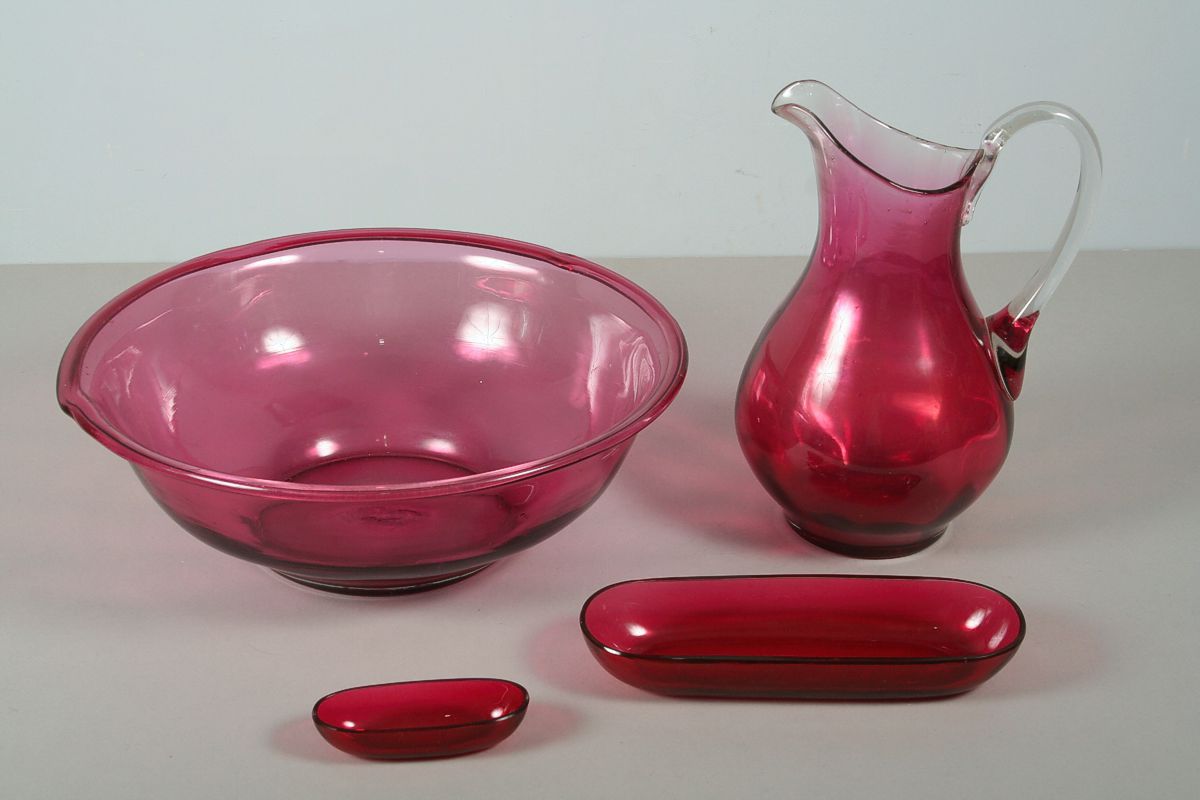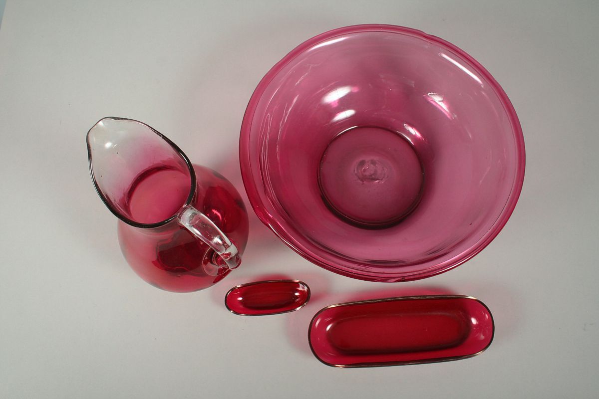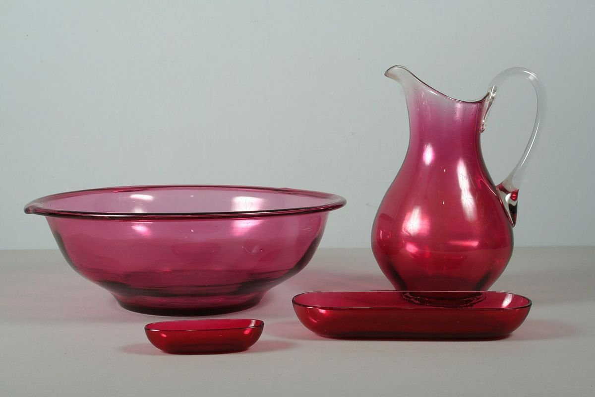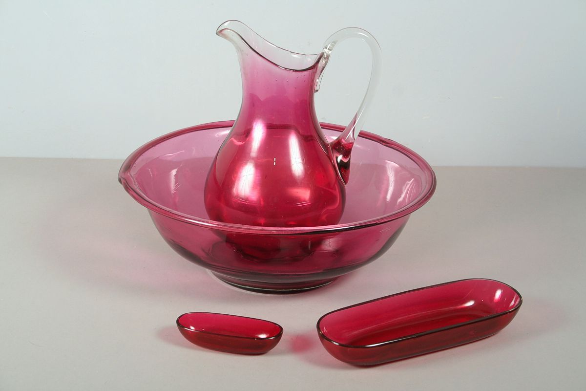 skleněná mycí souprava z druhé poloviny 19. století, severní Čechy, patrně Harachov, transparentní narůžovělé sklo, džbán s uchem 28 cm, velké umyvadlo 12 x 36 cm, miska 4 x 25 x 9 cm, mistička 3 x 11 x 5 cm, bez jakýchkoli poškození