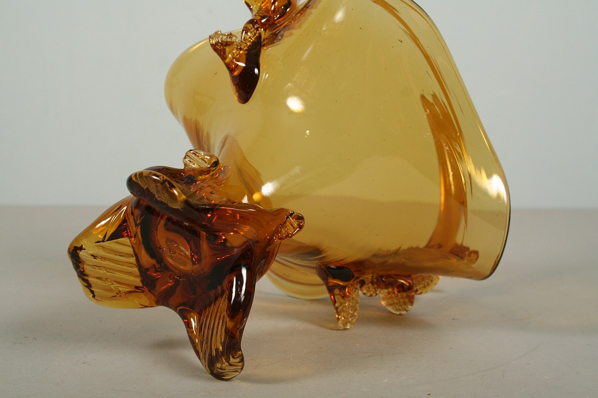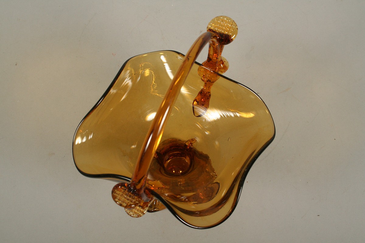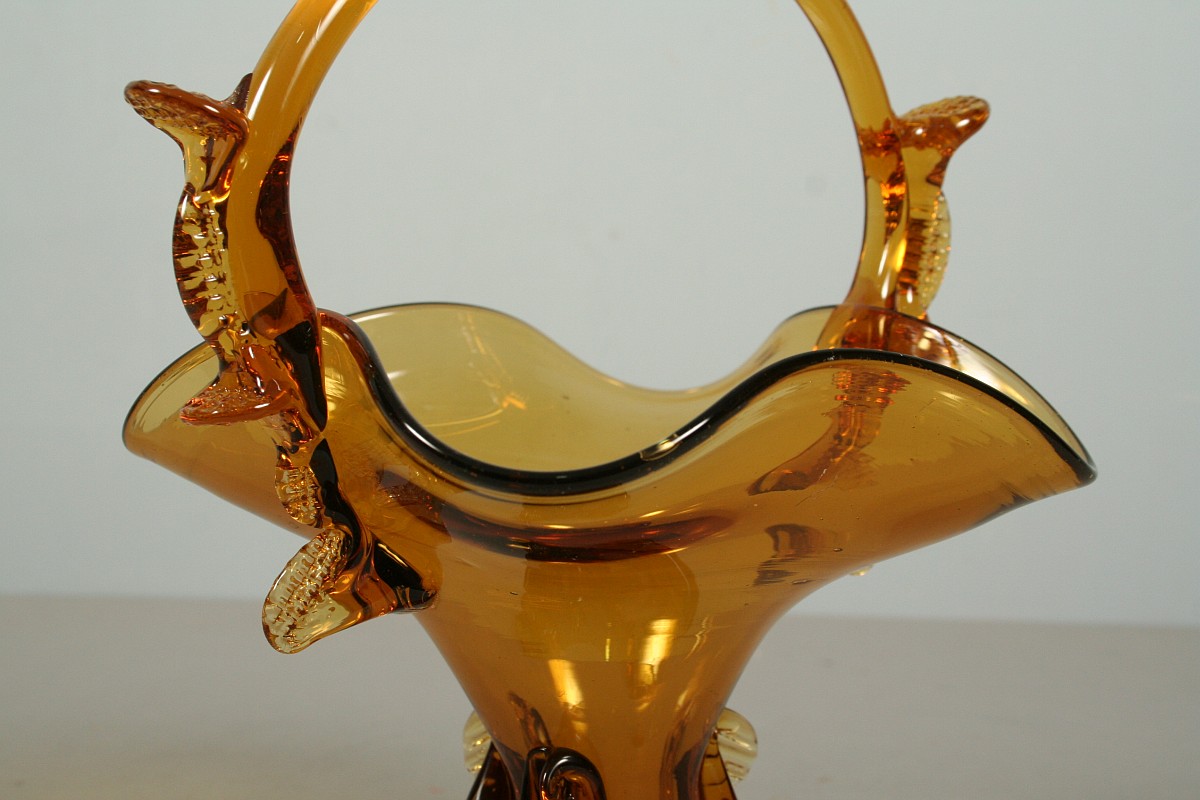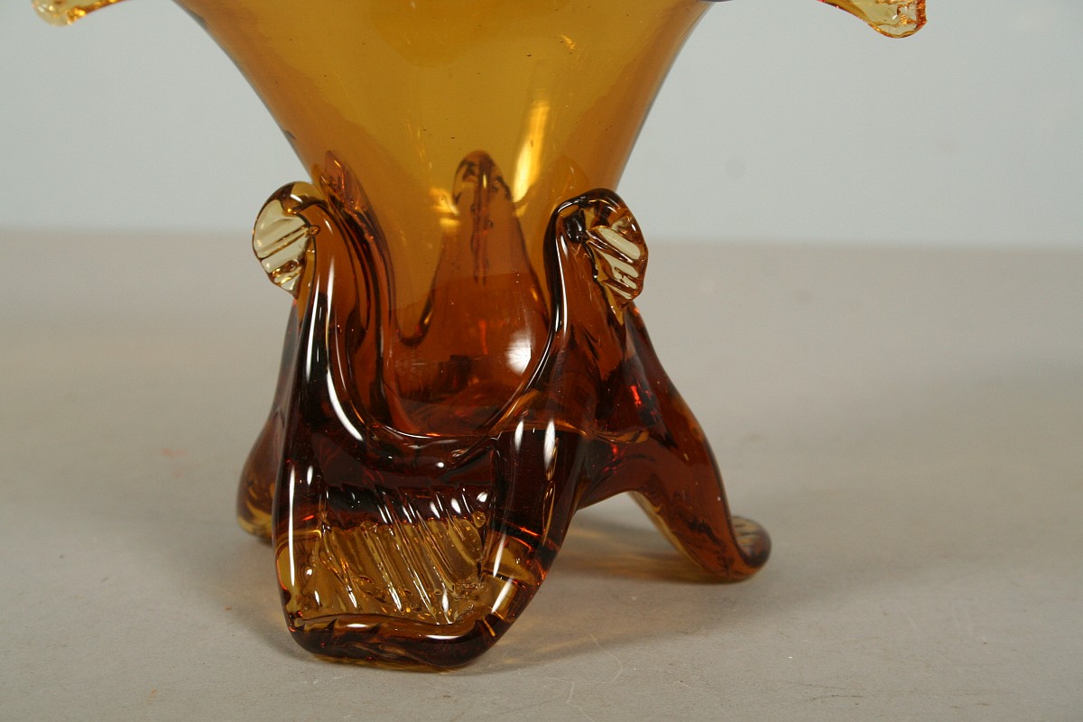 skleněný košík s plastickými nálepy, čiré medové sklo, na třech tažených nožkách po obvodu zvlněný, skvostná sklářská práce z počátku 20. století, 26 x 21 cm