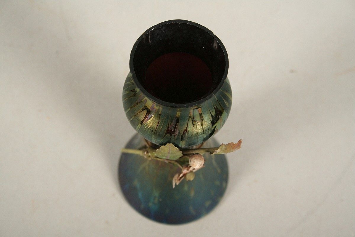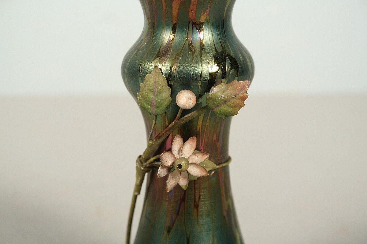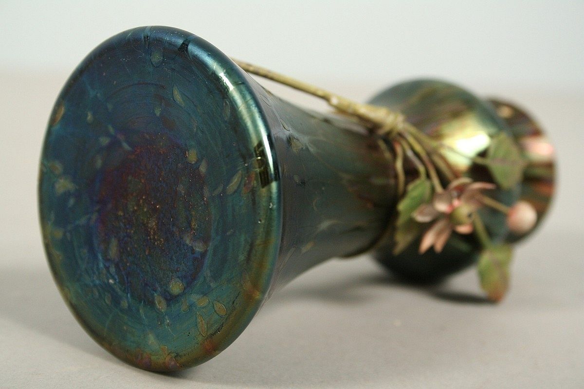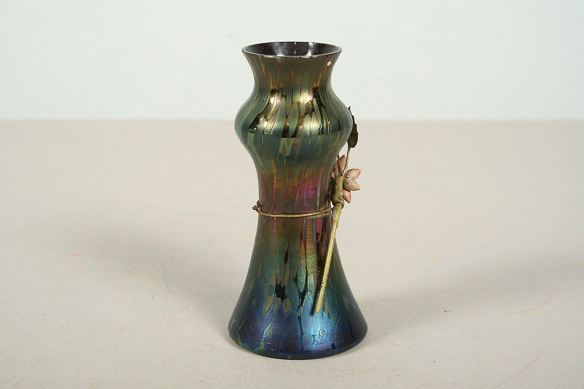 secesní skleněná vázička s kovovou montáží kvítků, temné sklo s irisujícím povrchem, 1. polovina 20. století, 13 cm