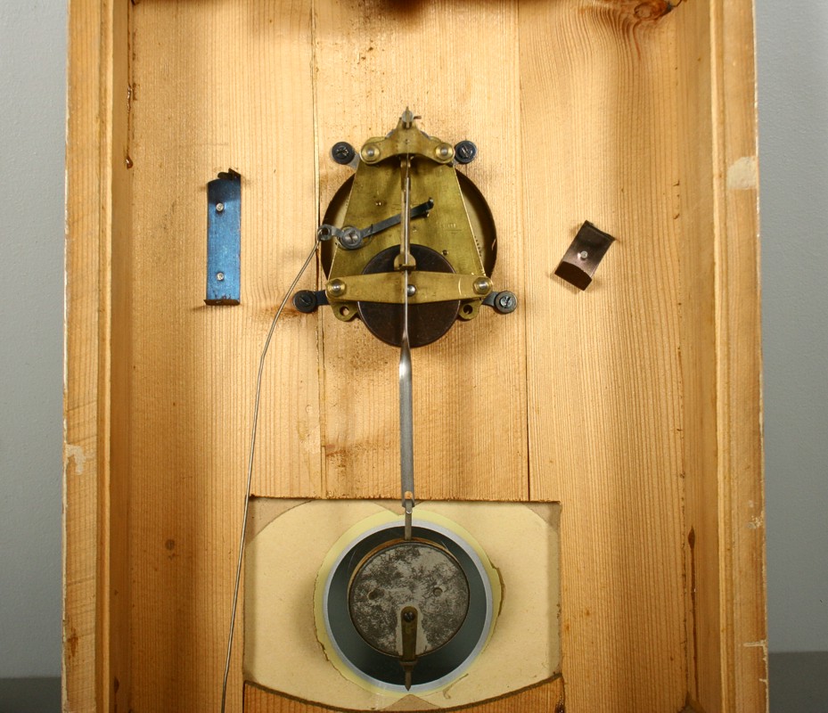 závěsné hodiny v dřevěné skříňce, skleněný ciferník, značeno KIENZLE, pochromované prvky, moderní vzhled 1. třetiny 20.století, stroj značený Kienzle, funkční s klíčkem, 33 x 24,5 cm