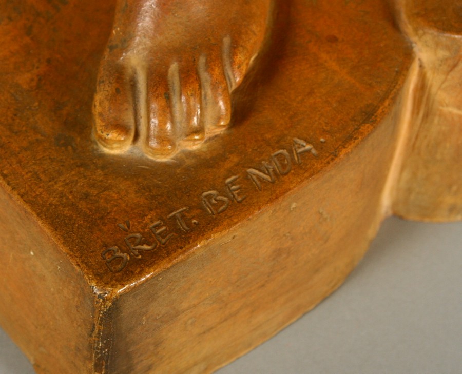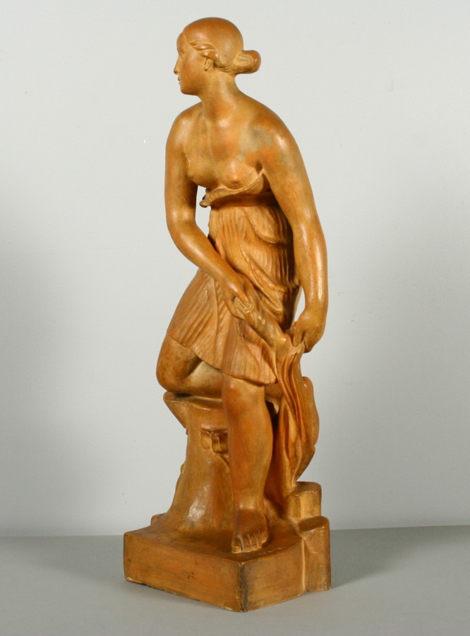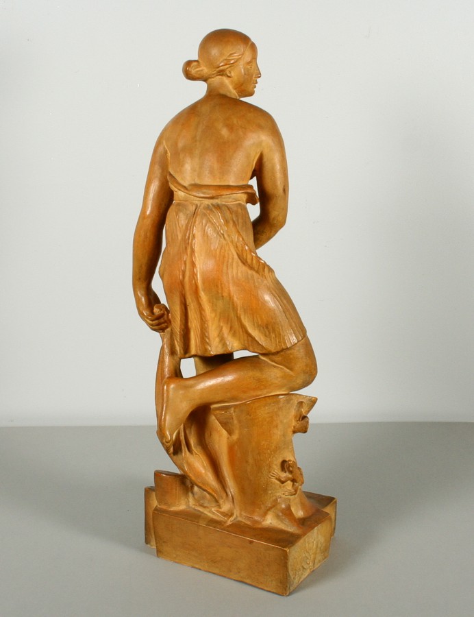 polooděná dívka klečící pravou nohou na kmenu s ještěrkou s dynamickým pohybem těla, pálená hlína, 50 x 18 x 13 cm, podepsáno na soklu plastiky