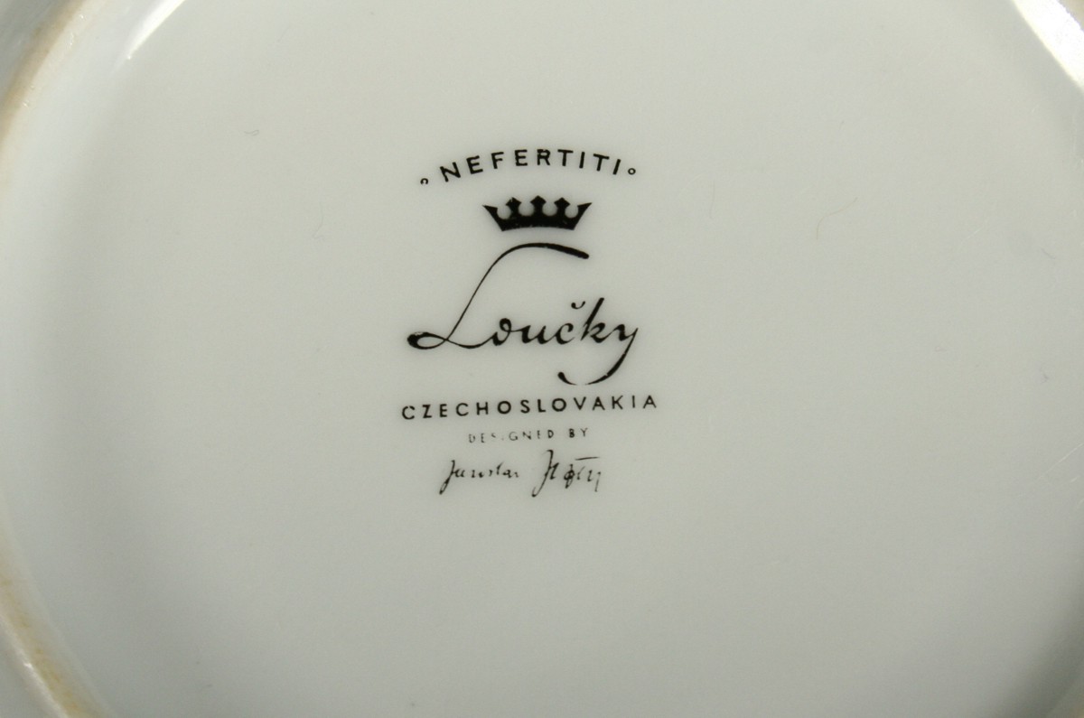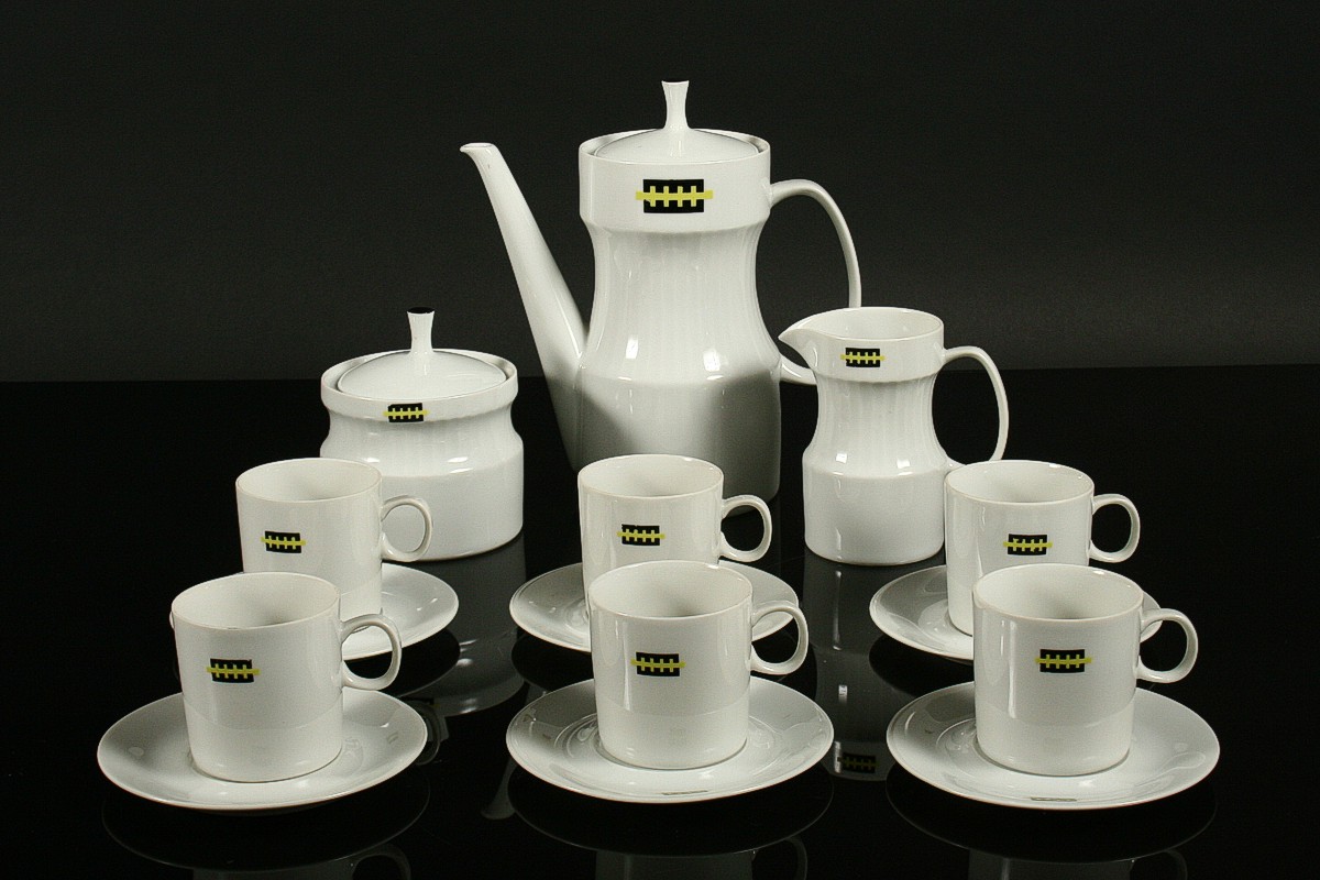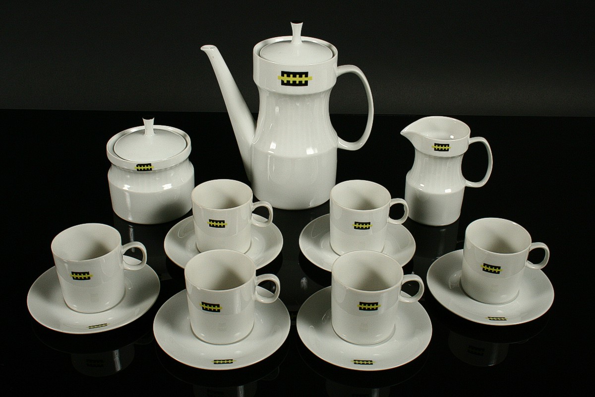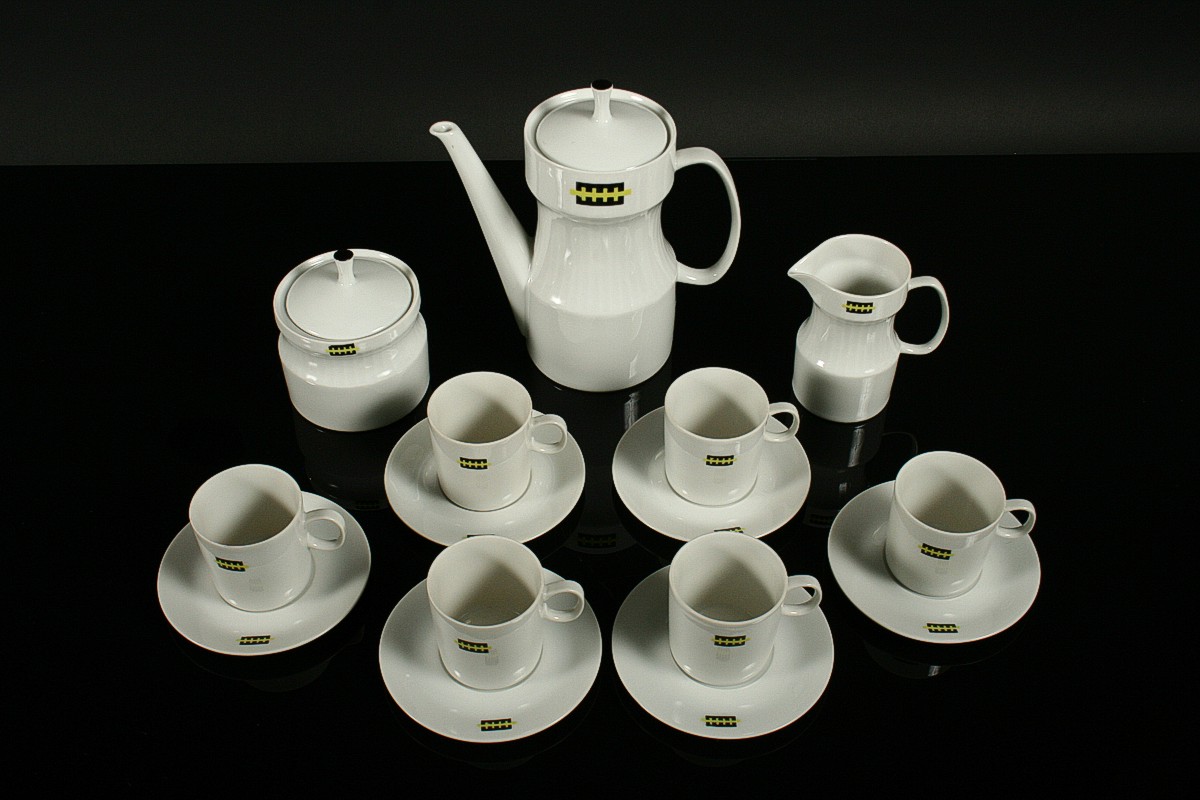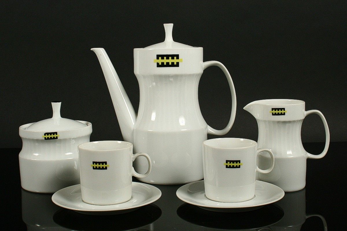 kompletní kávový servis bílý porcelán s atraktivním a velmi žádaným černo žlutým dekorem od známého návrháře designu 50 a 60. let Jaroslava ježka, konvice, mléčenka, cukřenka, a 6x šálek s podšálkem, značeno tištěnou značkou nefertiti, Loučky, Czechoslovakia designed by Jaroslav Ježek