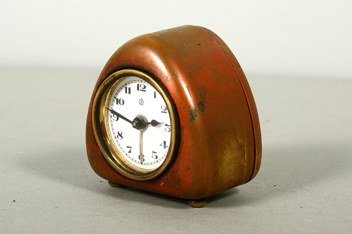 stolní budíkček v mosazném tónovaném pouzdře, značky junghans, stroj funkční, 5,5 x 5 x 4,5 cm