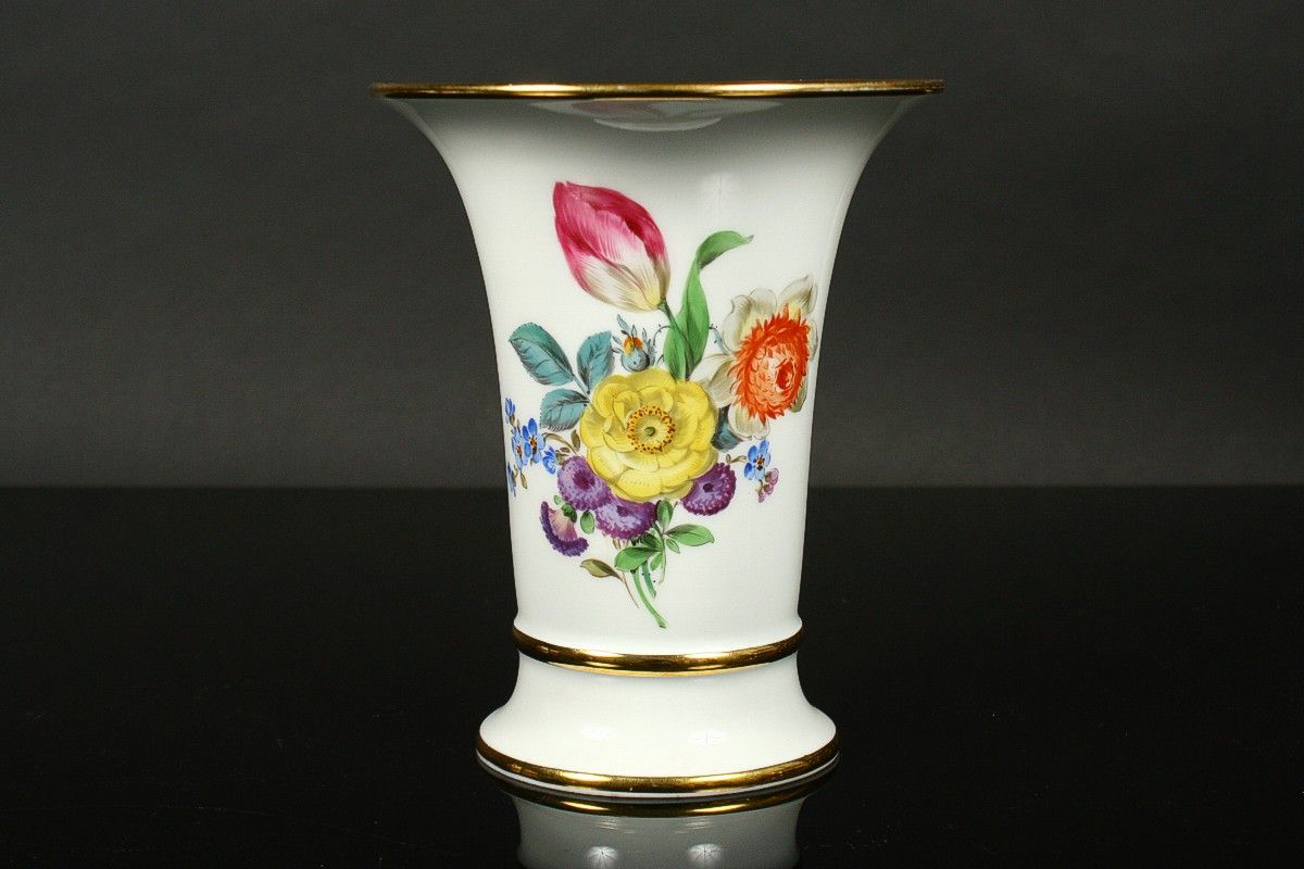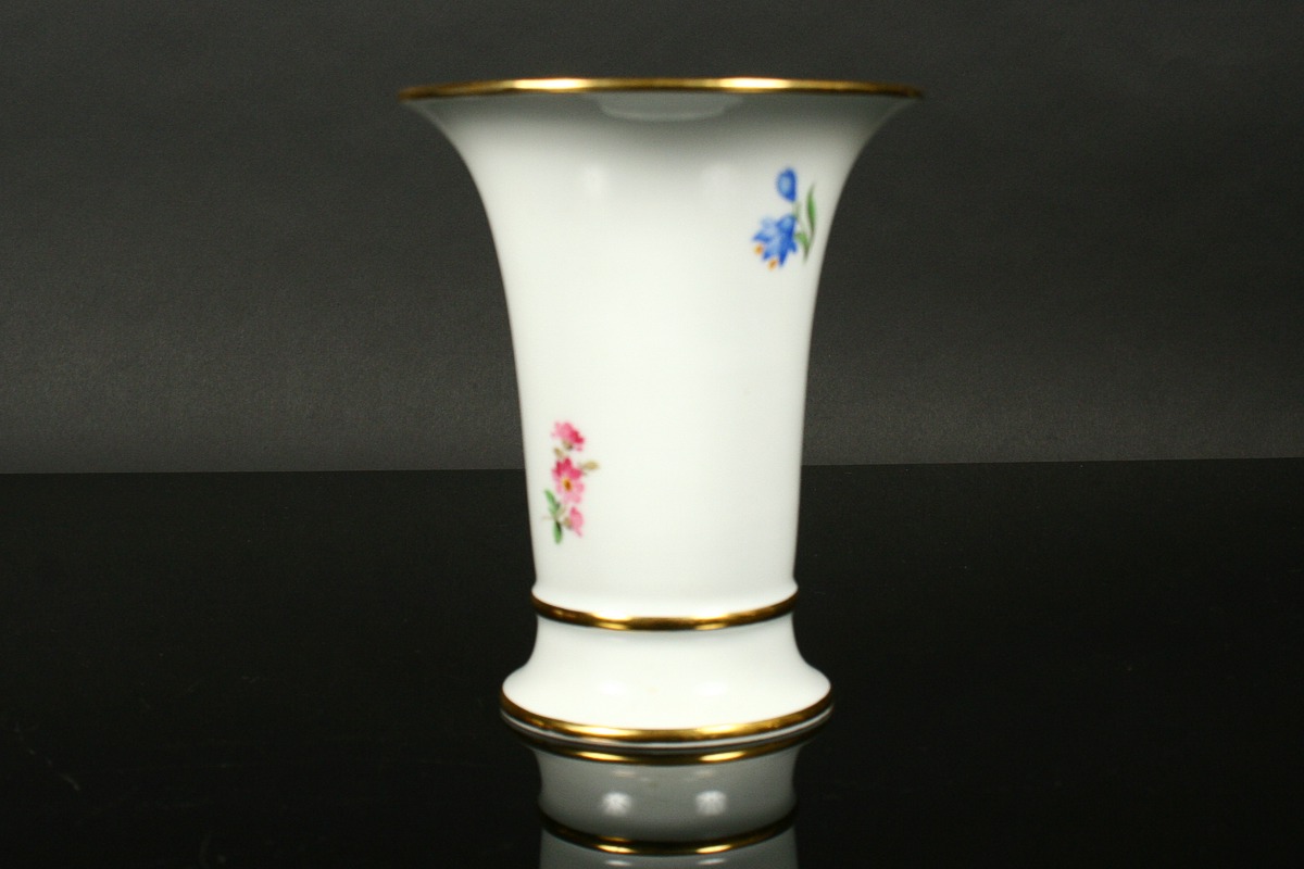váza s pestře malovaným květinovým motivem a zlacenými linkami, malovaný zlacený bílý porcelán, 13,5 cm, na podstavě značen Míšeň modře pod glazurou znakem křížených kordů tlačenými čísly 540, 26, a červeně pasanými 130, 42