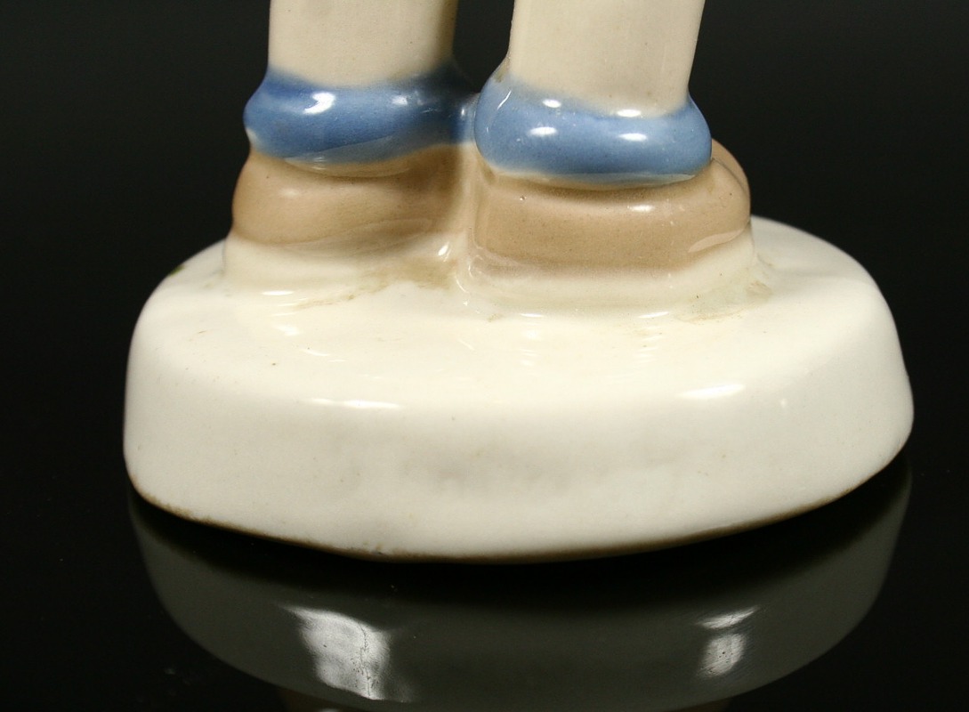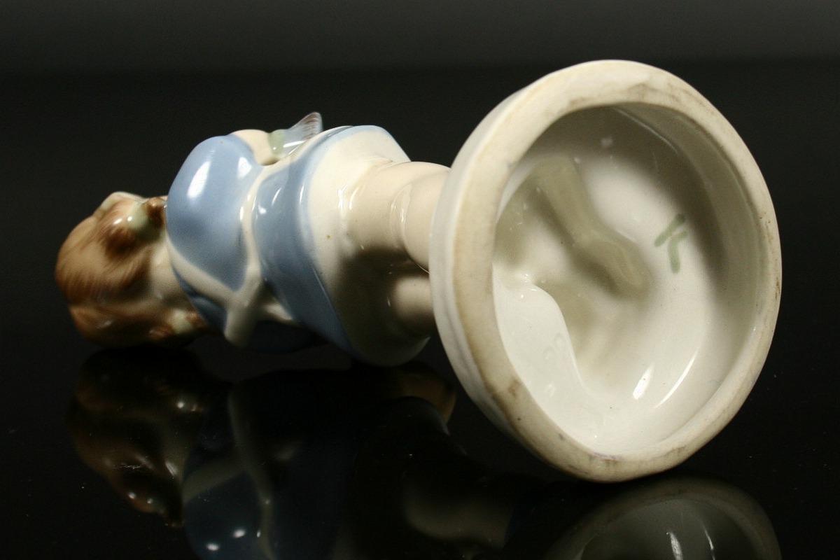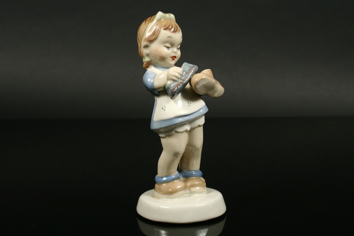 holčička v modrých šatečkách kartáčující botu, malovaný bílý porcelán, na zadní straně soklu značeno Elly Strobach, na podstavě značeno tlačenou číslicí a pod glazurou psaným znakem k, produkce Royal DUX Duchcov, 14,5 x 6 x 6 cm