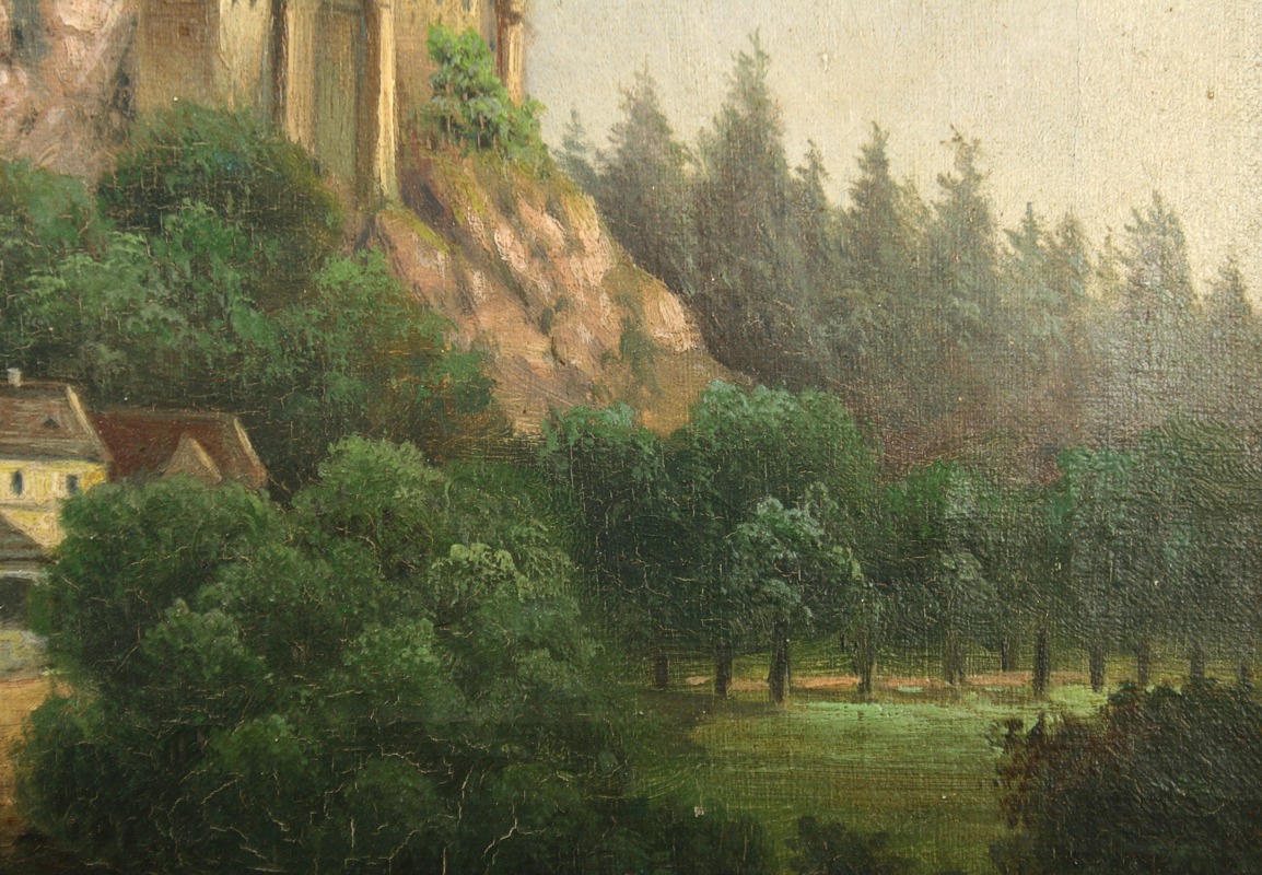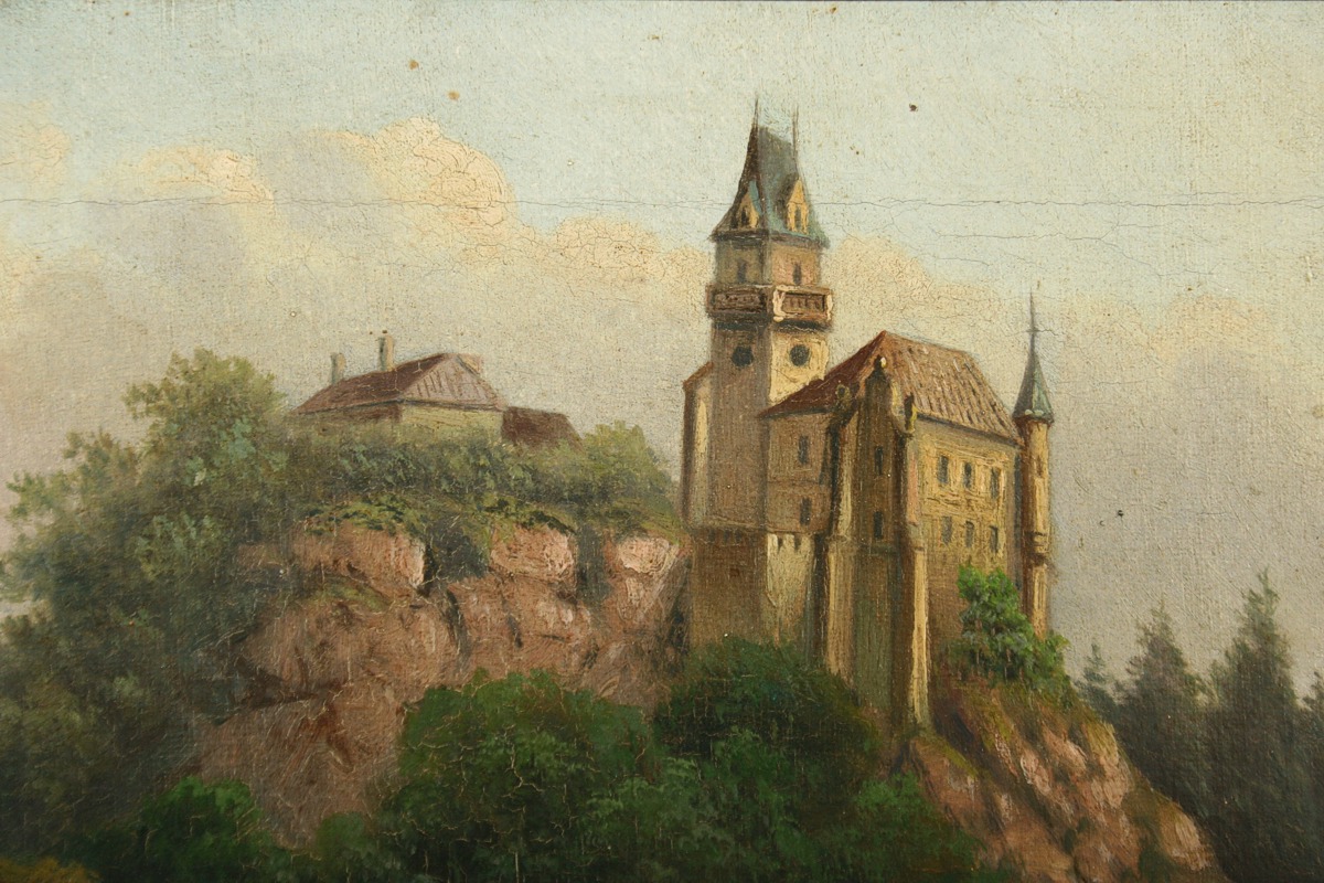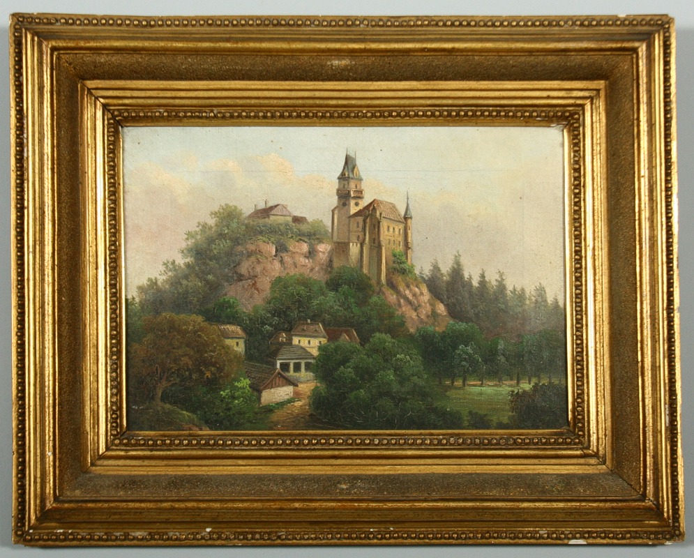 obraz hradu v zalesněné krajině s podhradím, olej na plátně, ve výřezu 19 x 27,5 s rámem 32,5 x 41,5 cm, konec 19. století, nepodepsáno, rámováno v původním lehce poškozeném rámu, párový obraz k druhé položce