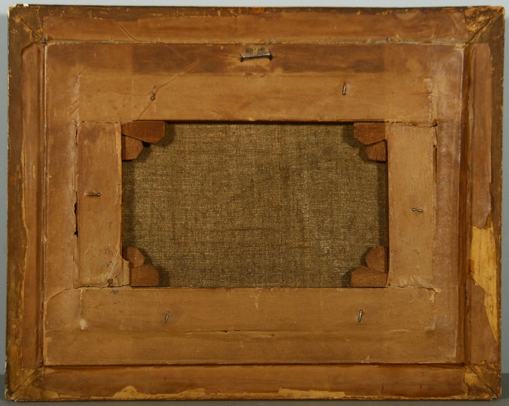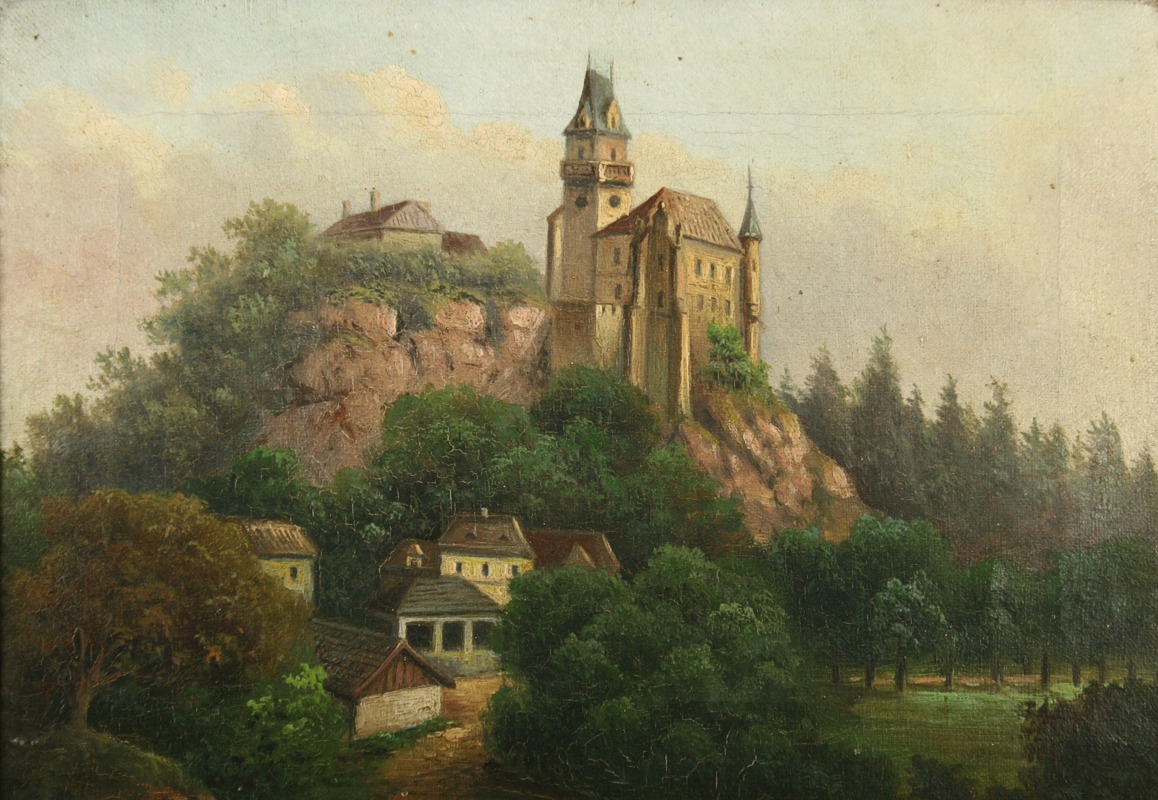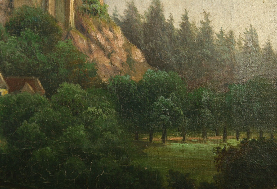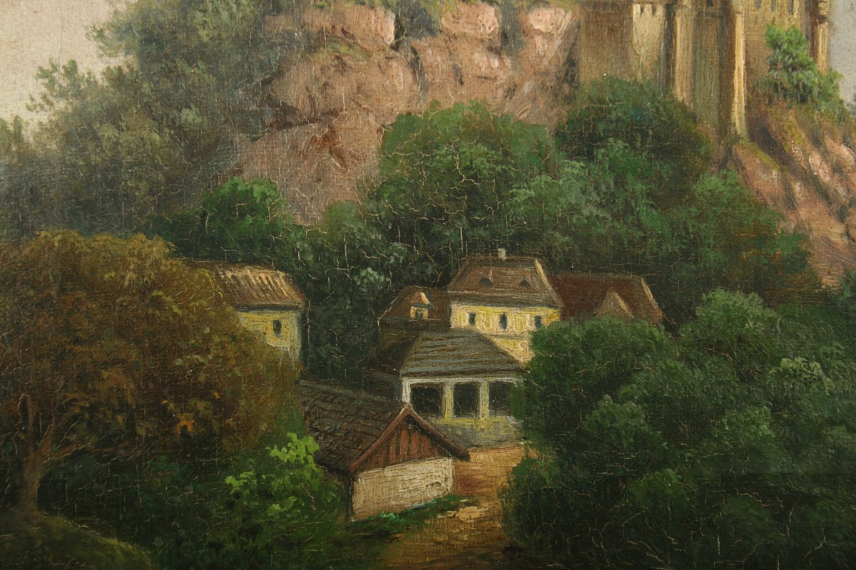 obraz hradu v zalesněné krajině s podhradím, olej na plátně, ve výřezu 19 x 27,5 s rámem 32,5 x 41,5 cm, konec 19. století, nepodepsáno, rámováno v původním lehce poškozeném rámu, párový obraz k druhé položce