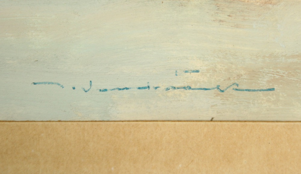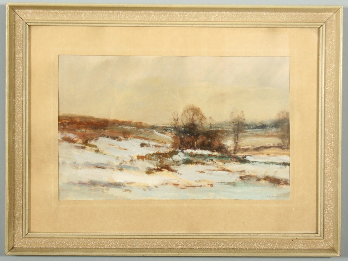 předjarní krajina se stromy, tempera na papíře, ve výřezu 31,5 x 44 s rámem 38 x 51 cm, podepsáno vpravo dole Josef Vondráček, rámováno v původním rámu s paspartou pod sklem