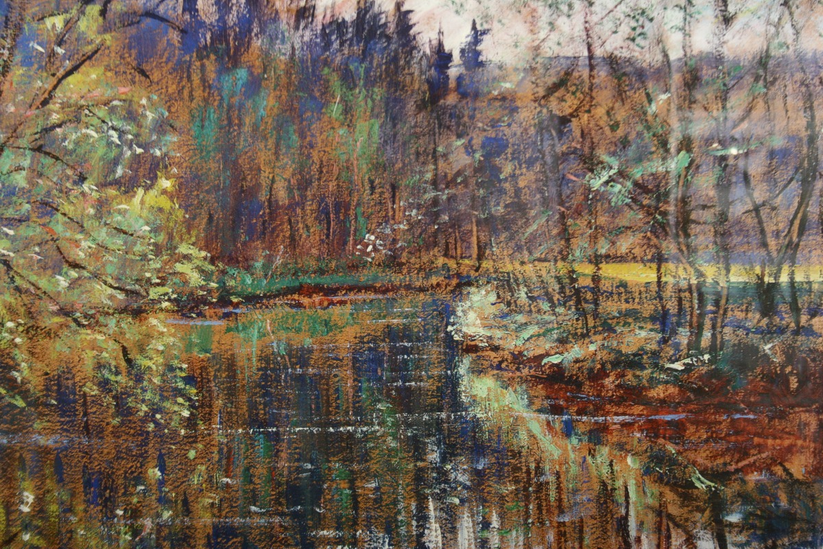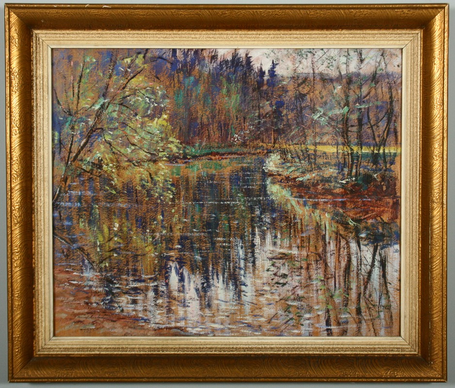 obraz krajiny s řekou Úpou protékající Babiččíným údolím v Ratibořicích, olej na lepence, lepenka 50 x 59,5 s rámem 61,5 x 71,5 cm, podepsáno vpravo dole Bedřich Linhart, rámováno v původním rámu pod sklem