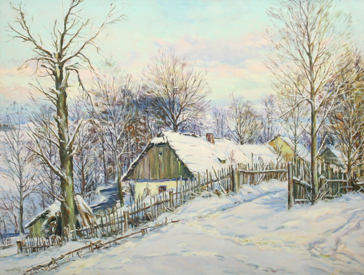 obraz chlupy v zimě ze Slavníče, olej na lepence 50 x 66 cm s rámem 66 x 82 cm, autor František Škrabánek podepsáno vlevo dole, bravůrní ukázka zvládnuté zimy v podání malíře Vysočiny a žáka prof. Engelmüllera, tento obraz je publikovaný na pohlednicích vydaných nákladem Fr. Riedla v Německém Brodě, na zadní straně autorský přípis a etiketa s číslem, rámováno pod sklem