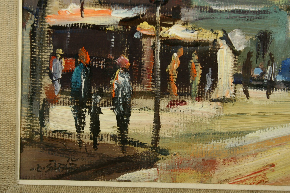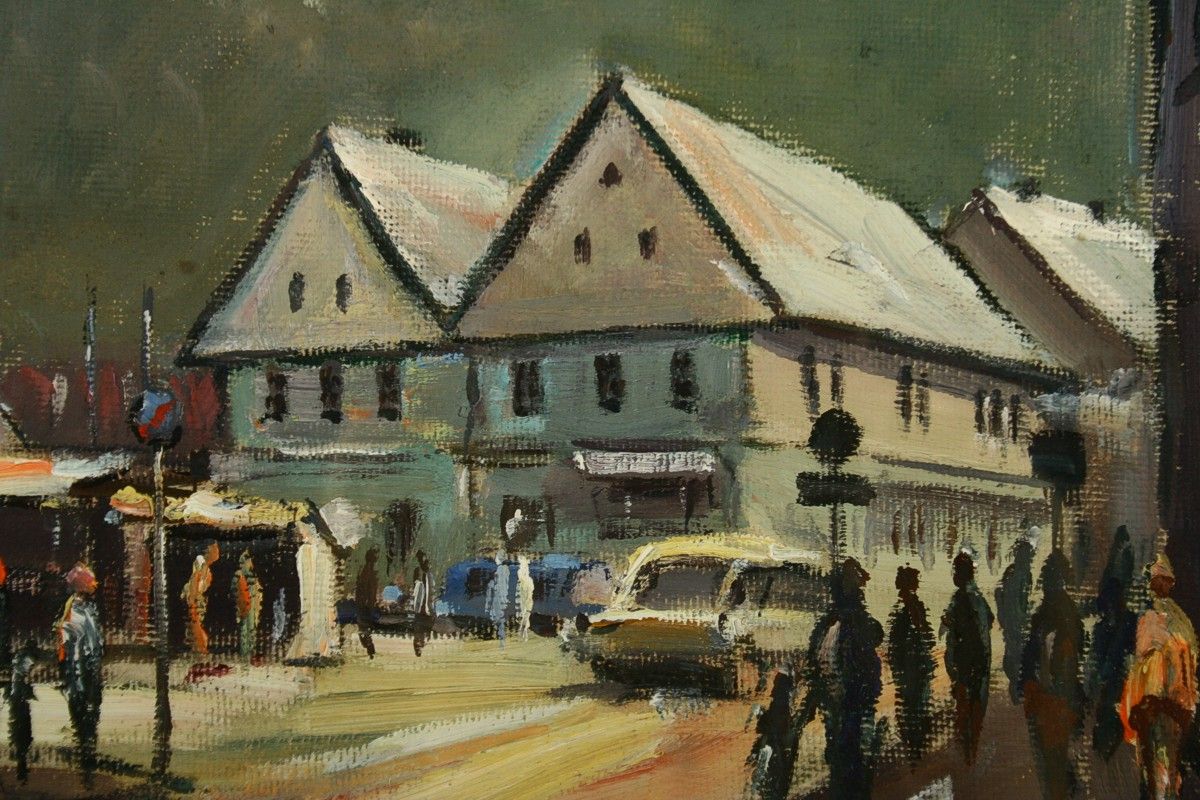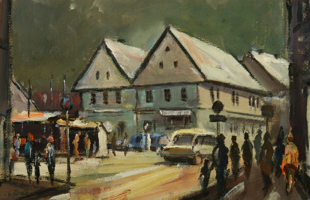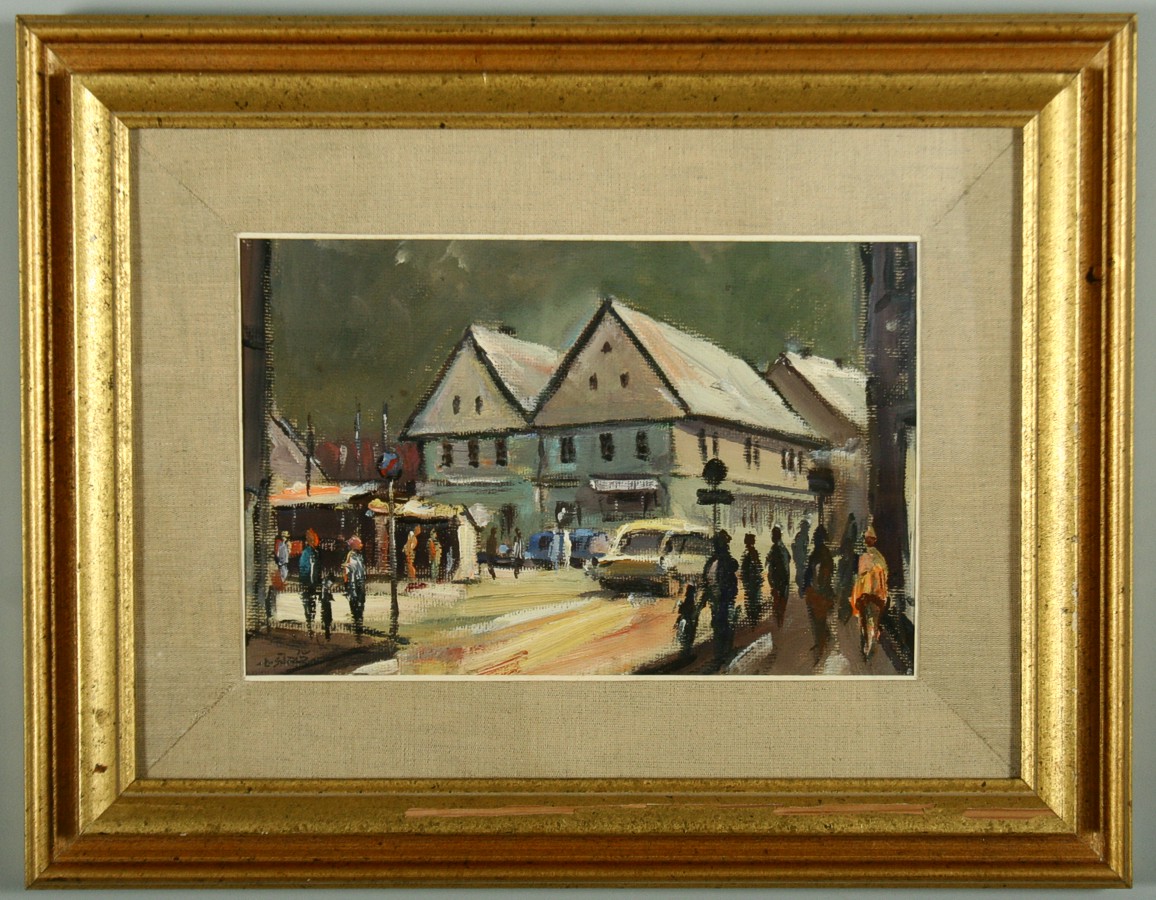 obraz Karlova náměstí v Náchodě, olej na plátně adjustovaném na kartonu, ve výřezu 20 x 31 cm s rámem 41 x 52 cm, autor Karel Šafář, podepsáno vlevo dole K. Šafář, na zadní straně autorský přípis s určením Novákovy domy na Karlově náměstí v Náchodě 1977, rámováno v paspartě a rámu pod sklem