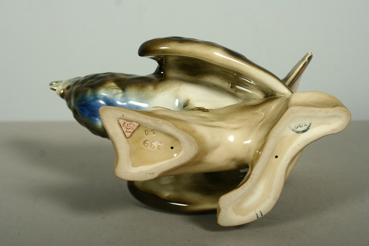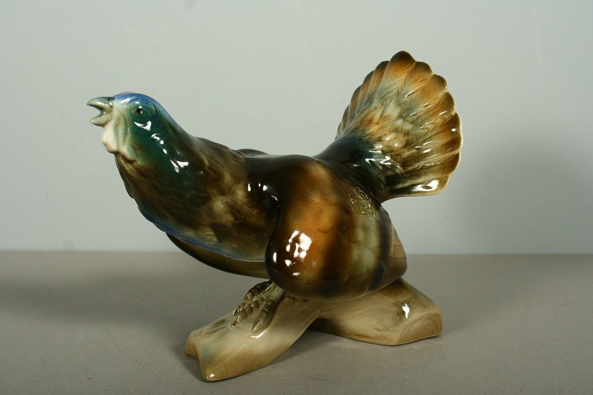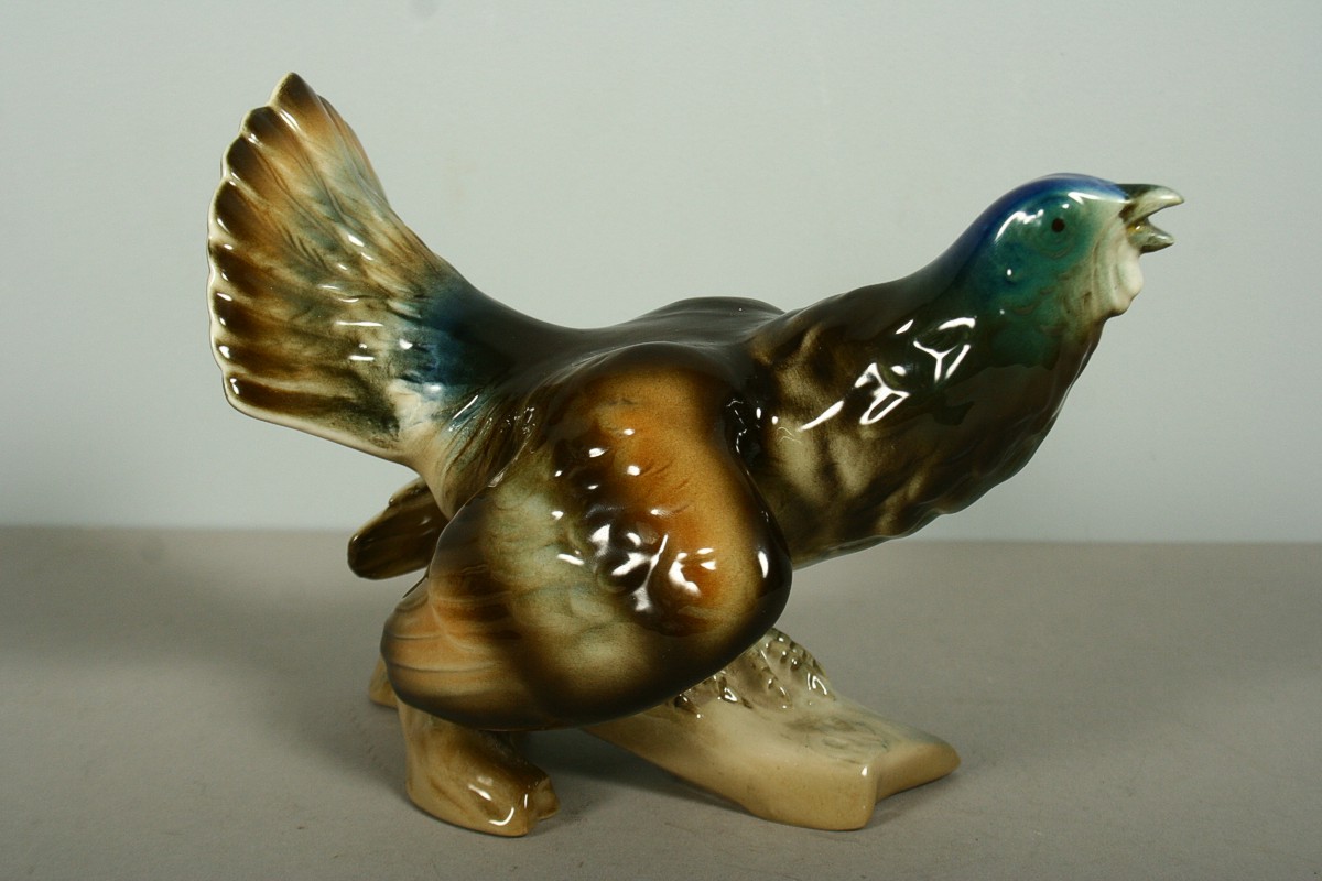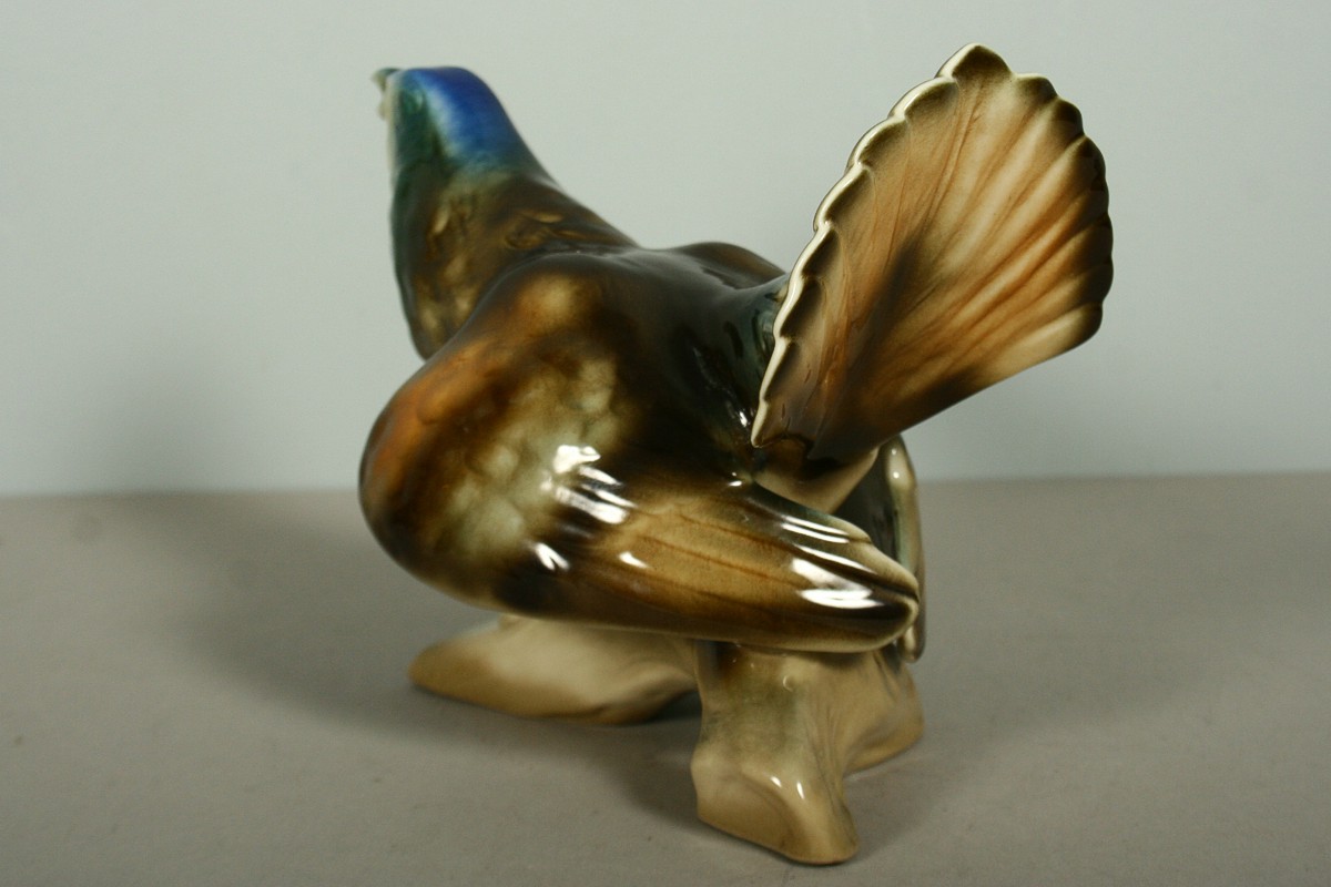 soška tetřeva na větvi, pestře malovaný býlý porcelán, značeno tištěnou i tlačenou značkou Royal DUX, 14,5 x 20 cm