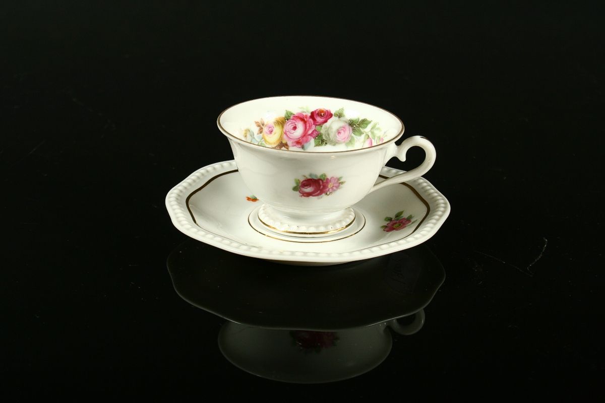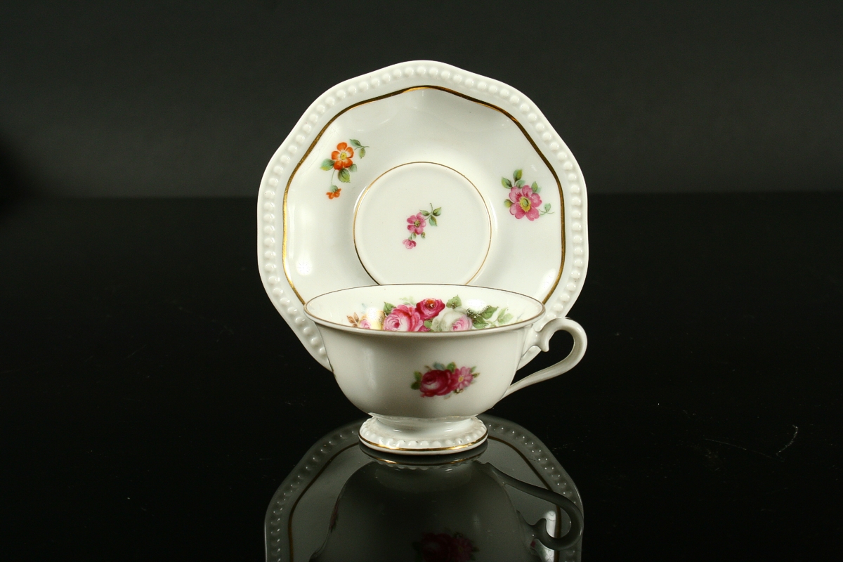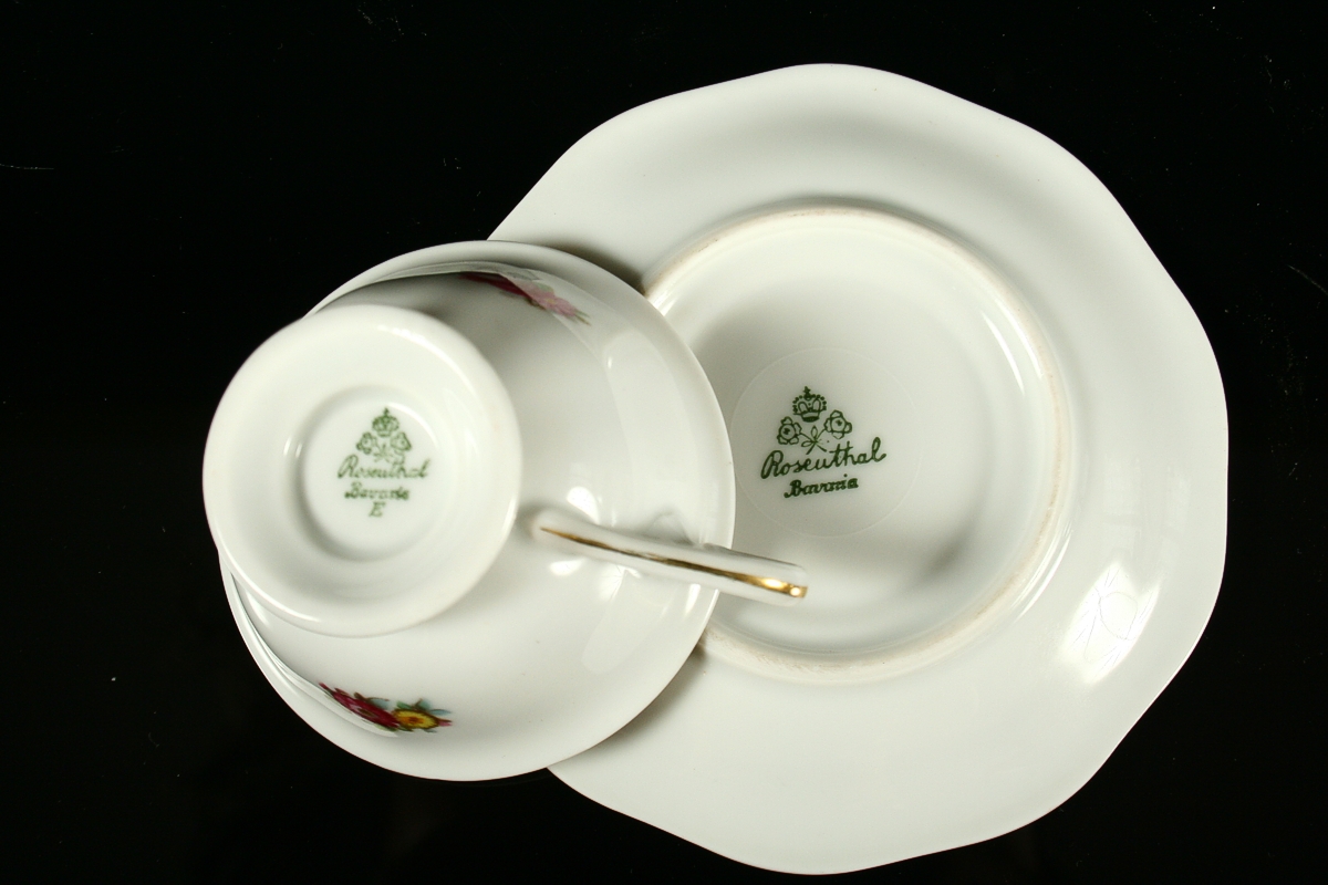darovací moca šálek s projímaným podšálkem, malovaný bílý porcelán se zlacenými detaily, značený tištěnou značkou Rosenthal, 4,5 x 10,5 cm