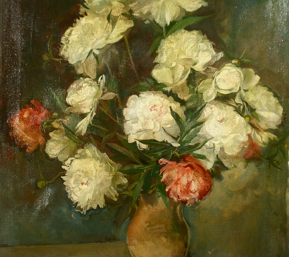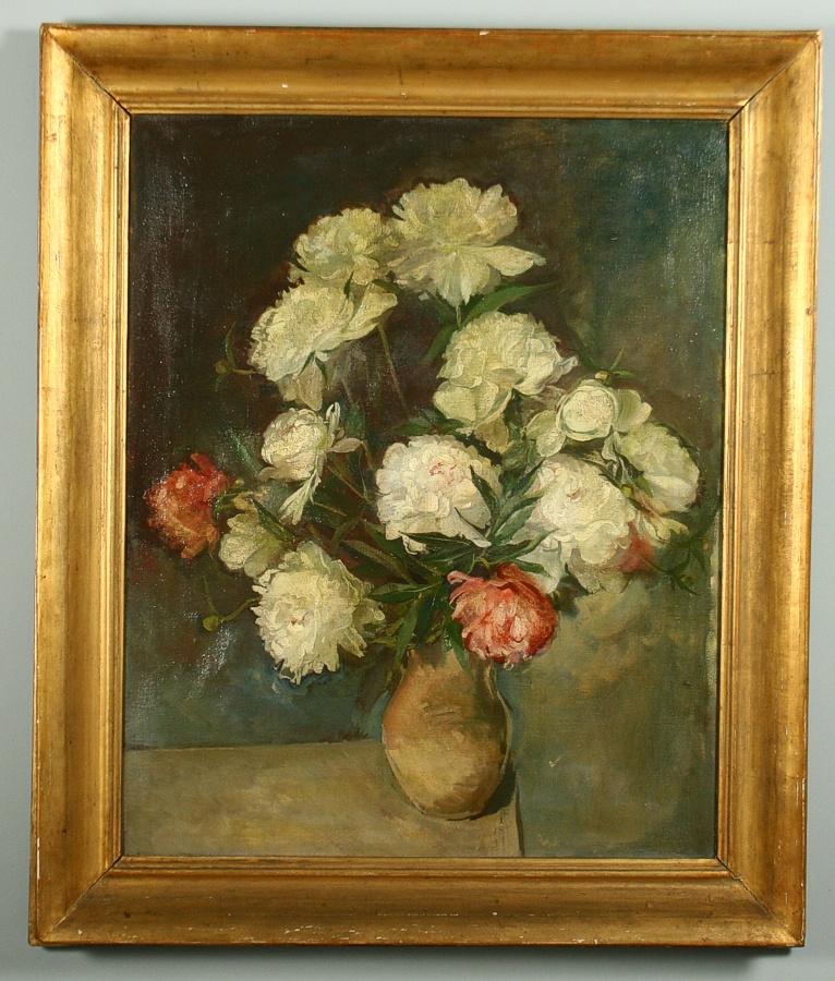 obraz kytice jiřin ve váze na kraji stolu, olej na plátně, 81 x 65 cm s rámem 99 x 84 cm, autor František Ropek, podepsáno v obraze u vázy Ropek, rámováno v původním zlaceném rámu