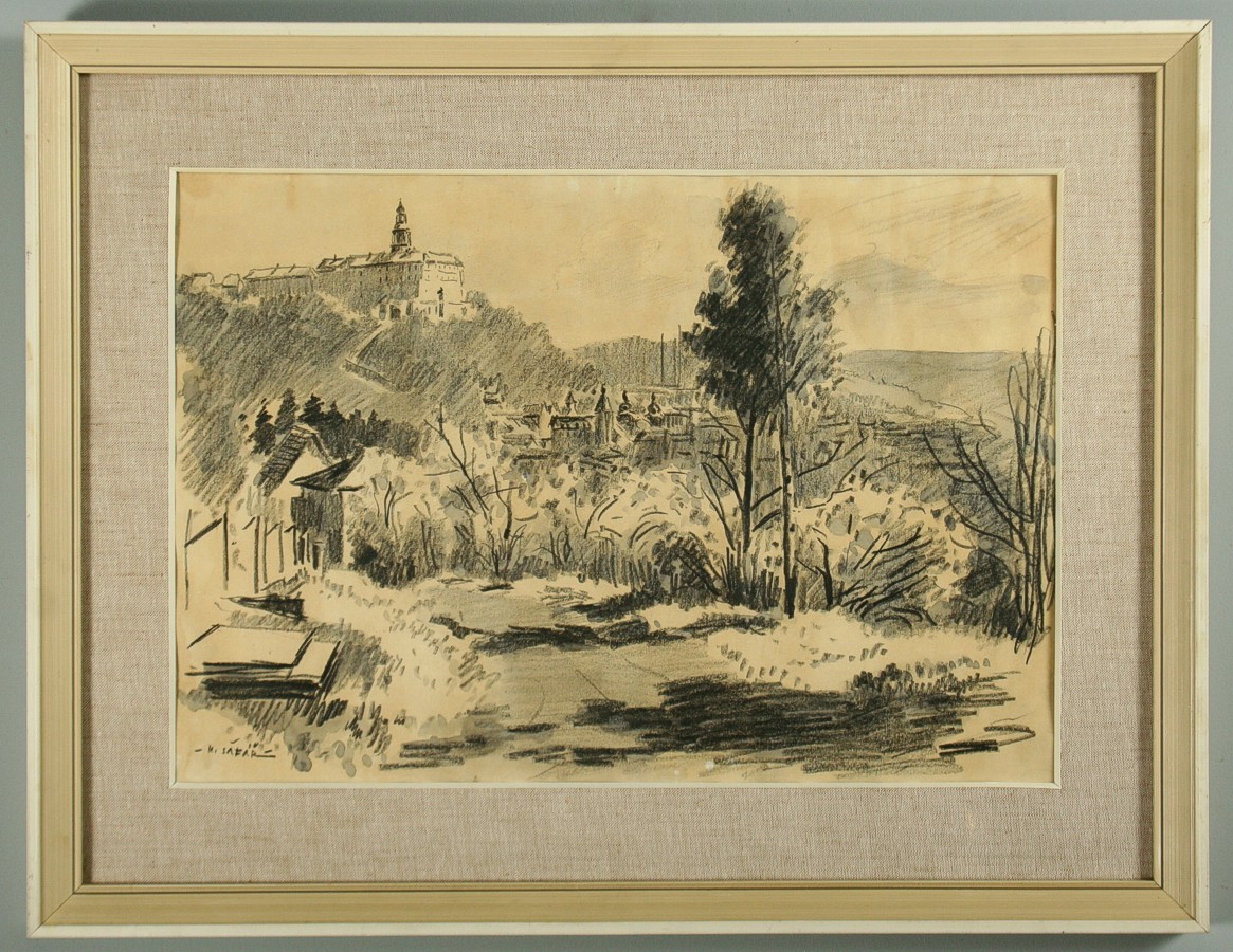 pohled na Náchod z Klínku, kresba úhlem na papíře, ve výřezu 32 x 46 cm s rámem 48 x 62 cm, autor Karel Šafář podepsáno vlevo dole K.Šafář ze zadu autorský přípis s datací a určením, rámováno v paspartě a rámu pod sklem