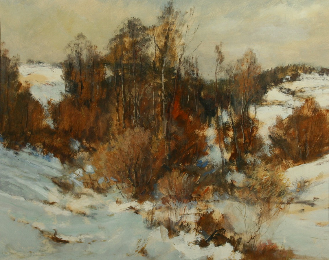 obraz zimní krajiny, olej tempera na lepence ve výřezu 36 x 45 cm s rámem 52 x 61 cm, autor Josef Vondráček, nepodepsáno, na zadní straně popisek autora, rámováno v paspartě a rámu pod sklem