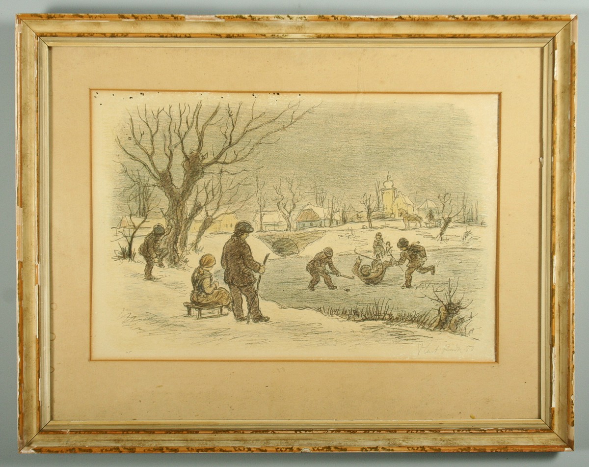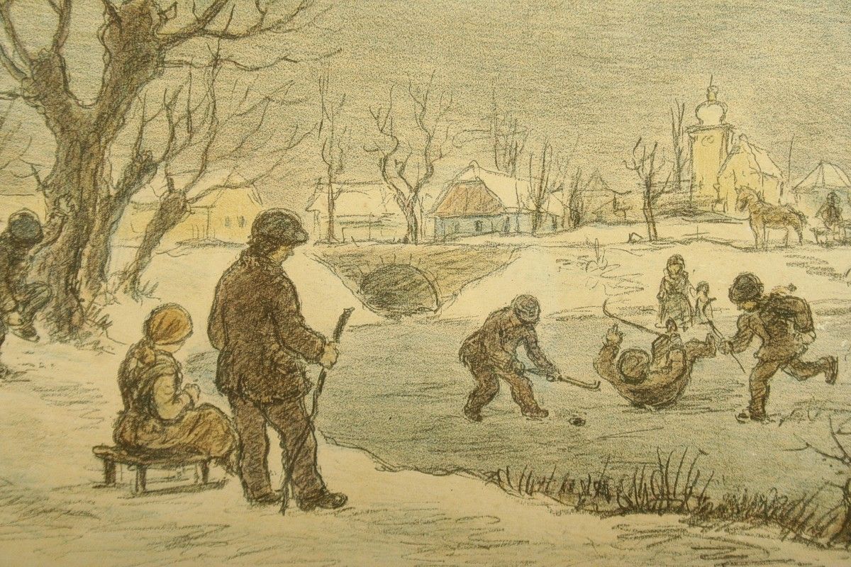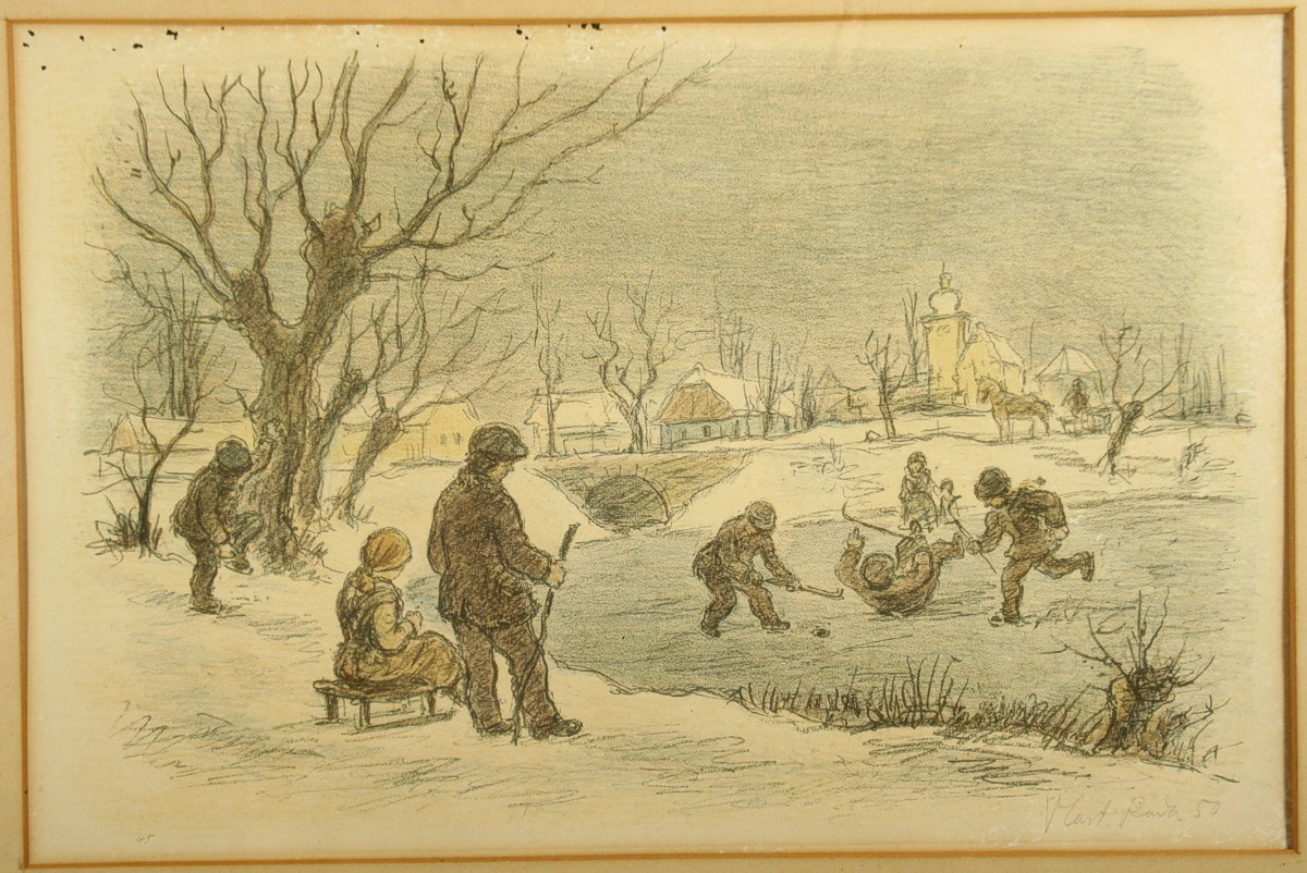 zimní hrátky na rybníce barevná litografie na papíře, ve výřezu 35 x 53 cm, s rámem 57 x 73 cm, autor Vlastimil Rada, podepsáno vpravo dole tužkou Vlast. Rada, papír v horní části napadený červotočem, půjde dát nová pasparta, která zakryje dírky, rámováno v původním částečně poškozeném rámu a paspartě pod sklem