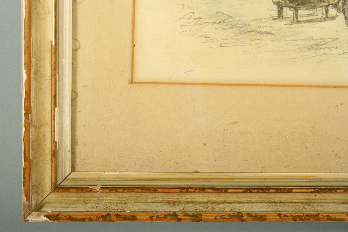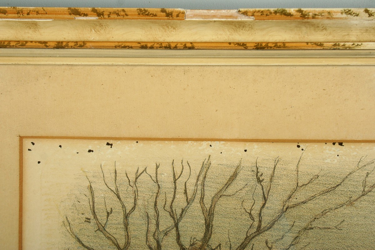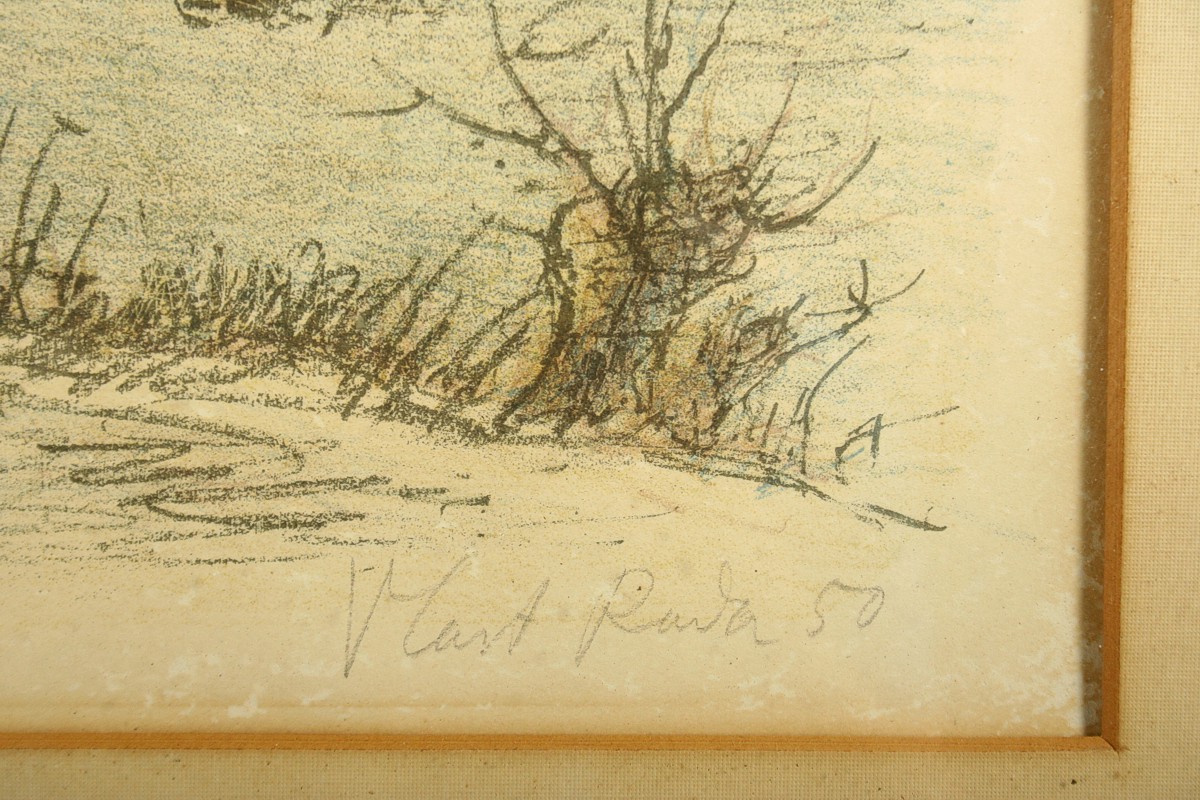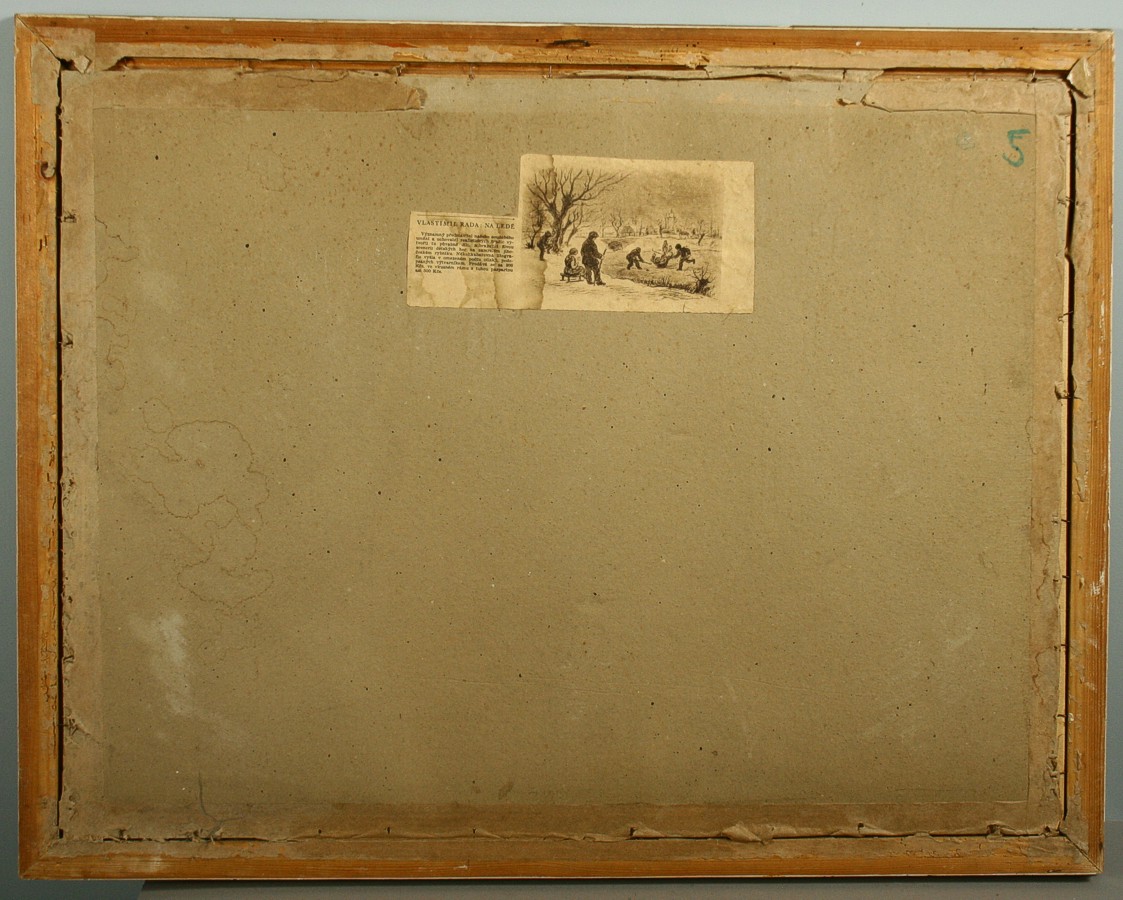 zimní hrátky na rybníce barevná litografie na papíře, ve výřezu 35 x 53 cm, s rámem 57 x 73 cm, autor Vlastimil Rada, podepsáno vpravo dole tužkou Vlast. Rada, papír v horní části napadený červotočem, půjde dát nová pasparta, která zakryje dírky, rámováno v původním částečně poškozeném rámu a paspartě pod sklem