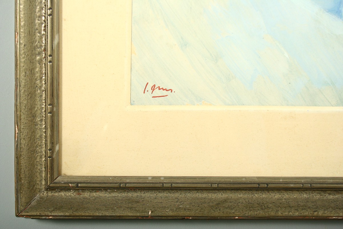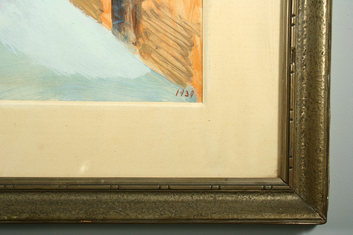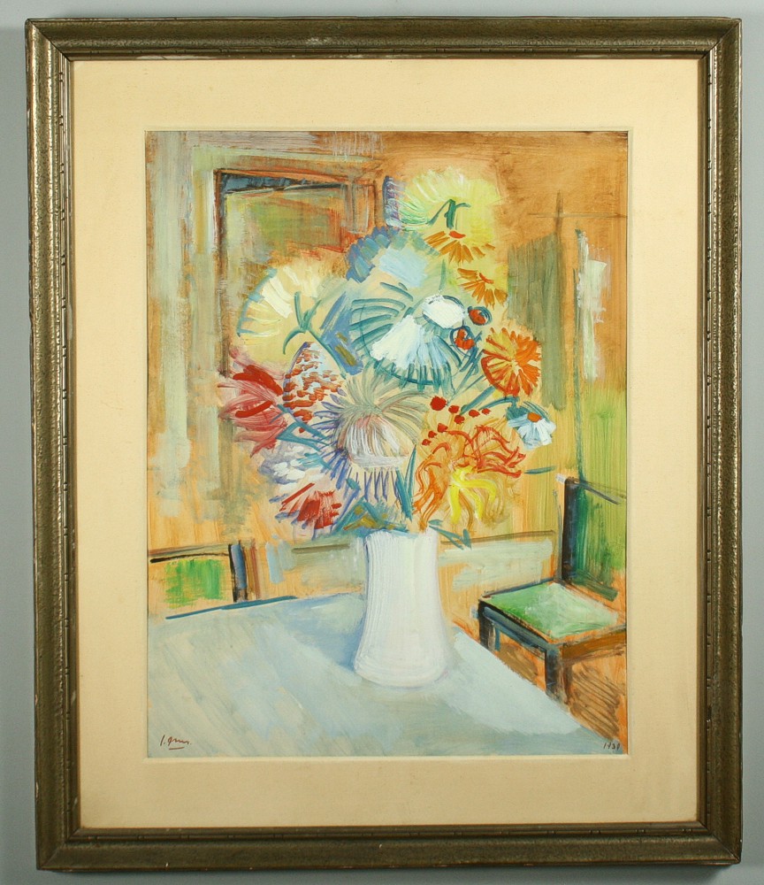 obraz kytice ve váze na stole v pokoji se židlí, olej tempera na lepence ve výřezu 65 x 50 cm s rámem 87 x 74 cm, autor Jaroslav Grus (1891 - 1983), podepsáno vlevo dole J. Grus datováno 1939, rámováno v původní paspartě a rámu pod sklem