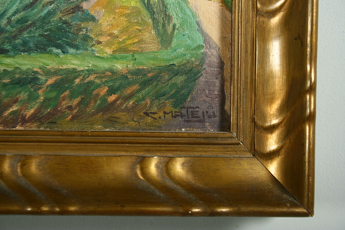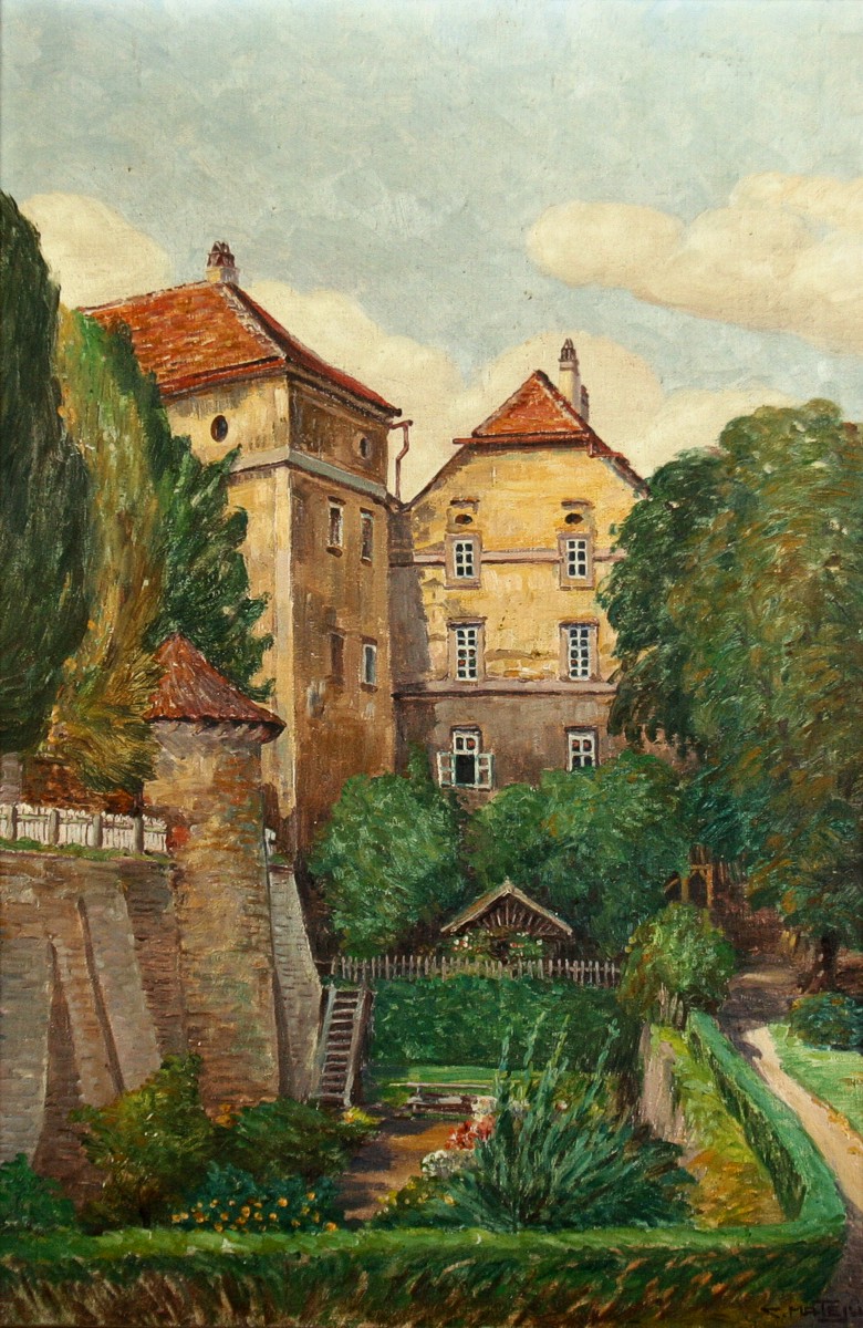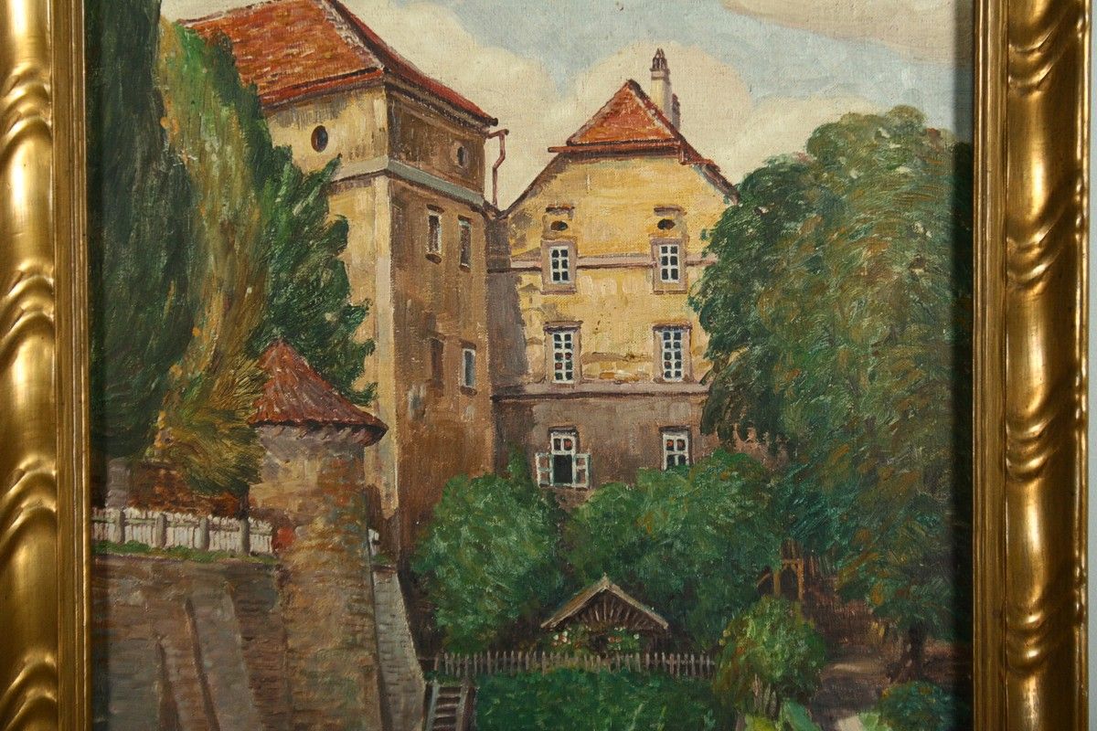 obraz náchodského zámku a zámeckého příkopu, olej na plátně 52 x 35 cm s rámem 43 x 60 cm, autor Calestýn Matějů, podepsáno vpravo dole C. Matějů, rámováno v původním rámu, párový obraz k položce 1271