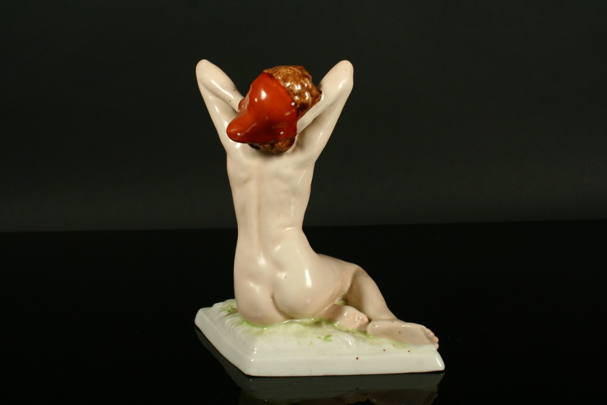 porcelánová soška, sedící dívčí akt se šátkem, malovaný bílý porcelán, na zadní straně soklu signováno Strobach König, na podstavě značeno tištěnou a tlačenou značkou Royal DUX Duchcov, 20,5 x 20,5 cm