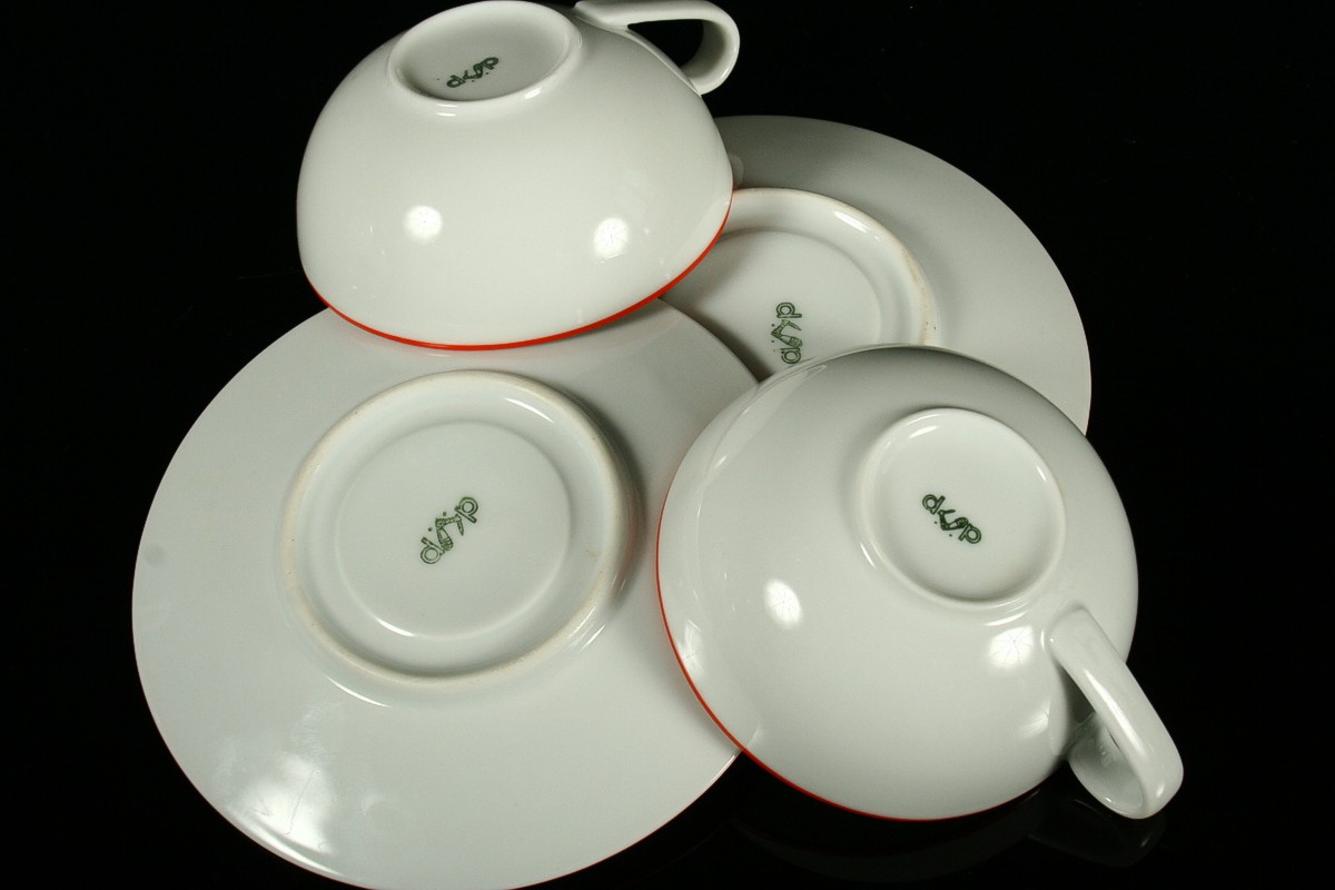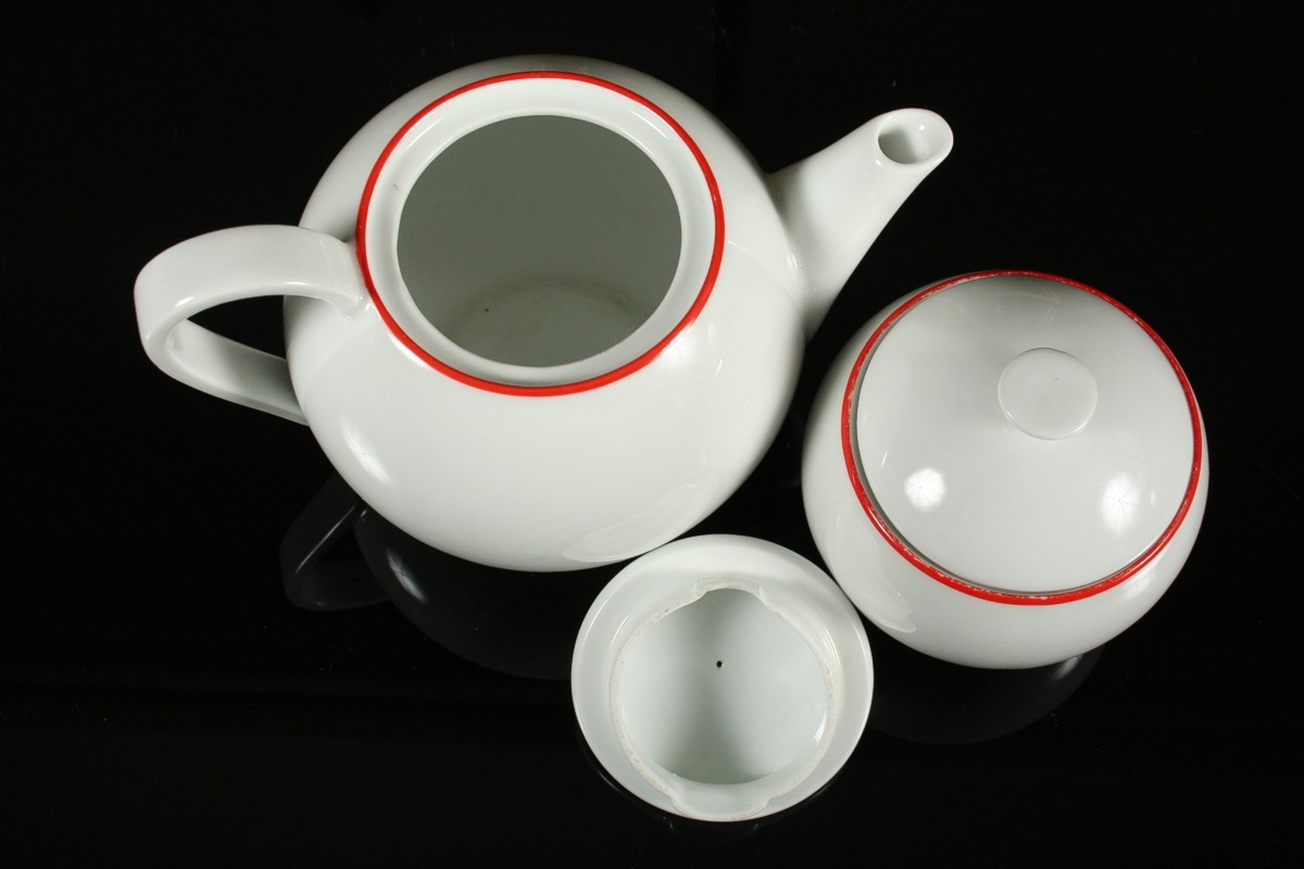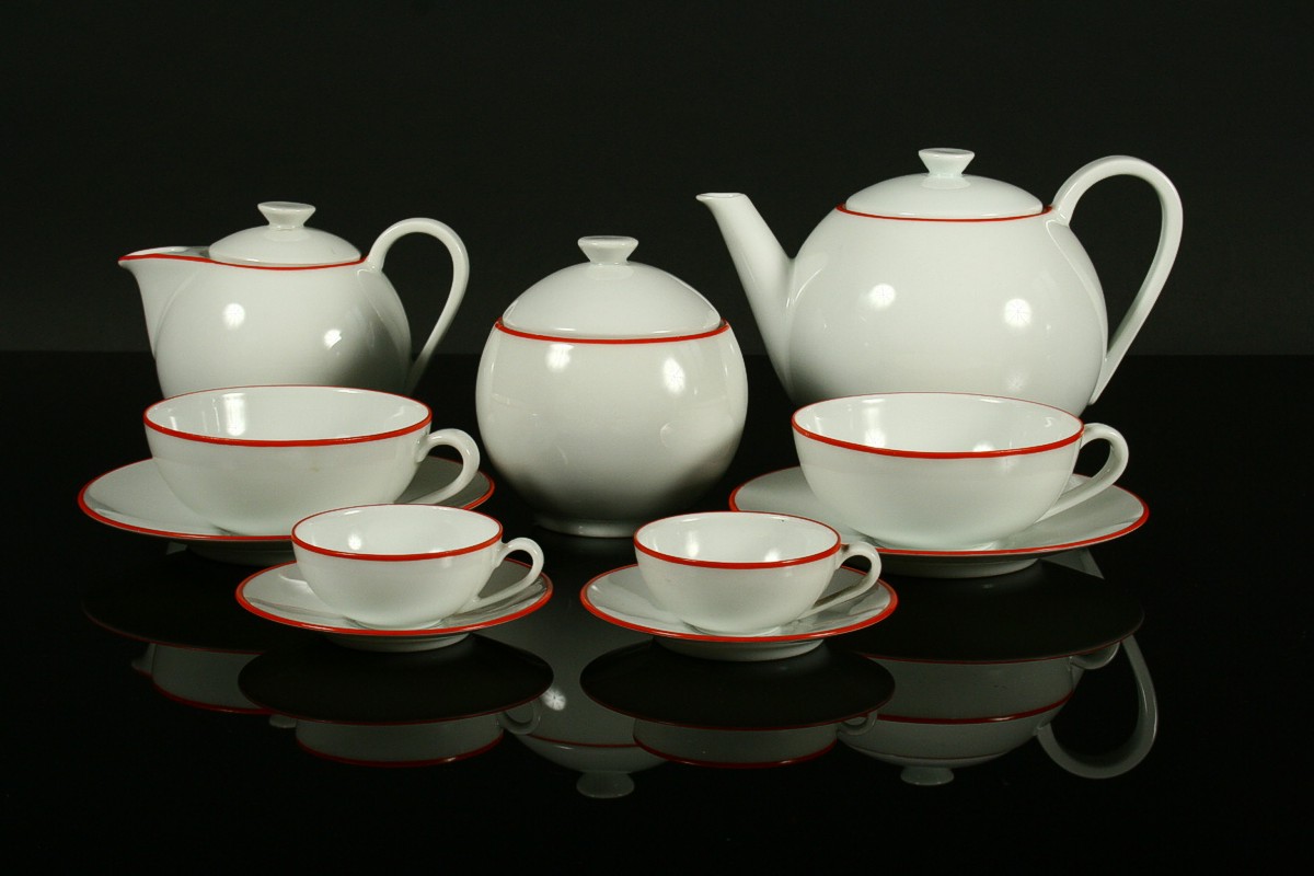 čajový a moca přátelský servis od známého autora českého designu Ladislava Sutnara, 2 x moca šálek s podšálkem, 2 x čajový šálek s podšálkem, konvice, konvička a cukřenka s víčkem z bélého tenkého porcelánu s črvenou linkou po obvodu, značeno tištěnou značkou DP Loket
