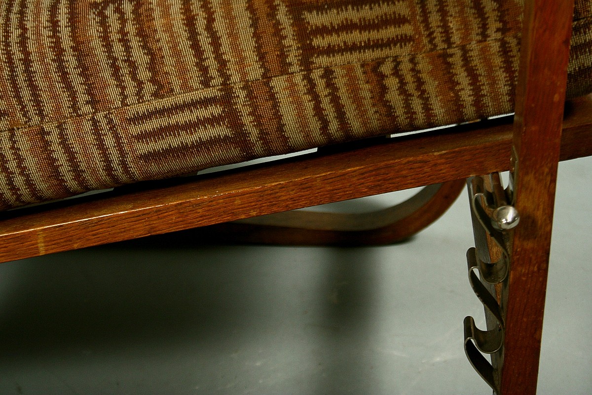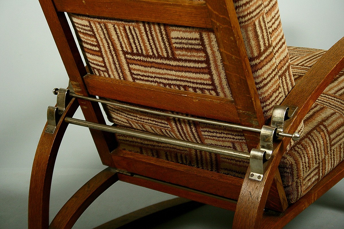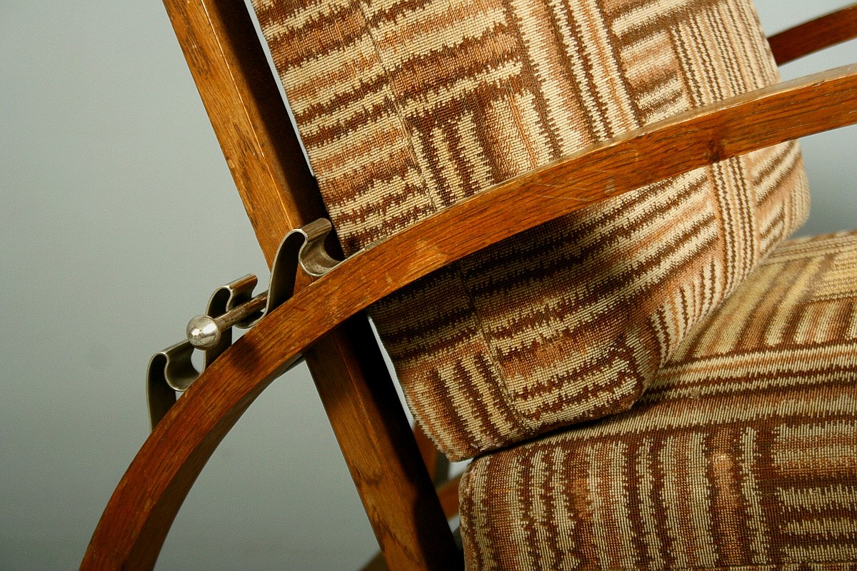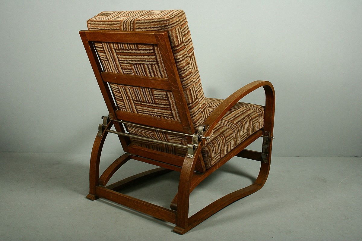 polohovací křeslo z ohýbaného dřeva, dýhované dubovou dýhou, polohovací sedák i opěrka, vše v pěkném původním stavu, originální chromové tyčky s původním zakončením, polstrování s původním, neroztrhaným potahem, ikona českého designu z 30. let 20. století
