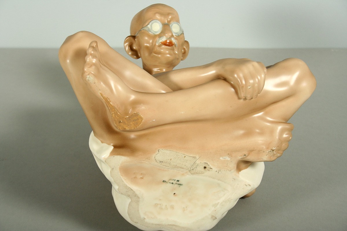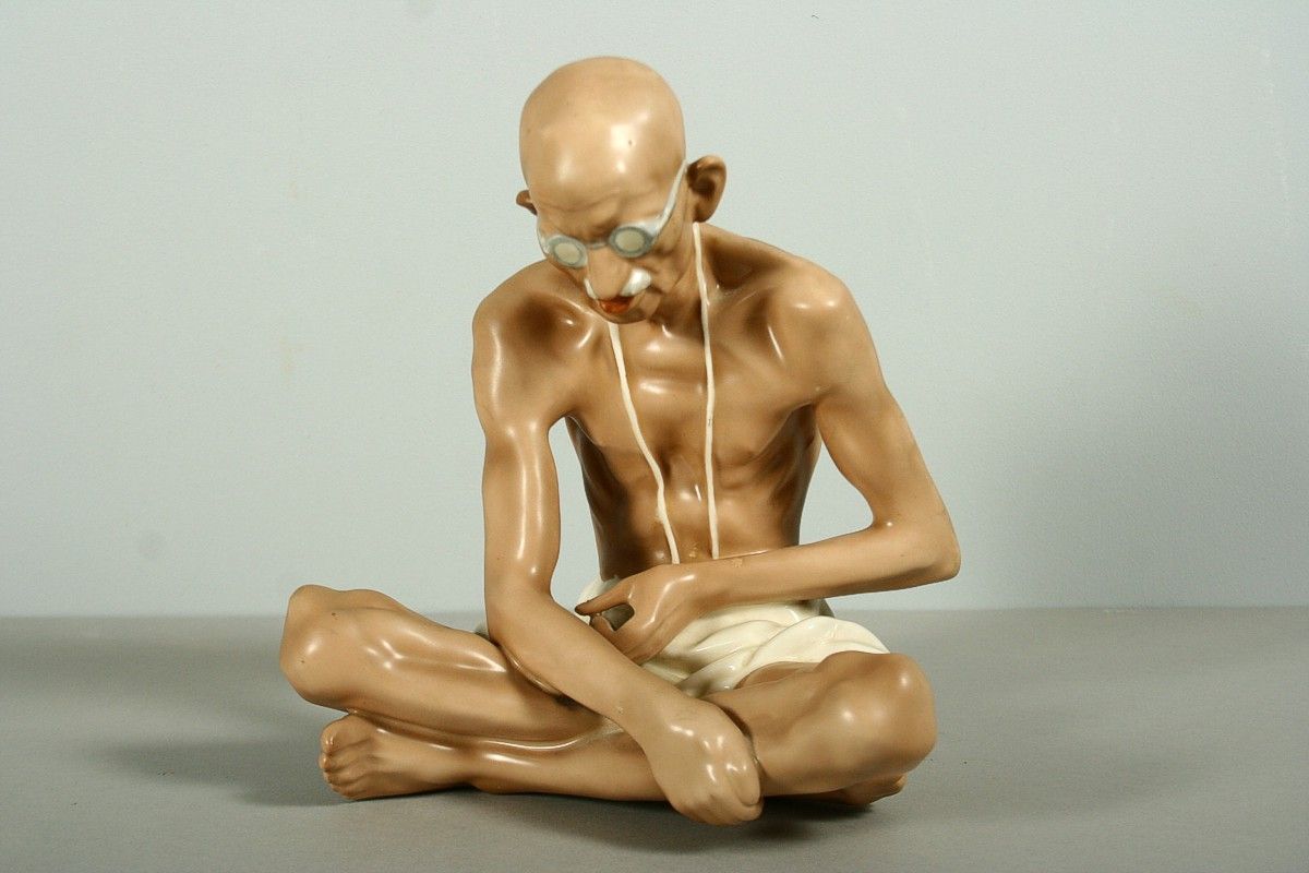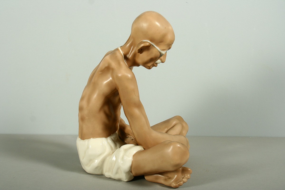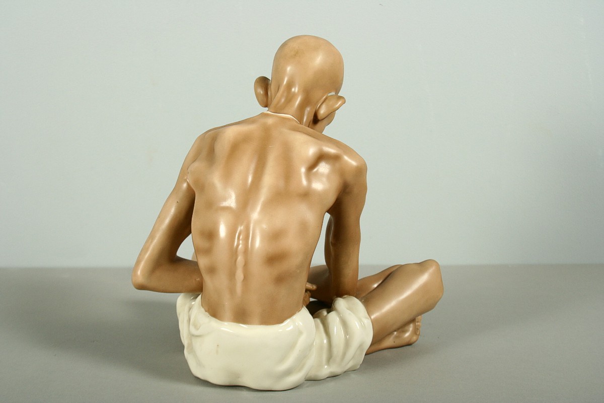 porcelánová socha Mahátma Gándhí, bílý porcelán malovaný pod glazůrou, značený tištěnou značkou Royal DUX Duchcov, 22 x 20 cm