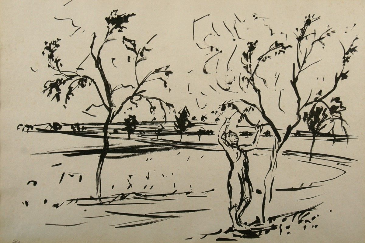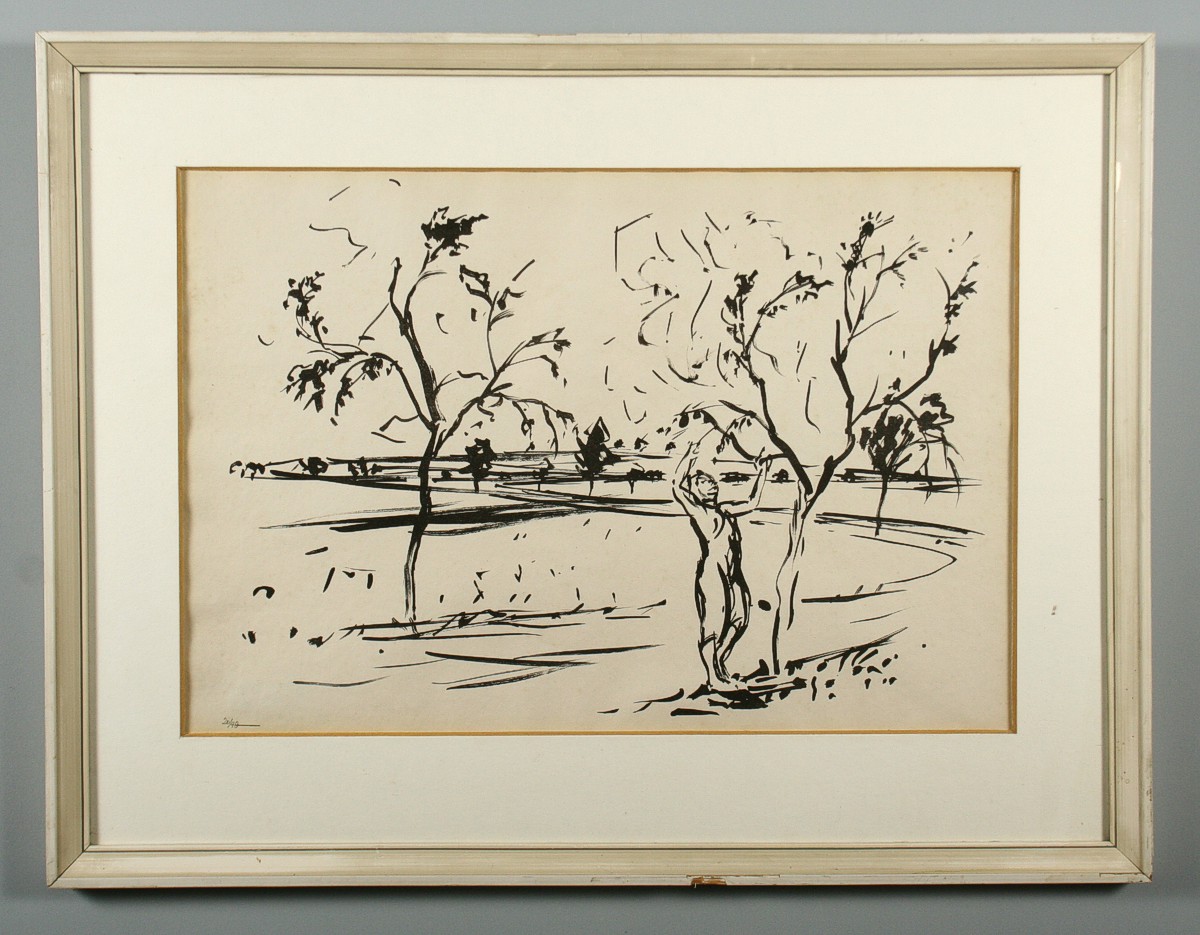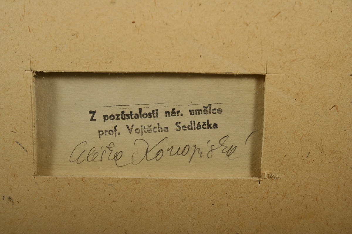 dívka česajísí strom, černobílá litografie na papíře, ve výřezu 37 x 54 cm s rámem 55 x 72 cm, autor Vojtěch Sedláček, nepodepsáno, značeno 20 / 40 a pozůstalostním razítkem, rámováno v paspartě a rámu pod sklem
