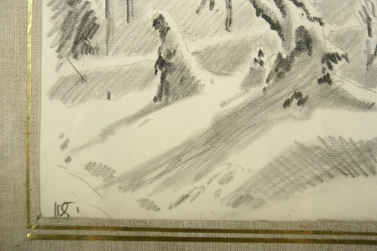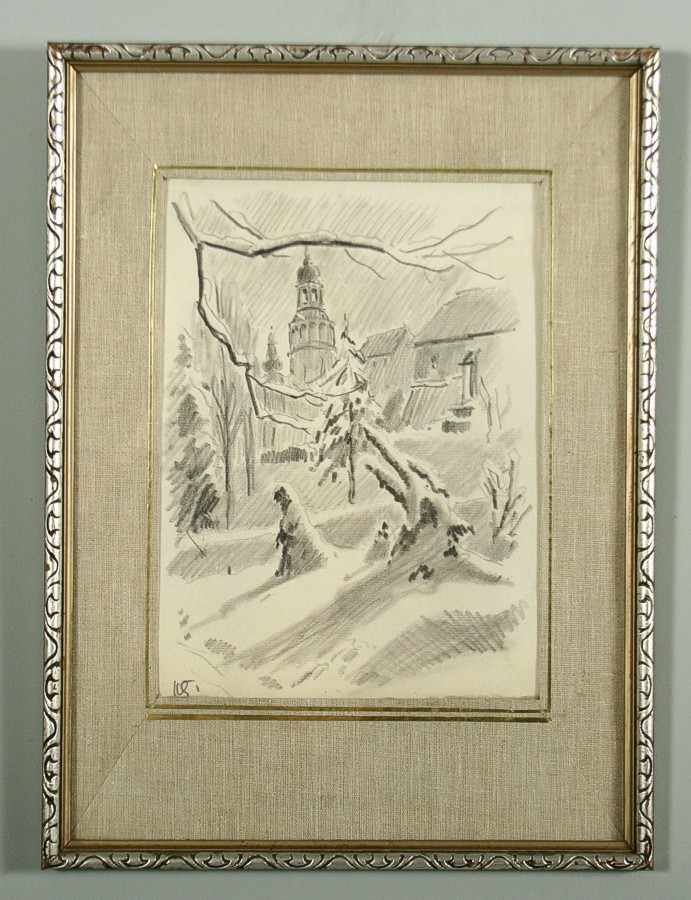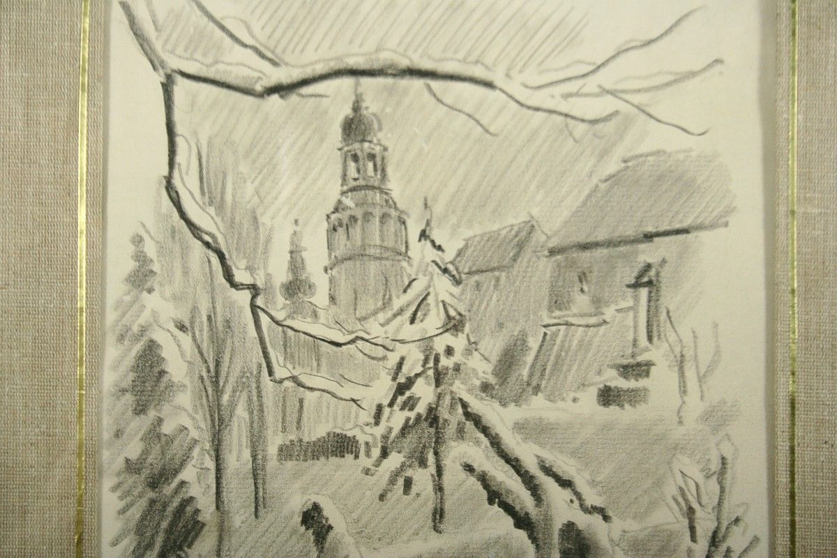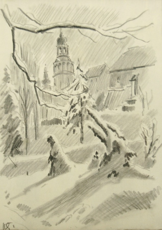 zimní pohled na Náchod ze zahrady, kresba úhlem na papíře, ve výřezu xx cm s rámem xx cm, autor Karel Šafář podepsáno vlevo dole K.Š. ze zadu autorský přípis s datací a určením, rámováno v paspartě a rámu pod sklem