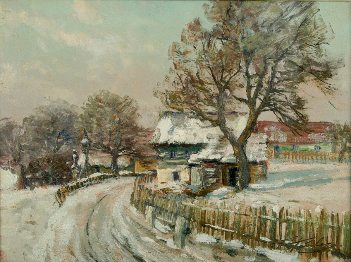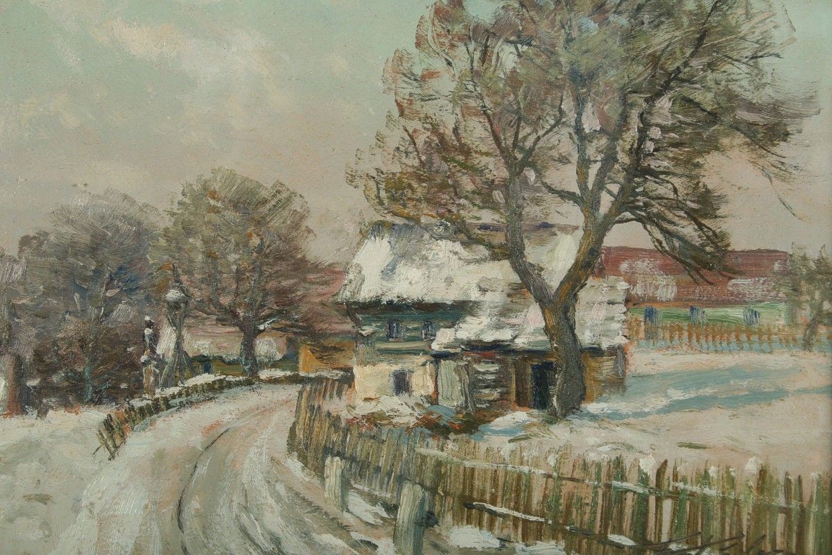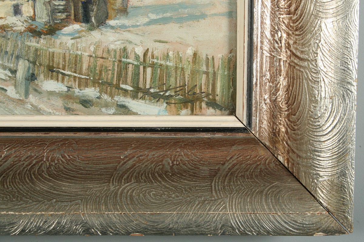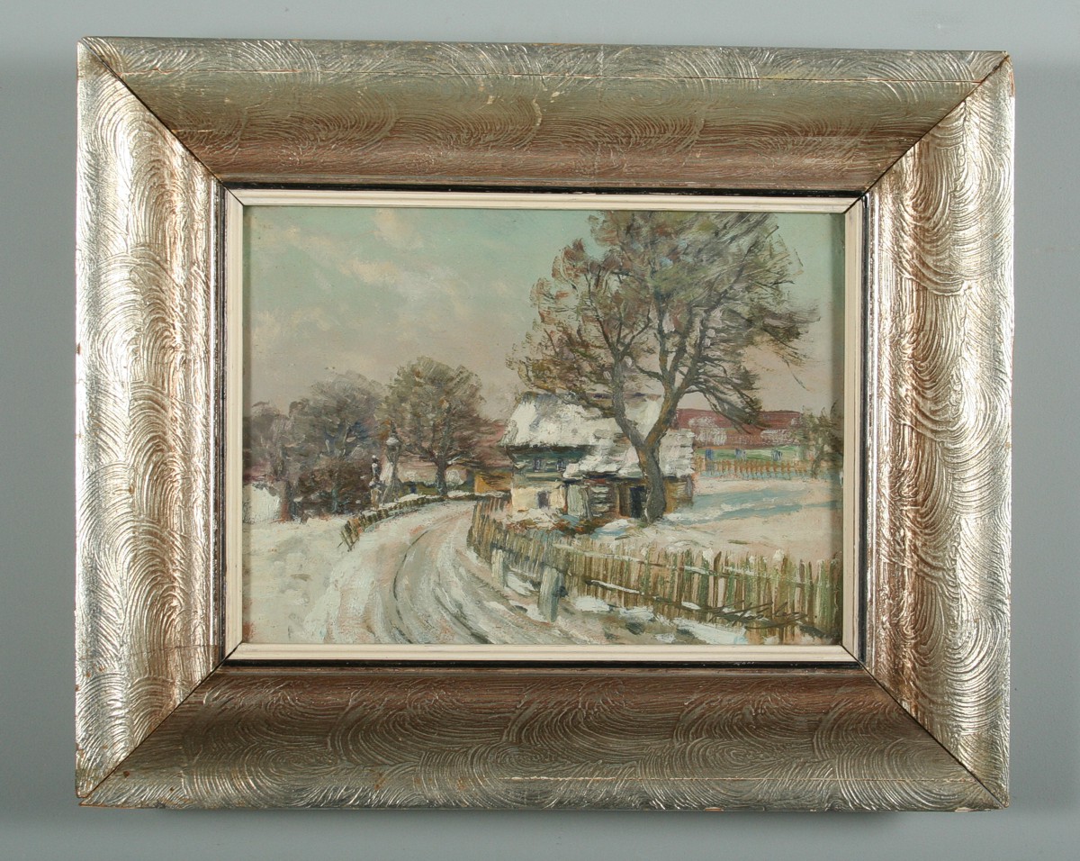 obraz zimy u Nové Paky, olej na lepence, 24 x 32 cm, s rámem 38 x 47 cm, autor Ferdinand Tásler, podepsáno vpravo dole F. Tásler, vzadu přípis "Česká Proseč", rámováno v původním stříbřeném rámu pod sklem
