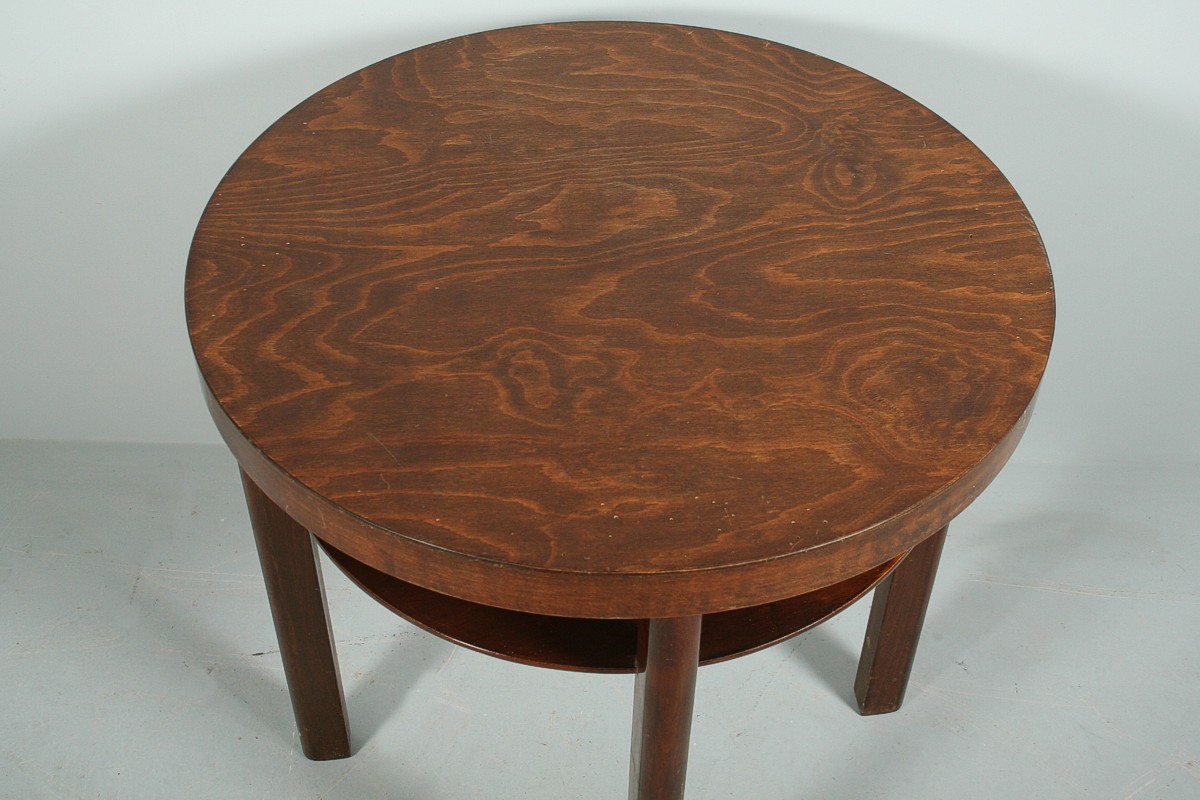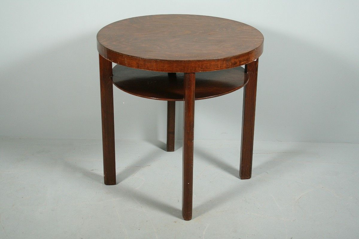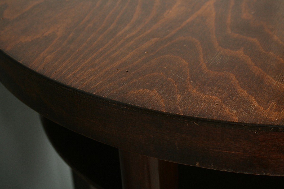 kulatý stolek v moderním vzhledu z 30. let 20. století, mořené a lakované dřevo, značený papírovou známkou Thonet F-48, zcela původní stav sem tam dítky po škůdci, 70 x 69,5 cm