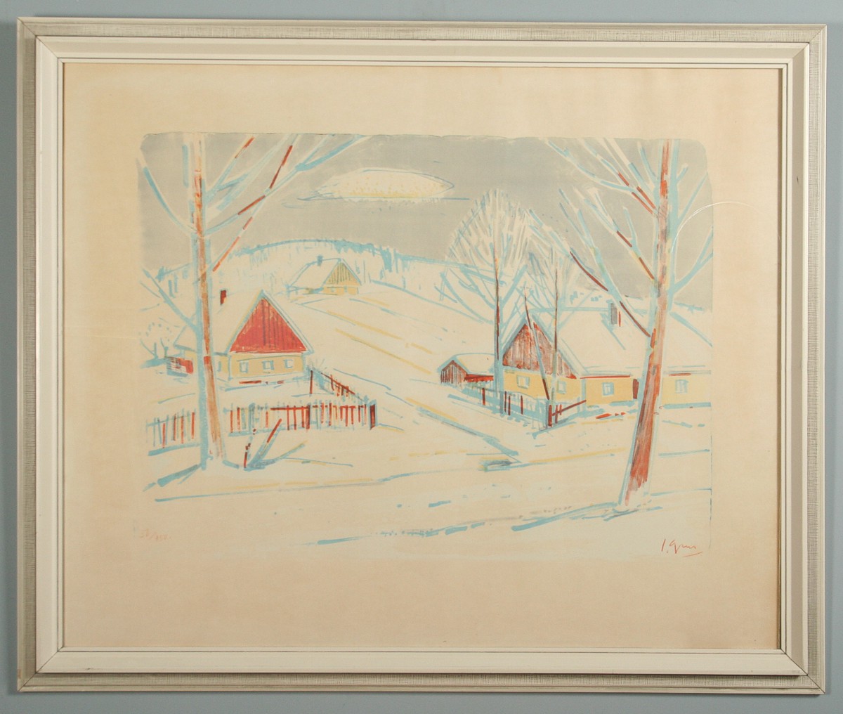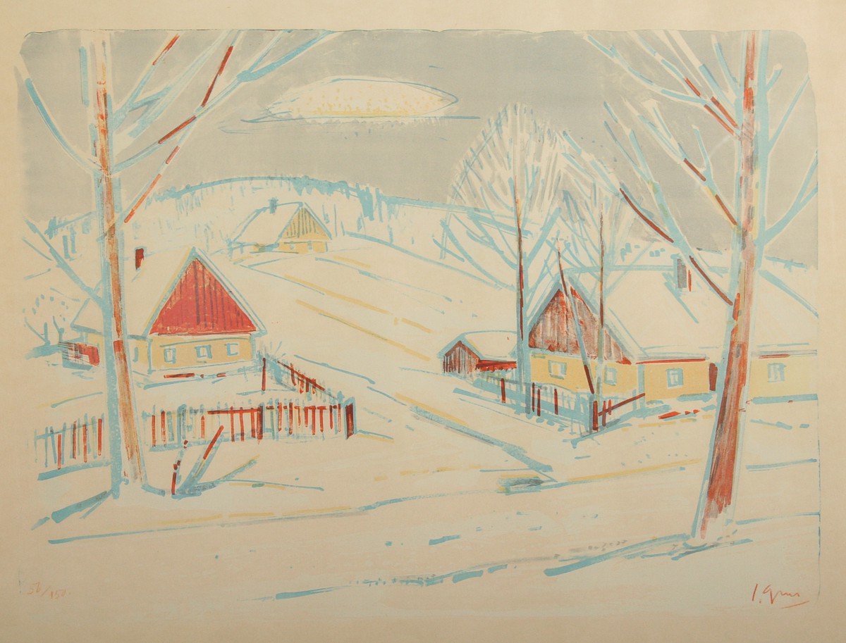 obraz zimní krajiny s chalupami, barevná litografie na papíře, tisková plocha 44 x 59 cm s rámem 69 x 83 cm, autor Jaroslav Grus, podepsáno vpravo dole červeně J. Grus, rámováno v původním rámu pod sklem
