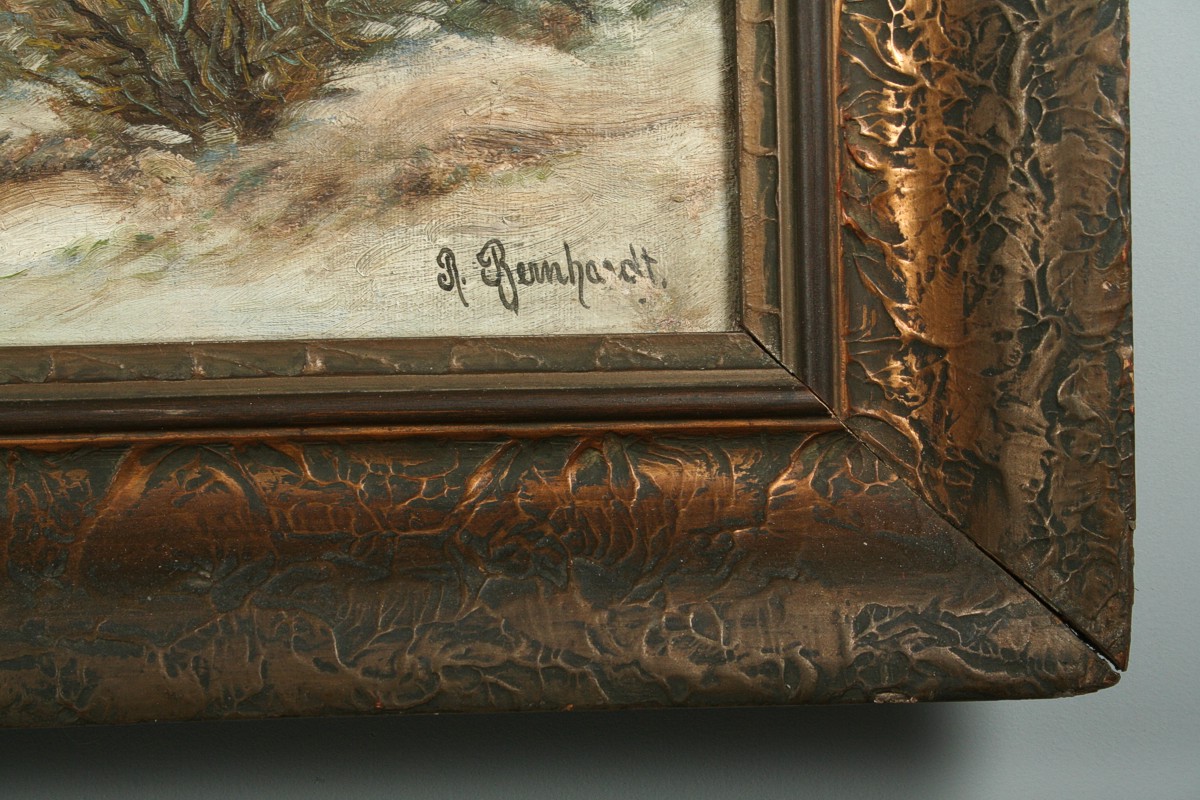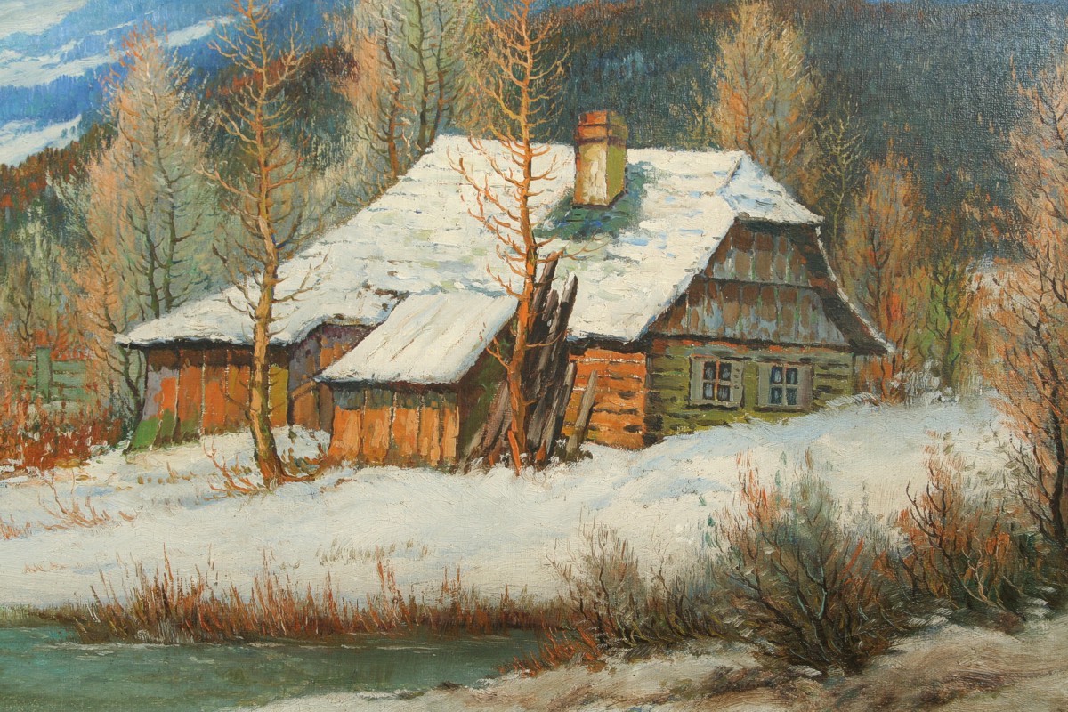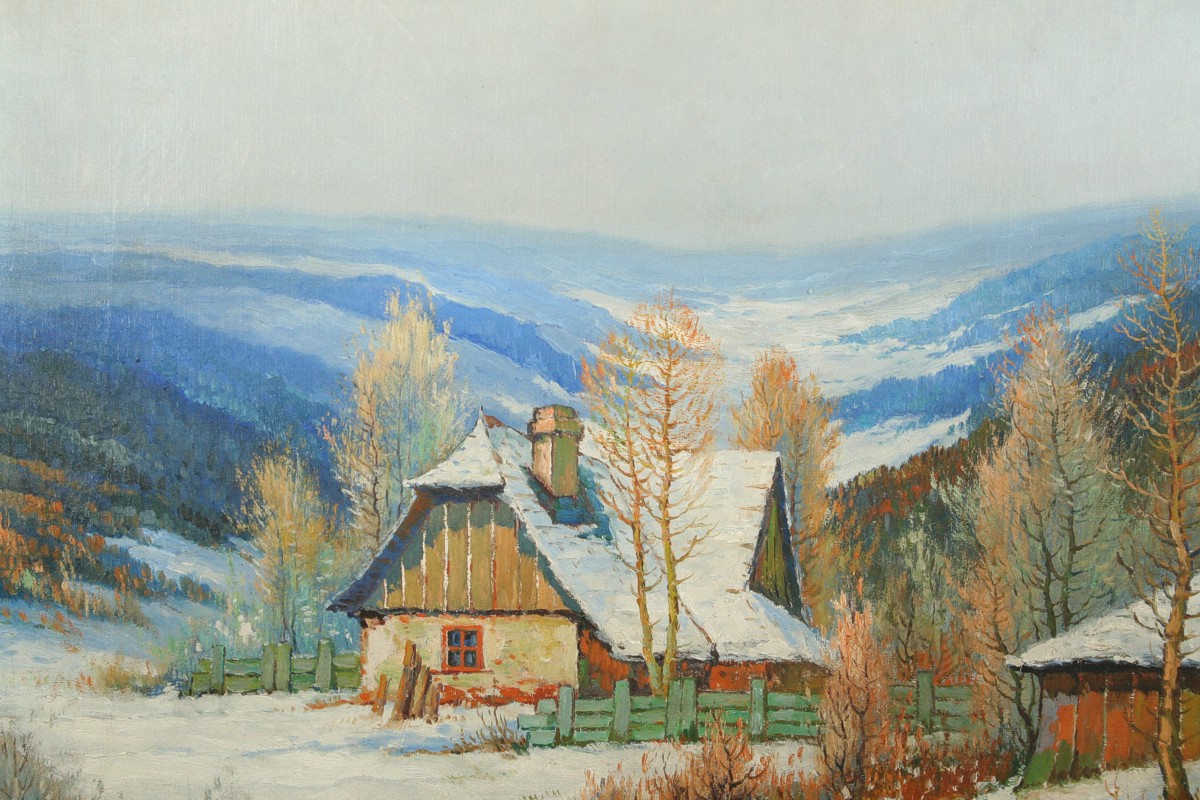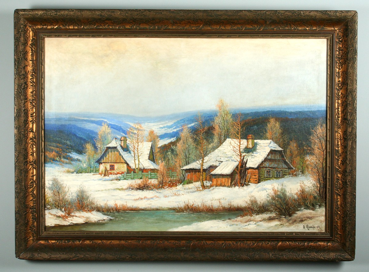 obraz krajiny s chalupami, olej na plátně 67 x 97 cm s rámem 84 x 114 cm, autor Rudolf Bernhardt, podepsáno vpravo dole R. Bernhardt, rámováno v původním rámu