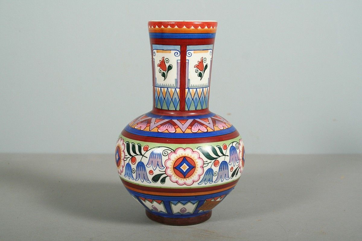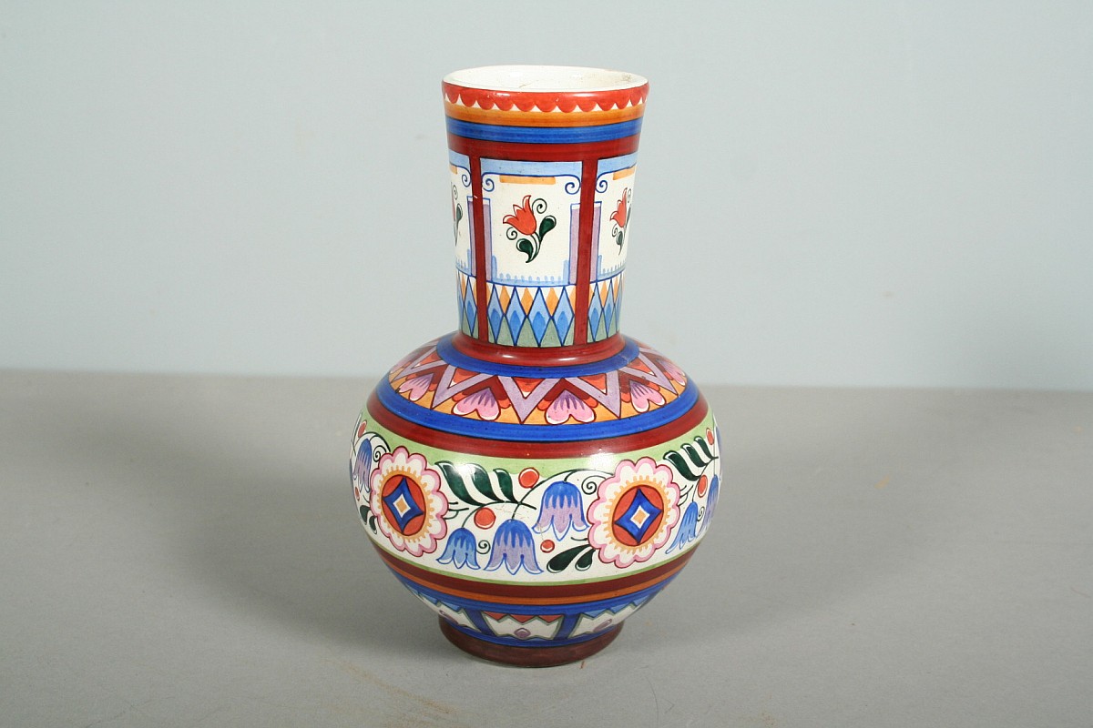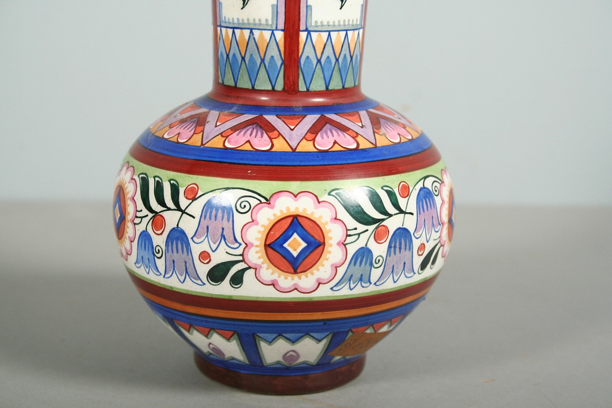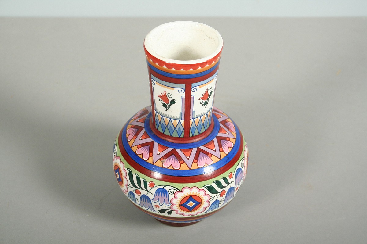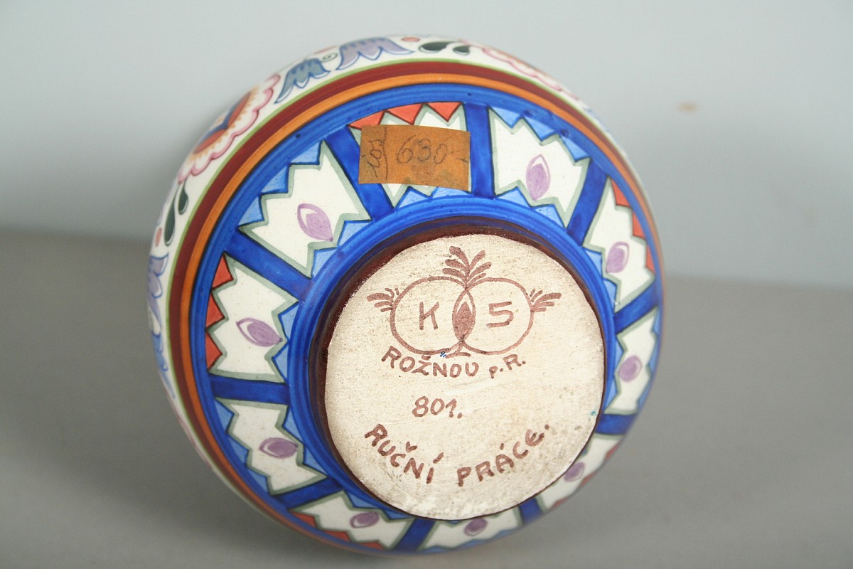 keramická váza s malovaným dekorem, autor Karel Solařík, značeno na dně Rožnov pod Radhoštěm, zboku původní štítek patrně z prodejny, bez poškození, 16,5 cm