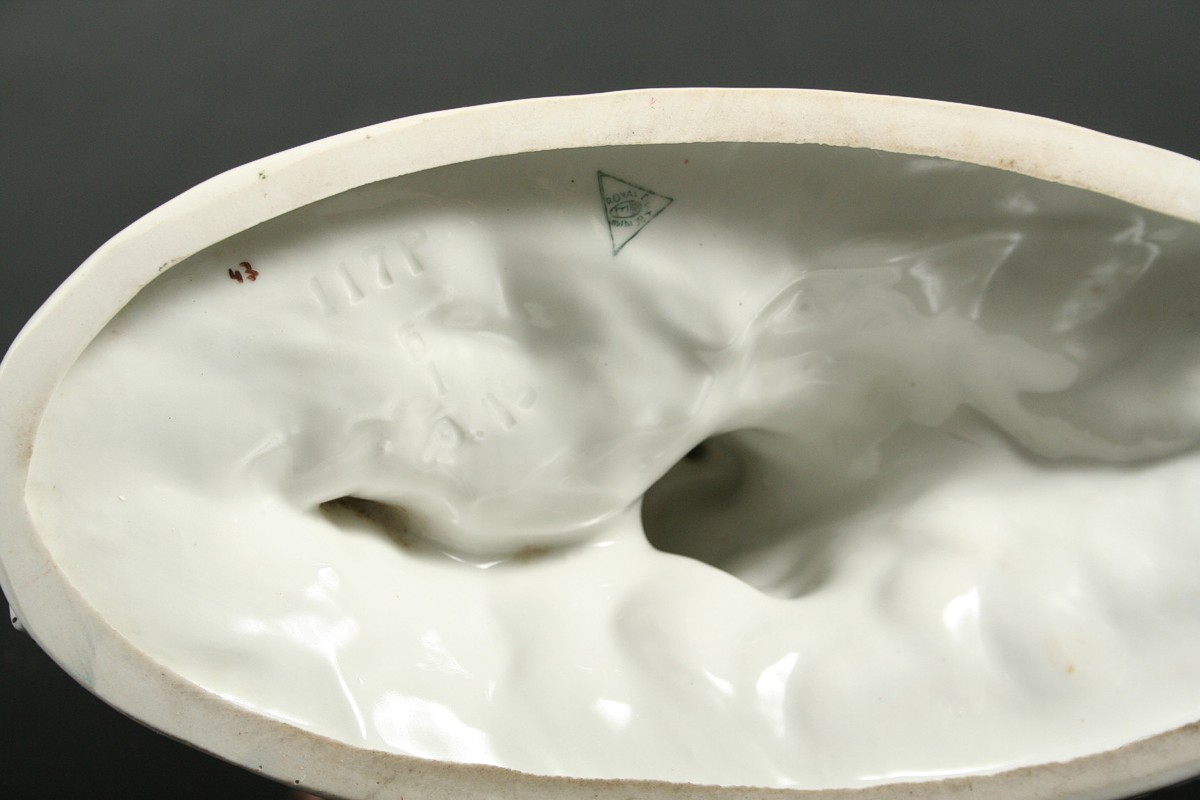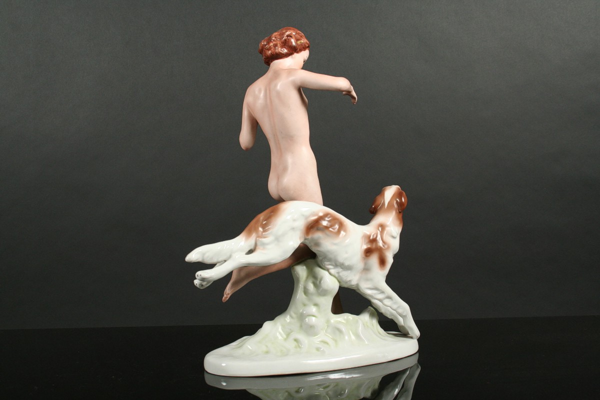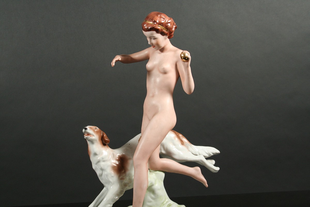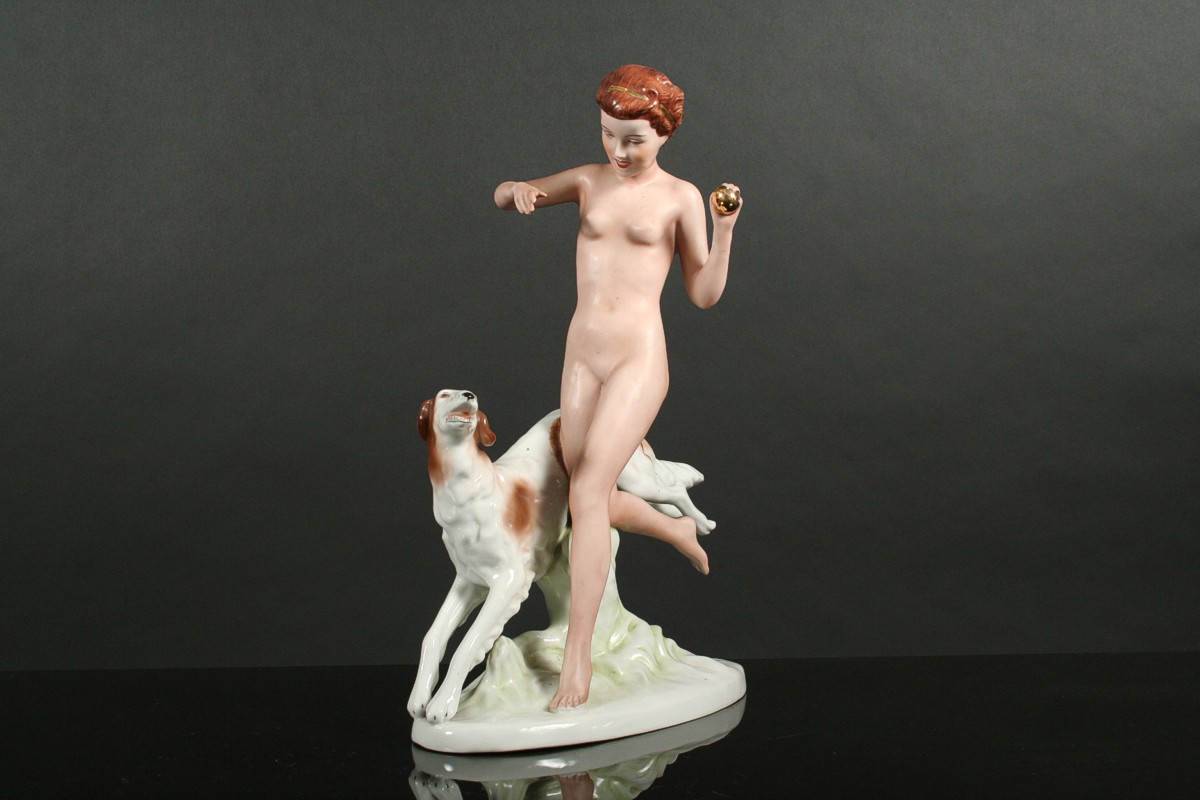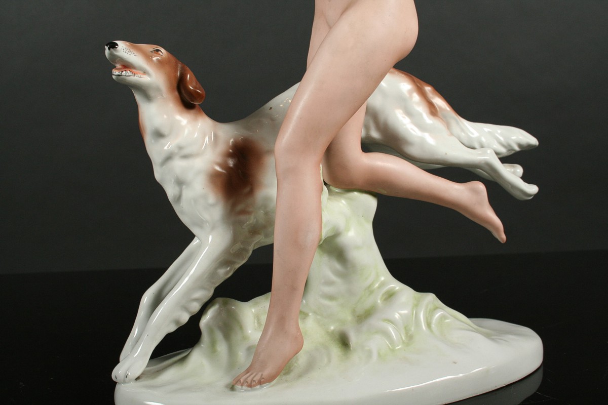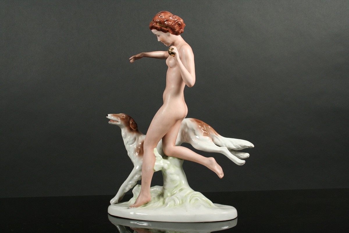 sousoší, dívčí akt s chrtem, porcelán bílý malovaný tělovou barvou a zlacením, na podstavě částečně vidět tlačený podpis Strobach–König, značeno tlačenými čísly a tištěnou značkou Royal DUX Duchcov, 35,5 x 27 cm