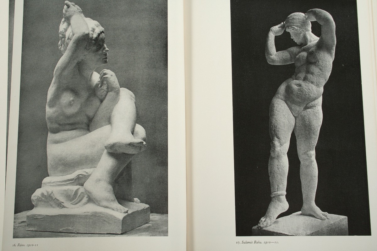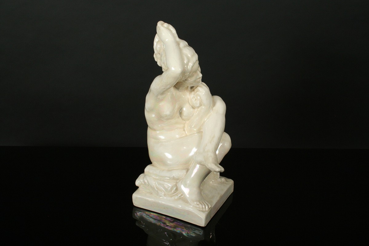 socha dívčího aktu při ranní toaletě nazvaná "Ráno", glazovaná keramika, autor Jan Štursa kolem roku 1910, neznačeno, drobné krakely v glazůře, 39,5 cm
