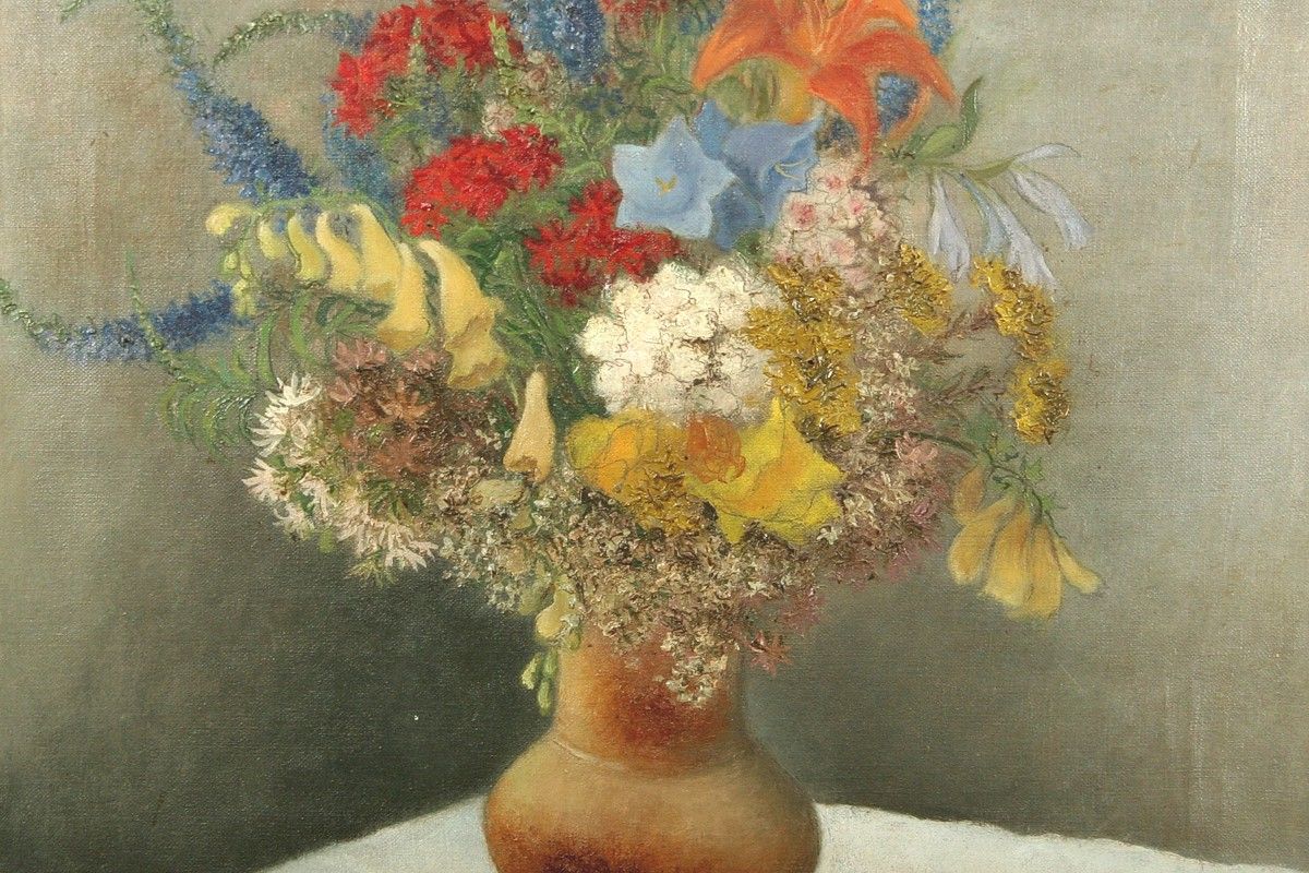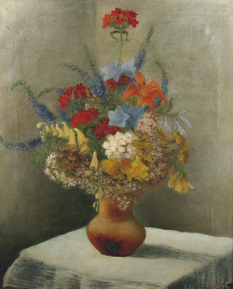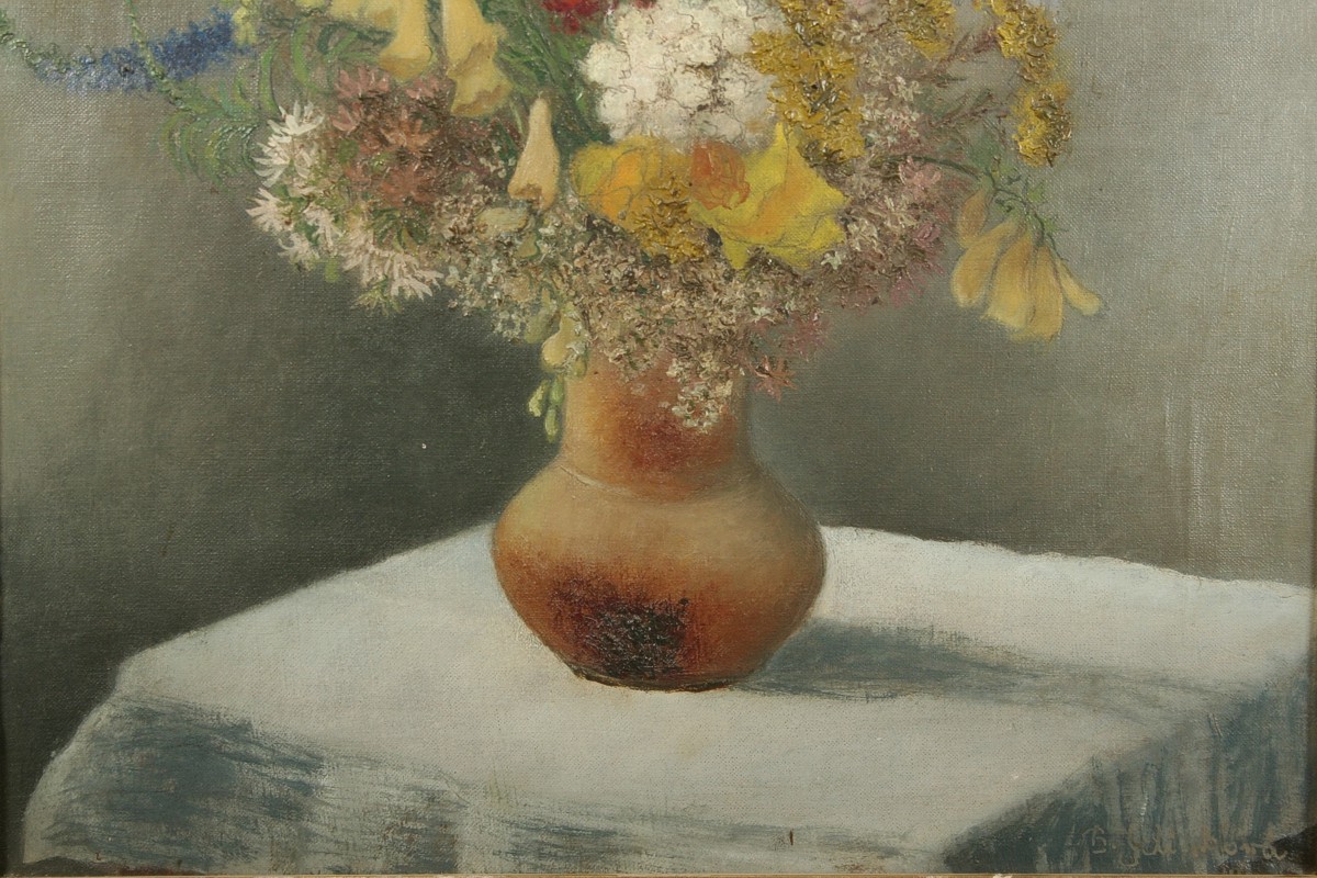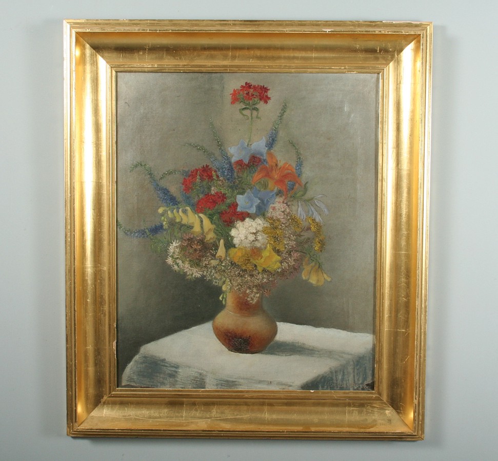 obraz kytice ve váze na stole, olej na plátně 60 x 50 cm s rámem 79 x 68 cm, autor Božena Jelínková, Jirásková, podepsáno v malbě vpravo dole B. Jelínková, rámováno ve zlaceném rámu